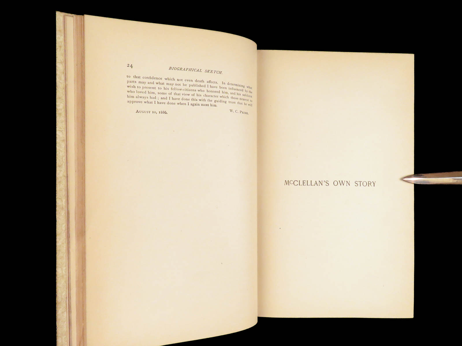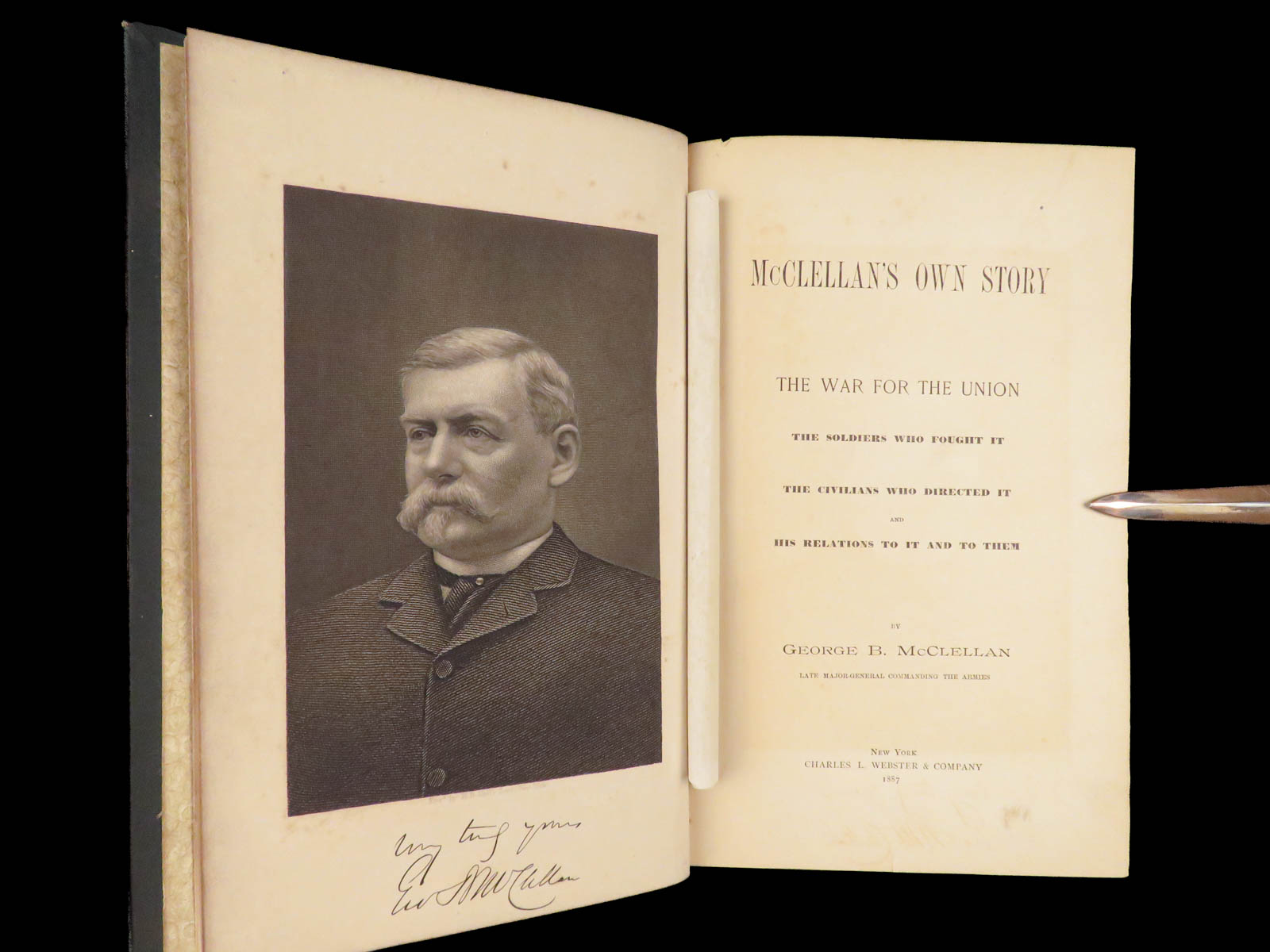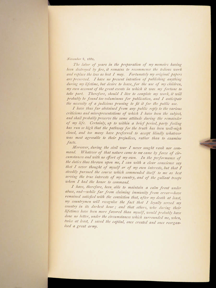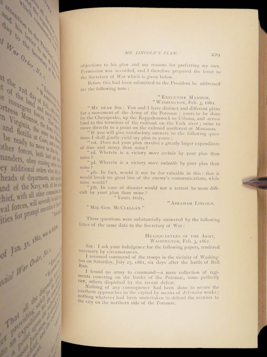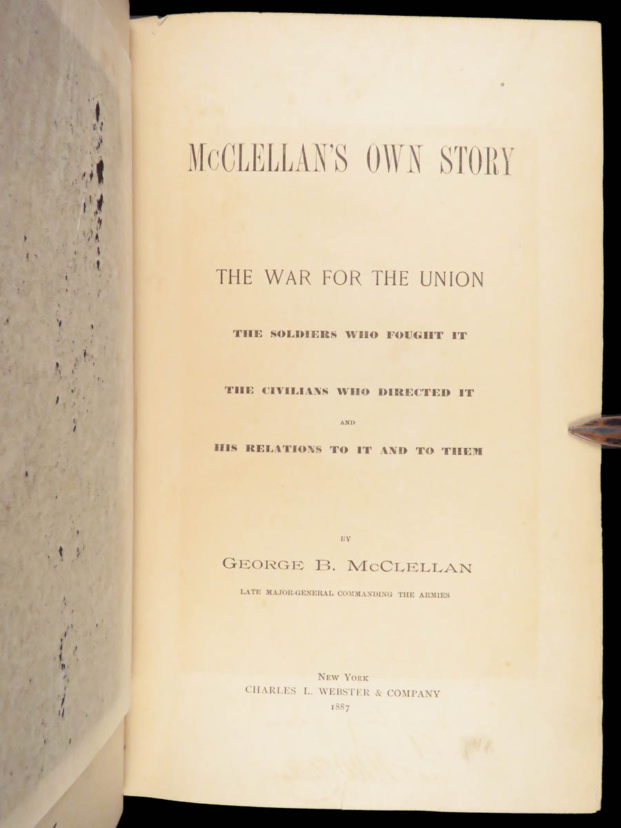 First edition of McClellan’s 1887 memoir, including his Civil War views, letters to his wife, and correspondence with Lincoln, noted in key bibliographies for its place in Civil War literature.