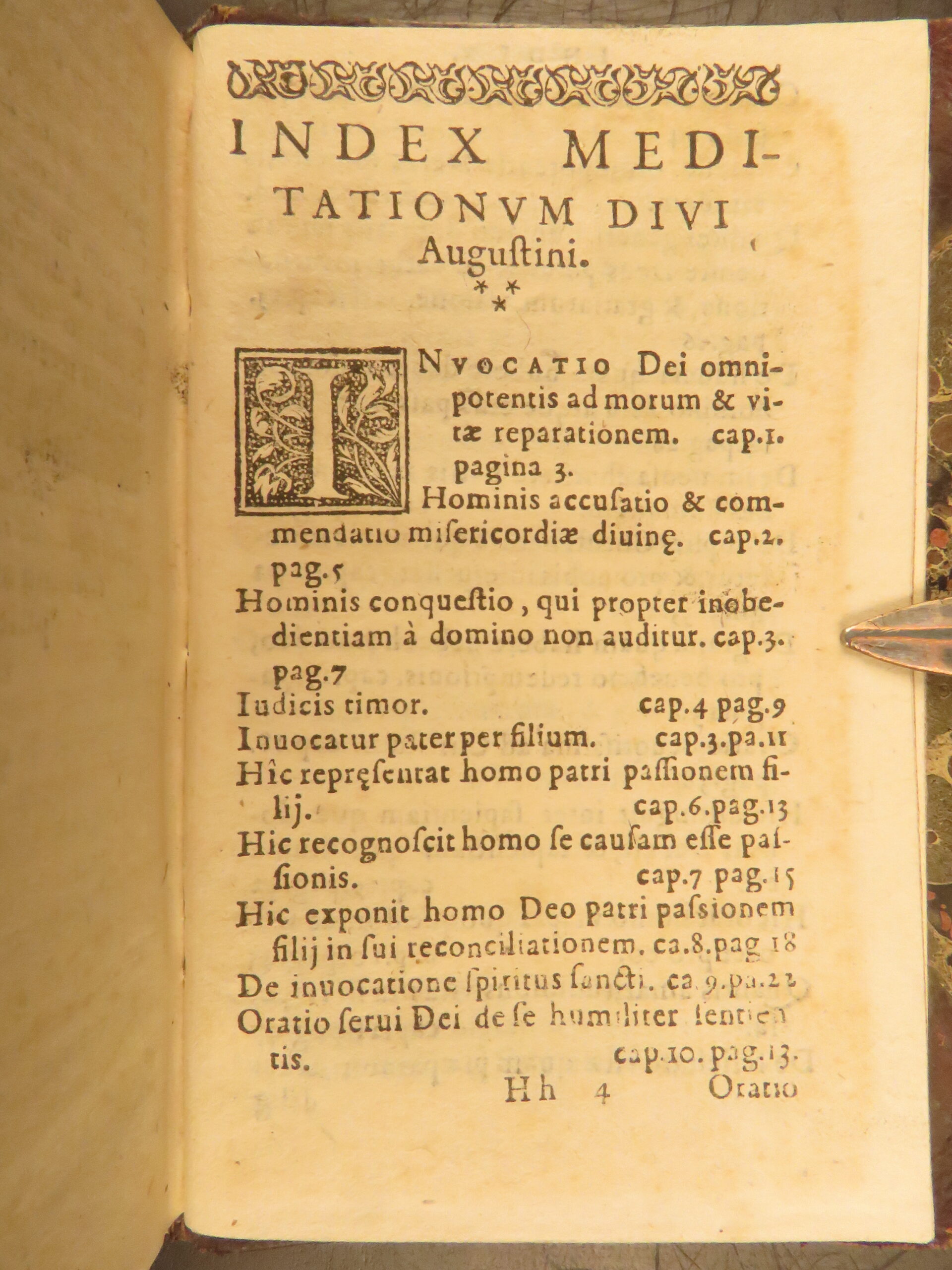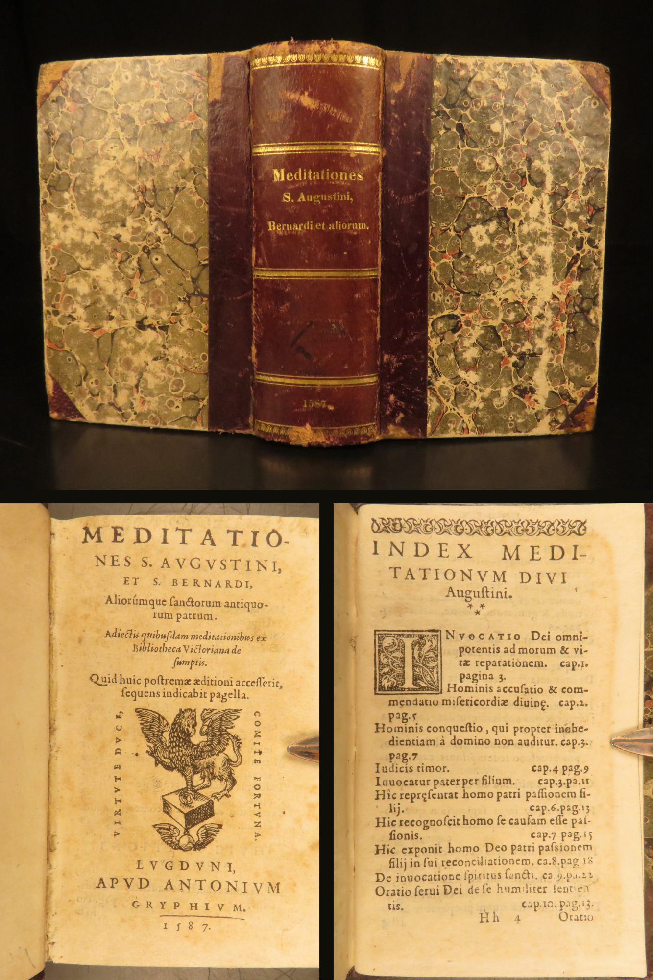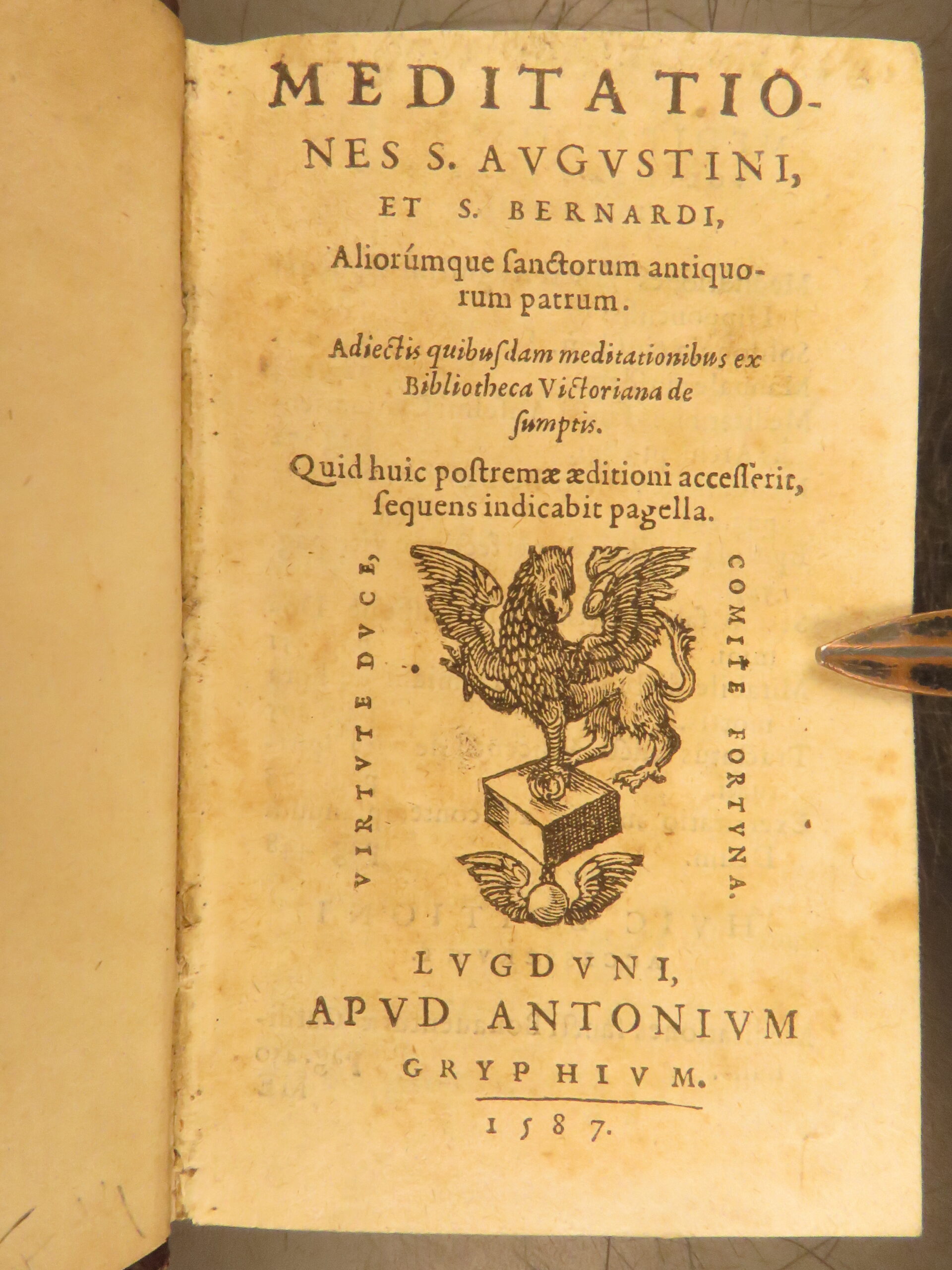 Meditationes S. Augustini et S. Bernardi, aliorumque sanctorum antiquorum patrum is a 1587 Catholic devotional containing early Christian meditations from Saint Augustine of Hippo and Saint Bernard of Clairvaux. Pritned at the height of the Catholic Reformation, this book also contains writings from Saint Bonaventure and Vincent Ferrar, published by Gryphe in Lyon.