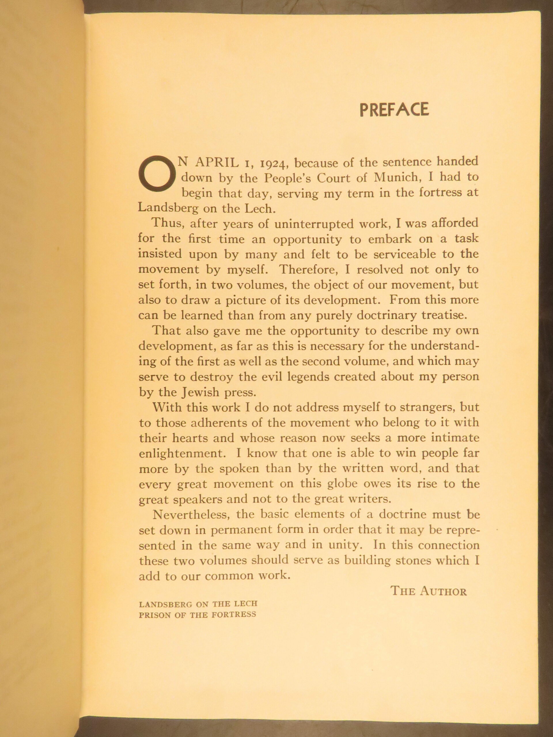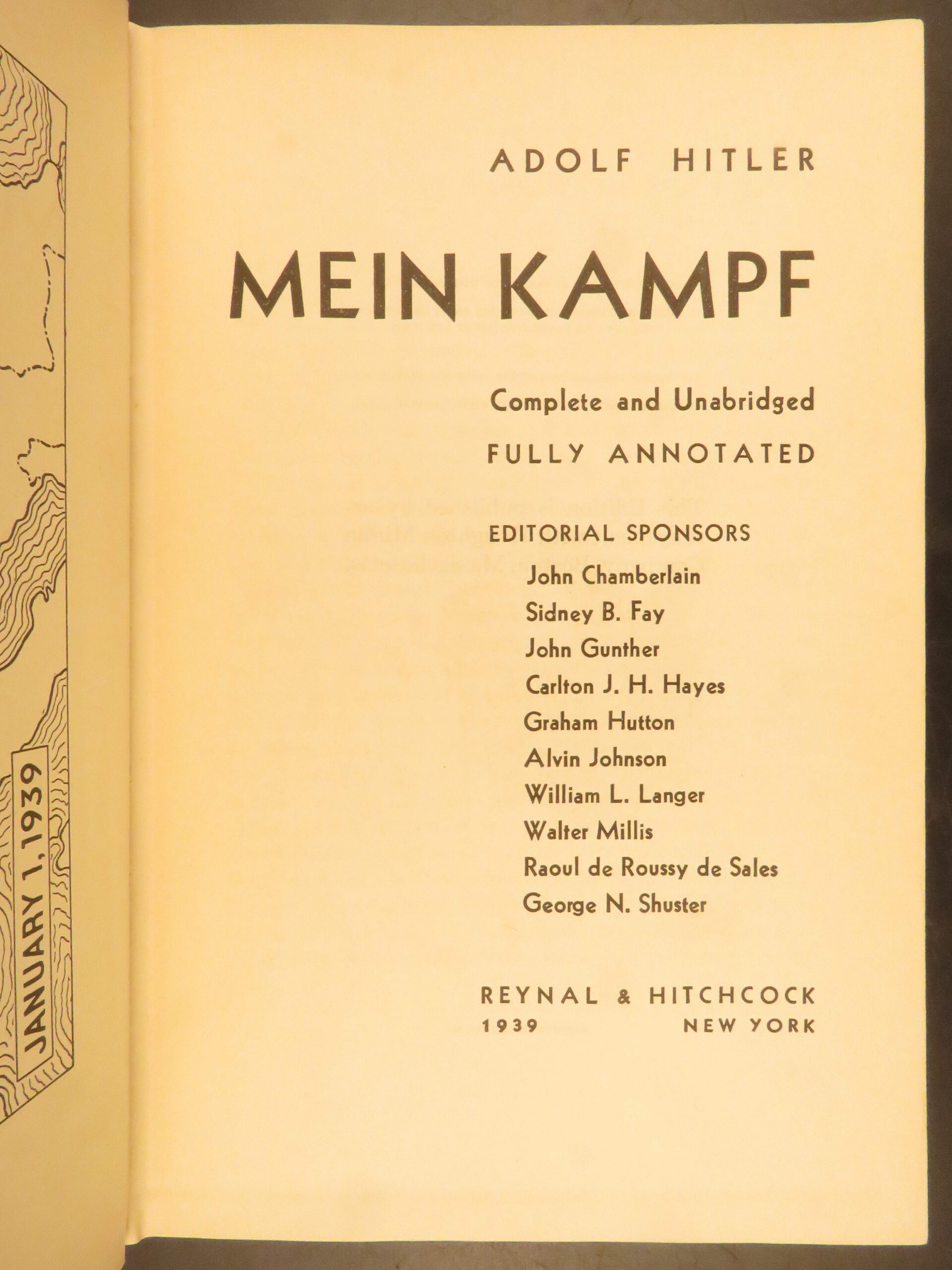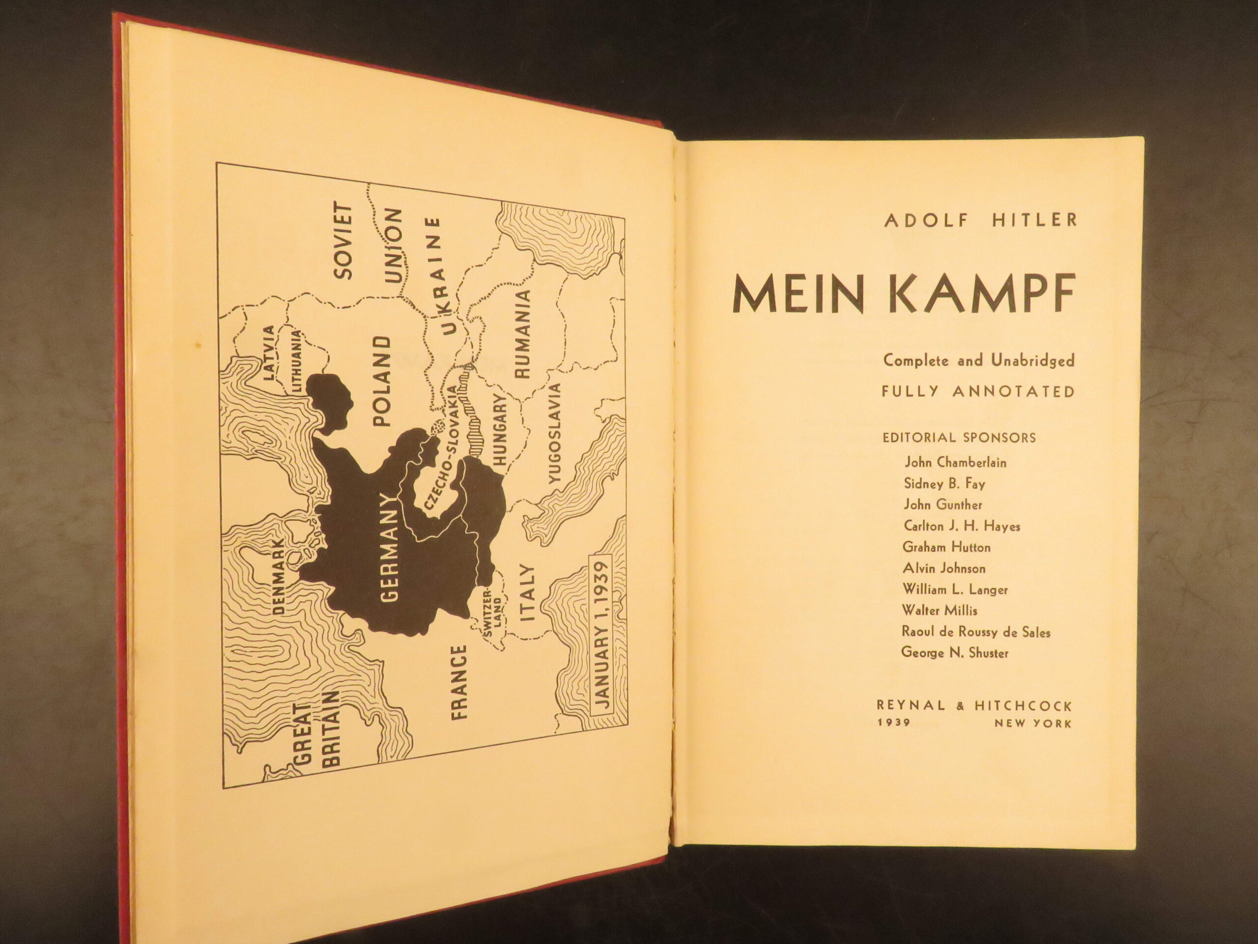 First American edition of Adolf Hitler’s Mein Kampf, 1939, unabridged and annotated, issued to acquaint U.S. readers with Nazi ideology and including a map of Europe.