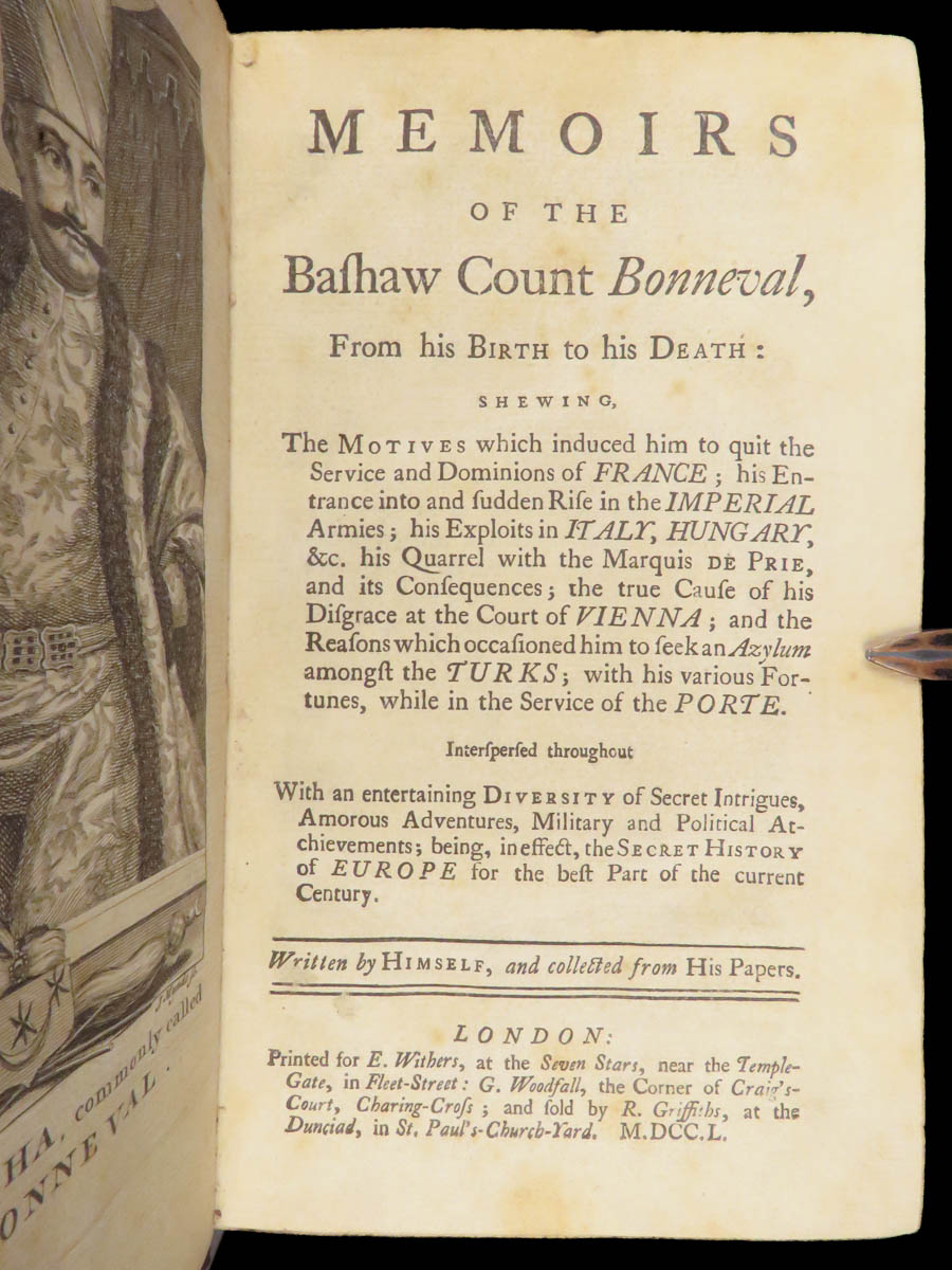 London-printed 1750 account of Claude Alexandre, Count of Bonneval, who entered Ottoman service as Humbaracı Ahmet Pasha, an uncommon biography reflecting European–Ottoman relations in the eighteenth century.