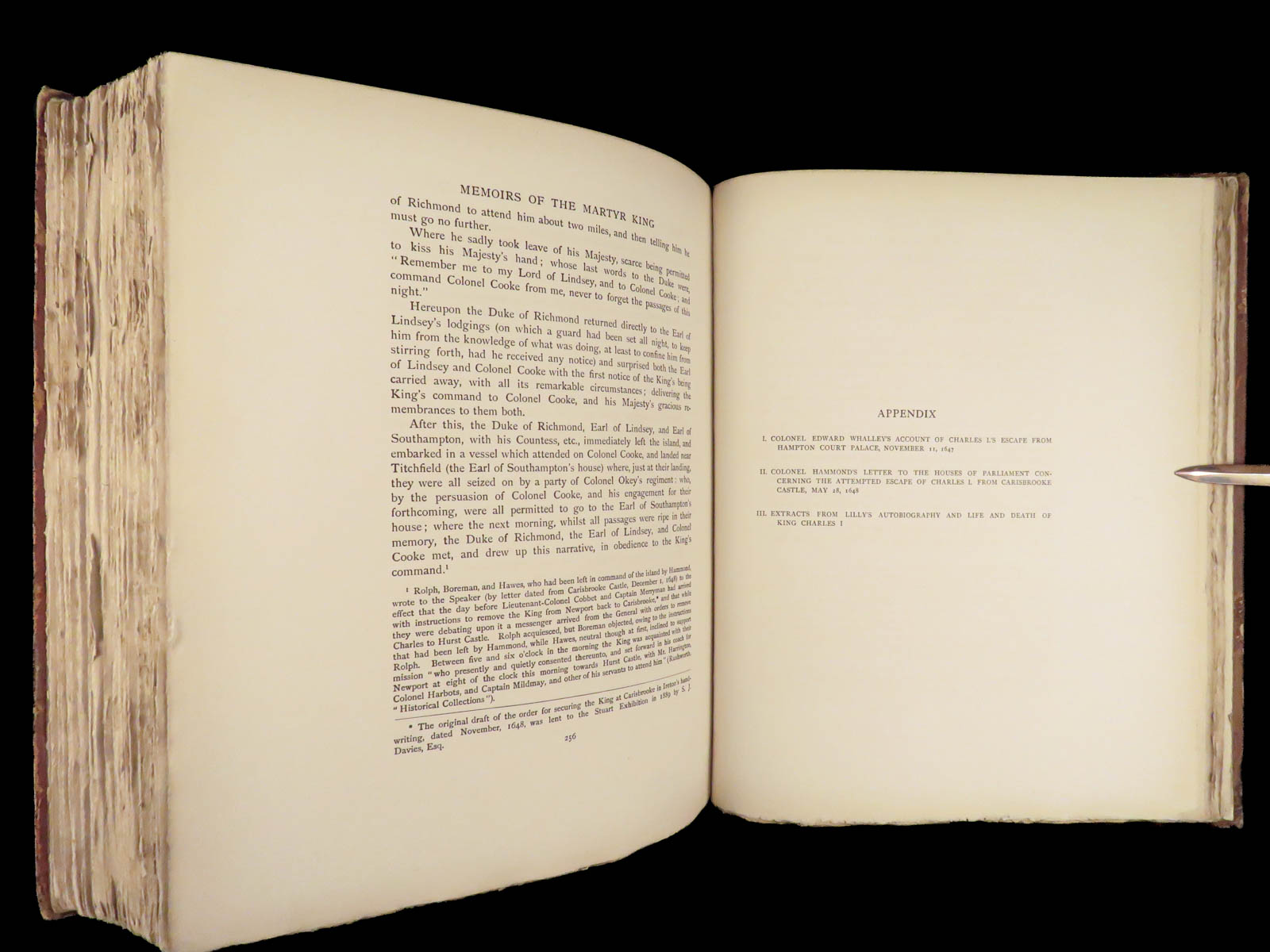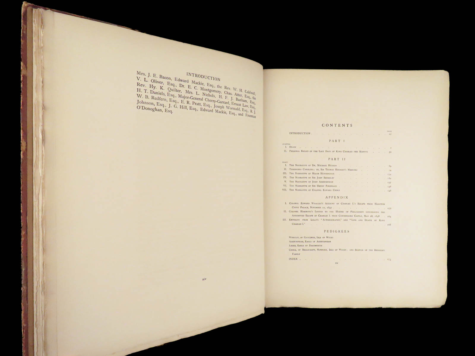 Memoirs of the Martyr King by Allan Fea is a rare first edition published in London in 1905 by John Lane. This large folio volume brings together narratives and documents relating to the final years, trial, and downfall of King Charles I of England. Noteworthy for its scale and presentation, the book stands out for its finely bound leather covers with elaborate gilt tooling and its extensive illustrated content. The work includes thirty-nine engraved portraits of central figures from the Stuart period, among them Charles I, Queen Henrietta Maria, Oliver Cromwell, Anne Lady Fanshawe, James Stuart, and Princess Elizabeth, alongside architectural engravings of significant English sites. Within its text are accounts by Major Huntington, Sir John Berkeley, John Ashburnham, Sir Henry Firebrace, and Colonel Edward Cooke, all of whom were directly connected to events surrounding the king’s imprisonment and execution.