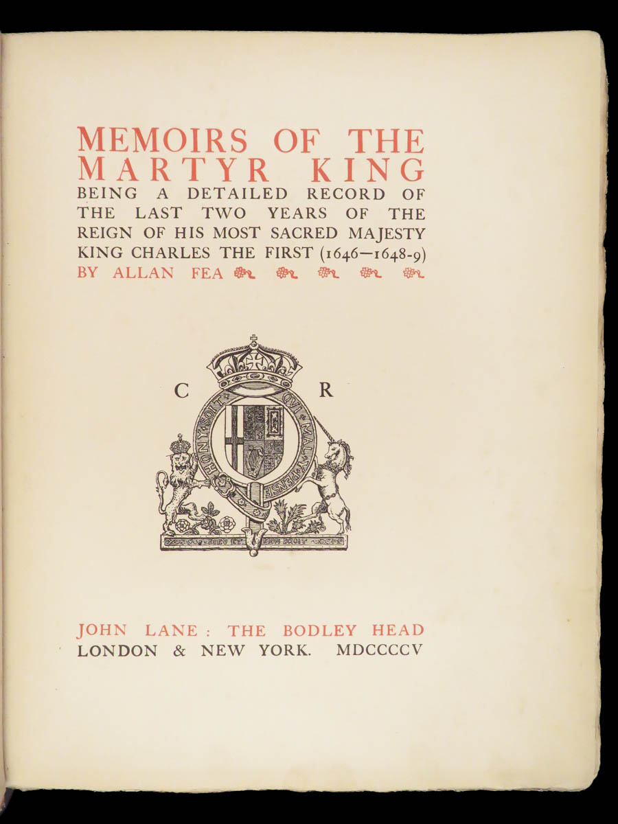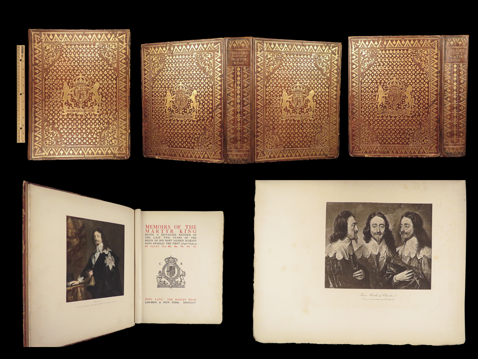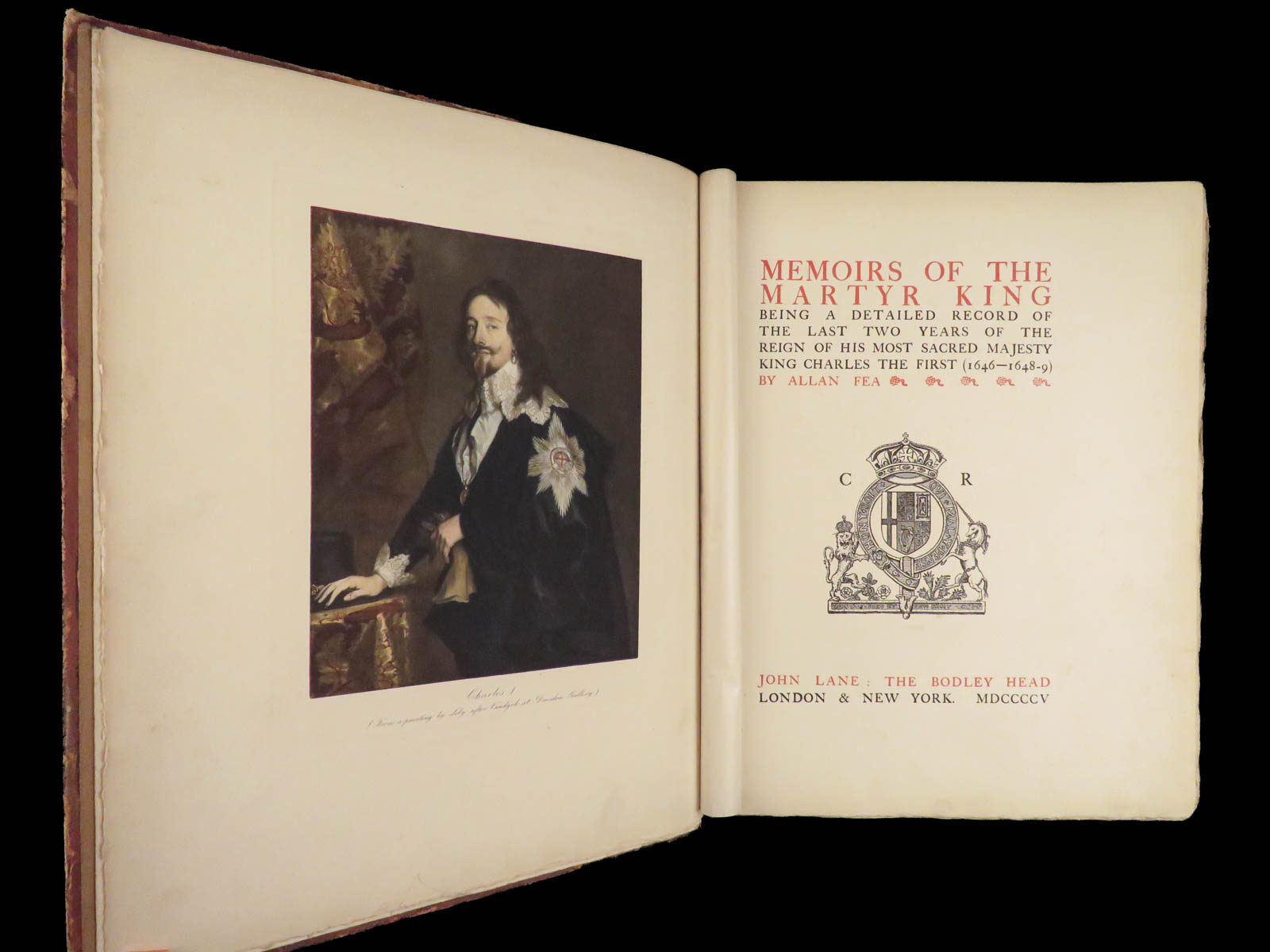 Memoirs of the martyr king charles i – allan fea – 1905 | first edition, portraits & find binding | allan fea’s memoirs of the martyr king (1905 first edition) documents the final years of charles i, illustrated with 39 engraved portraits and bound in full gilt-tooled leather at impressive folio scale.