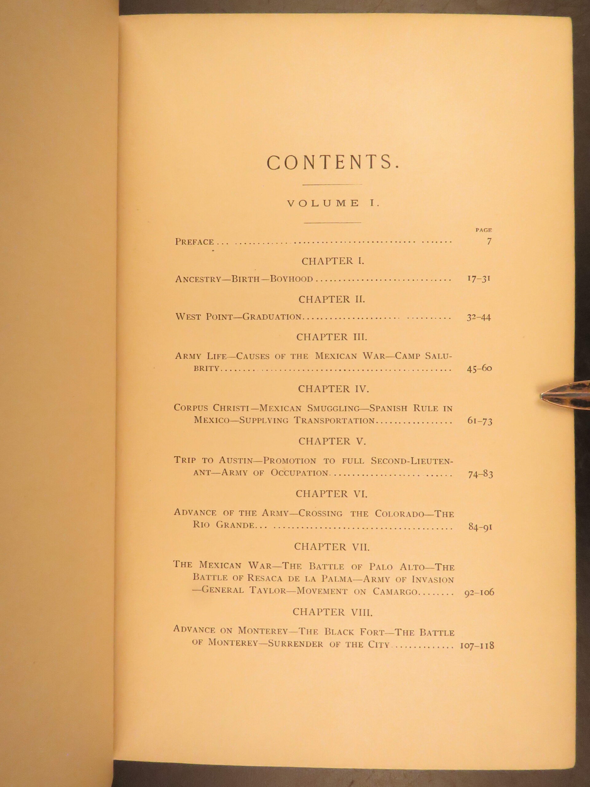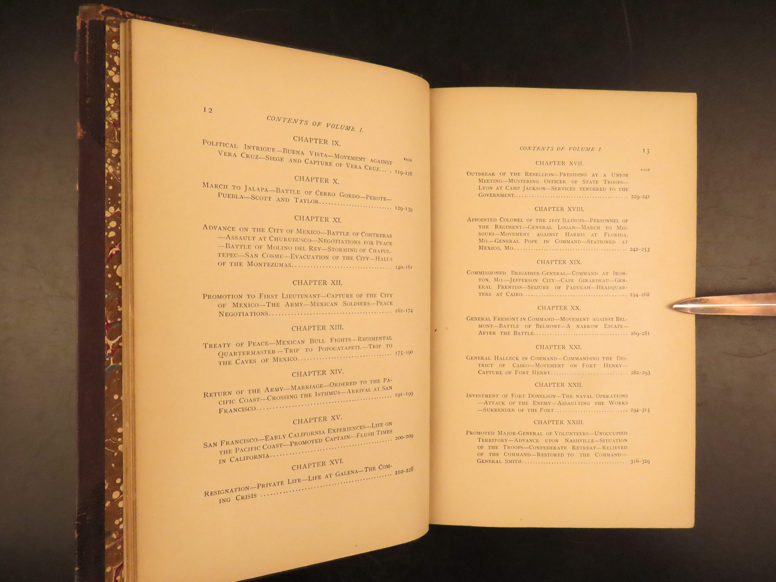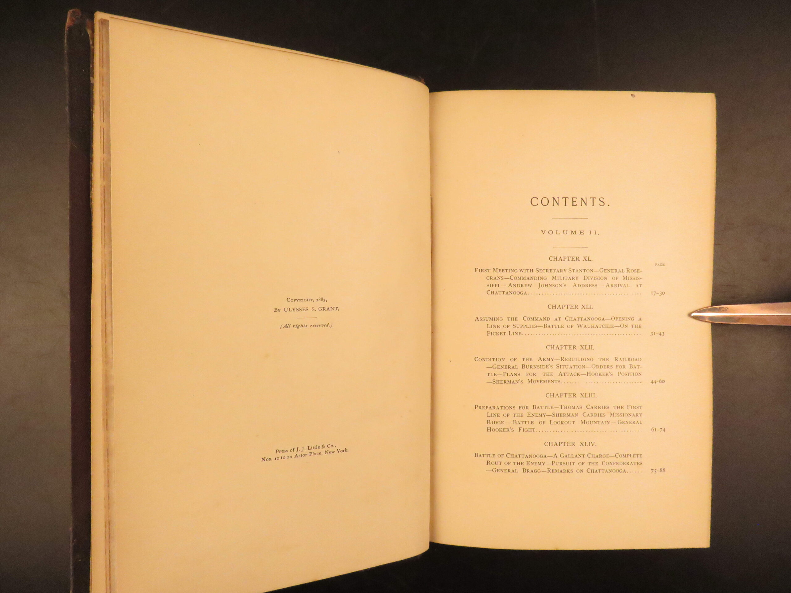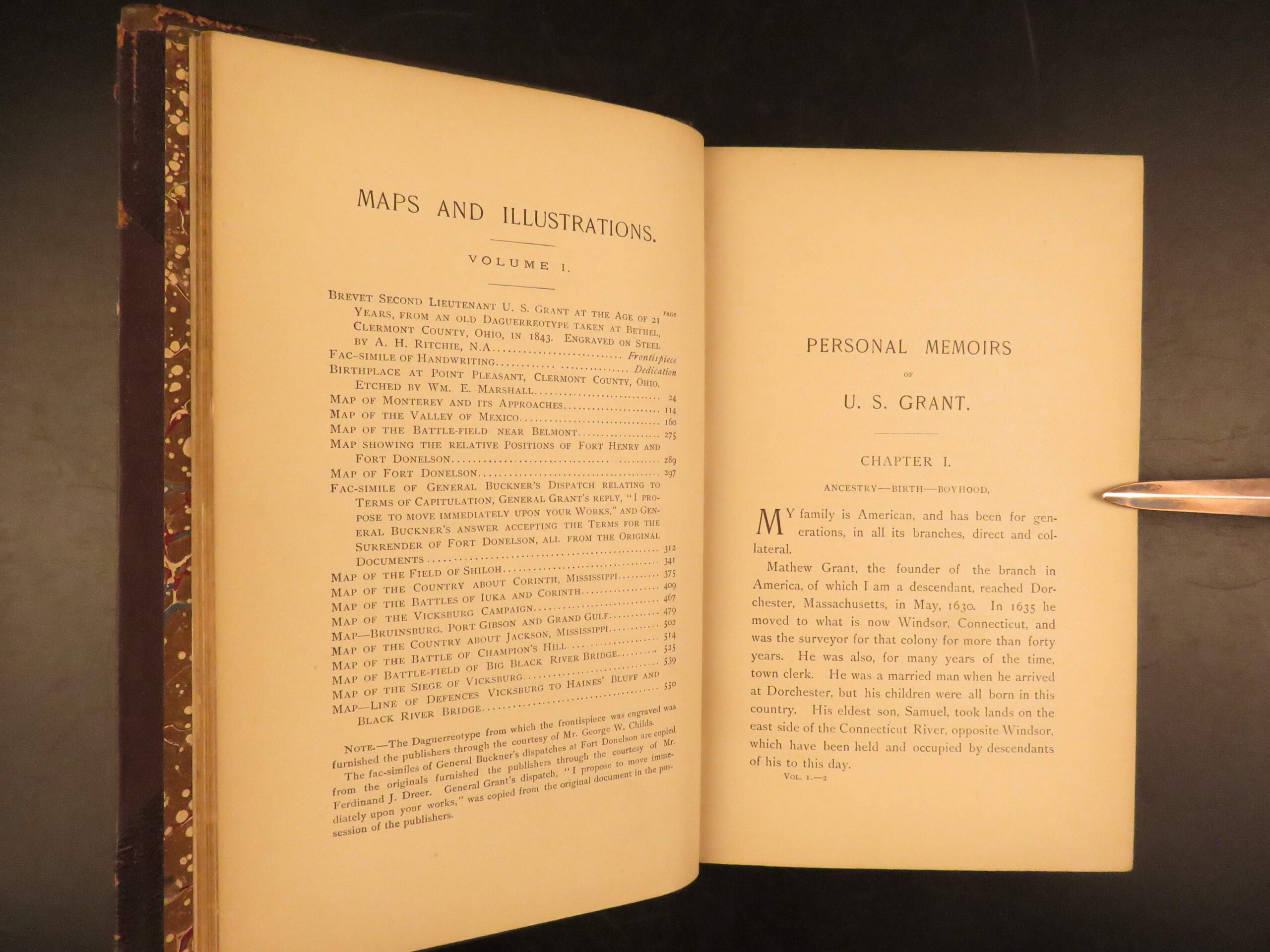 This first edition Personal Memoirs of U.S. Grant, printed in 1885–86 by Charles L. Webster & Co., presents the original two-volume publication authorized by Grant himself and completed during his terminal illness. The set was published under the oversight of Mark Twain and became a major commercial and historical success. The memoirs follow Grant through his military career, beginning with his service in the Mexican War through his rise to lieutenant general during the Civil War. The text is enhanced by numerous engraved portraits and battlefield maps detailing troop positions and movements during the war’s most famous campaigns.