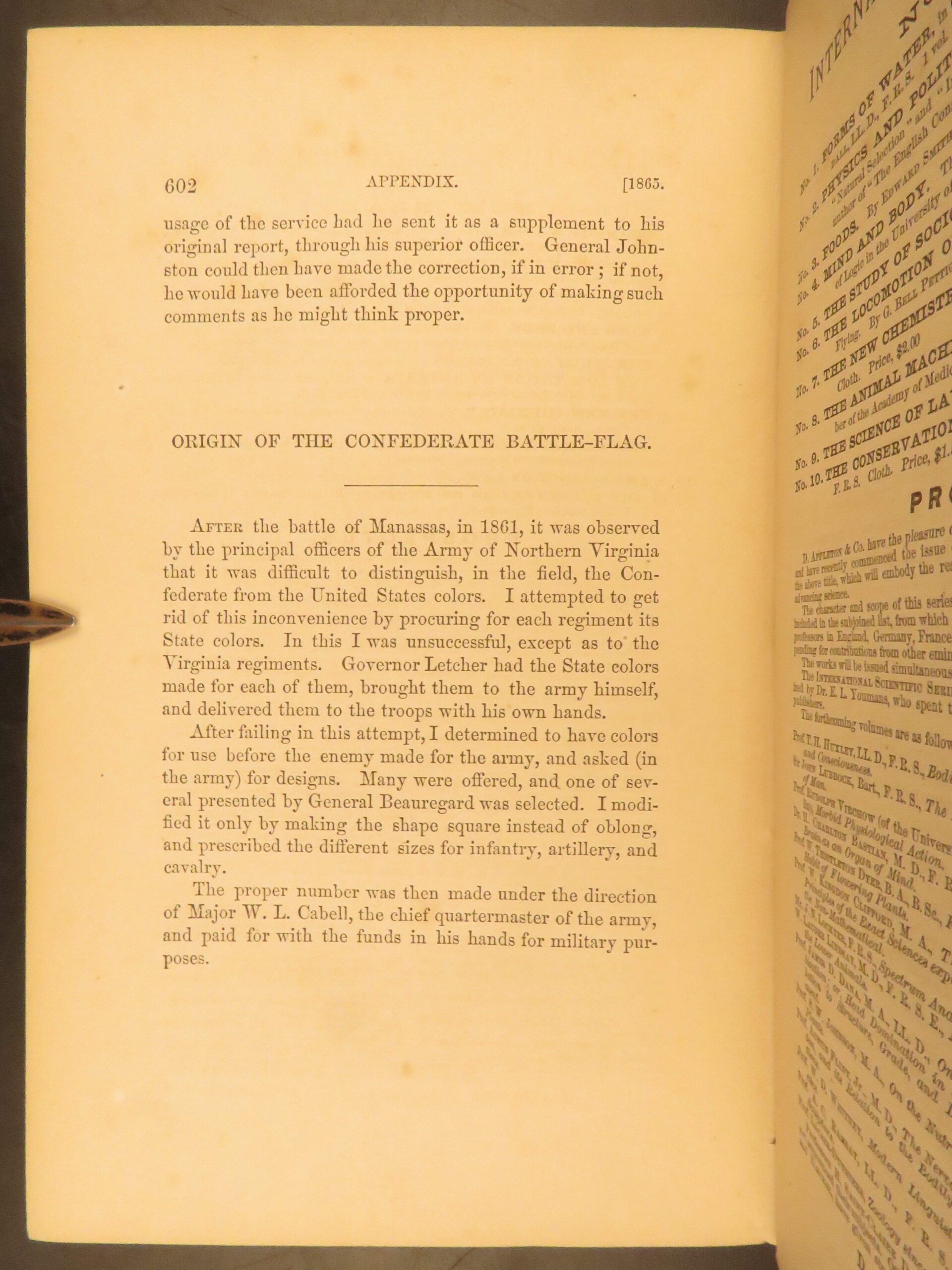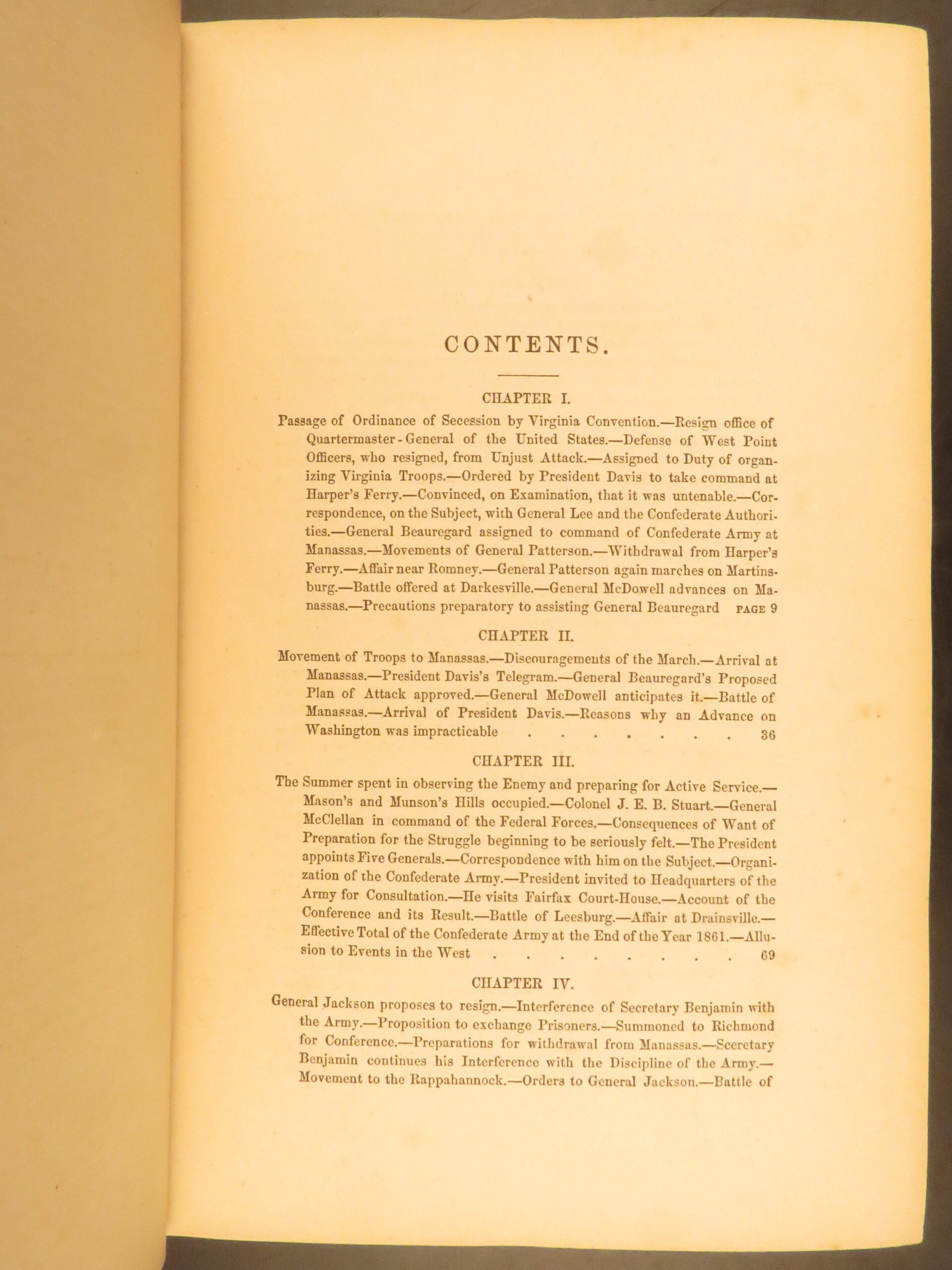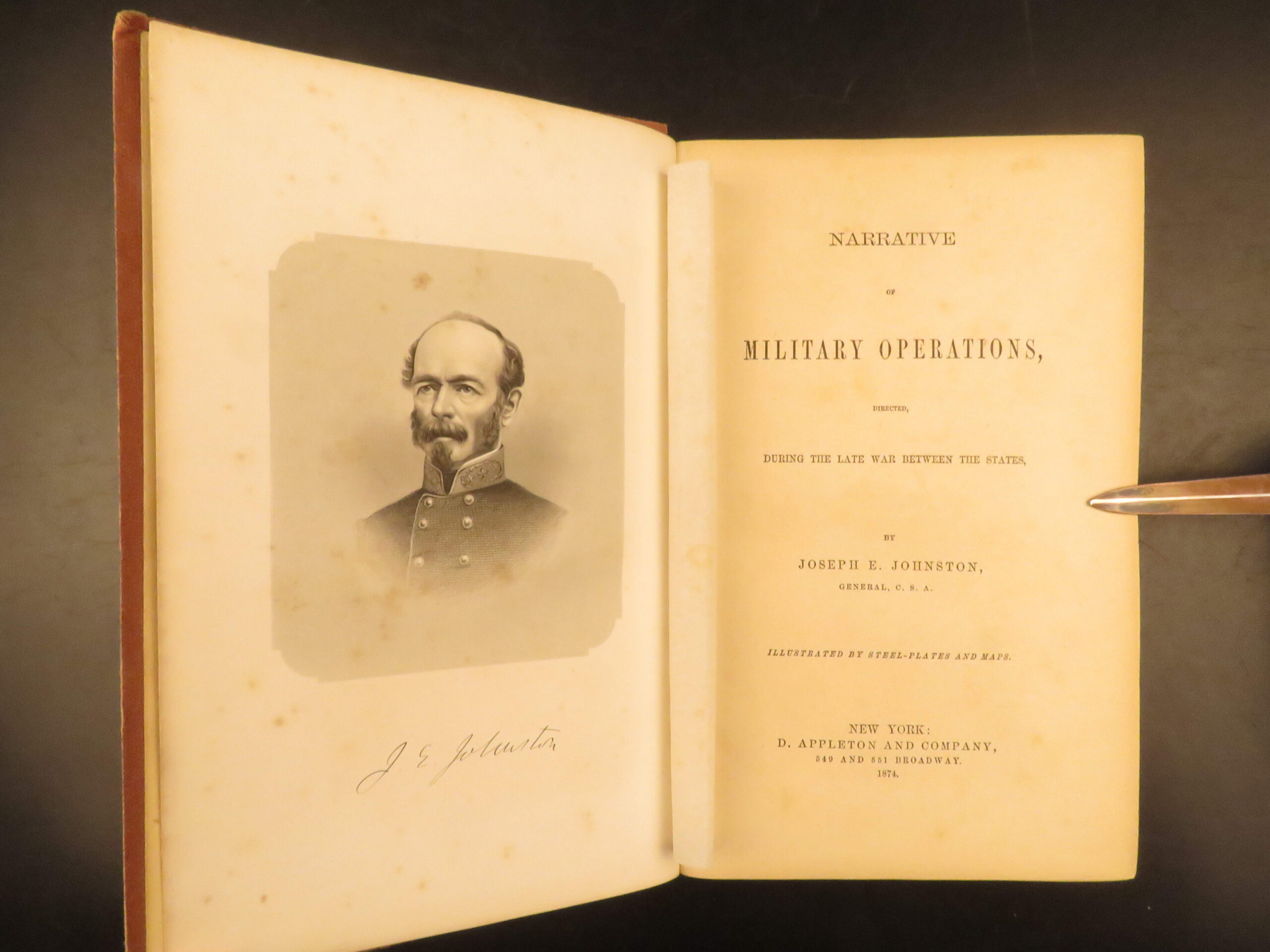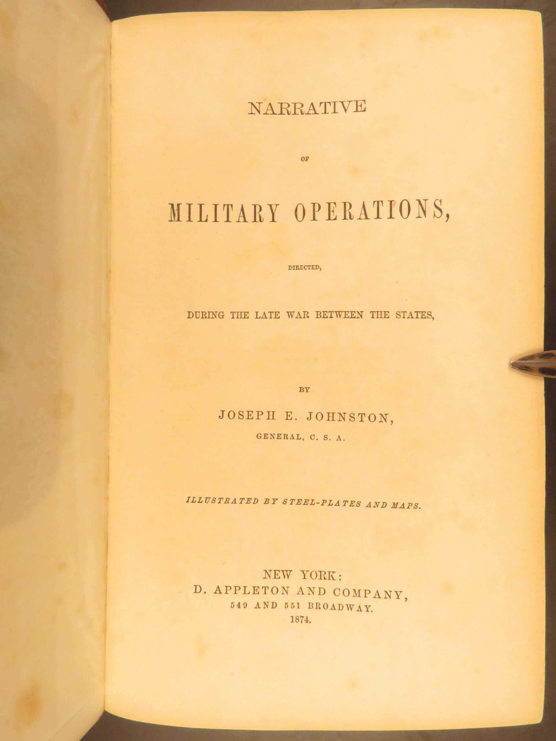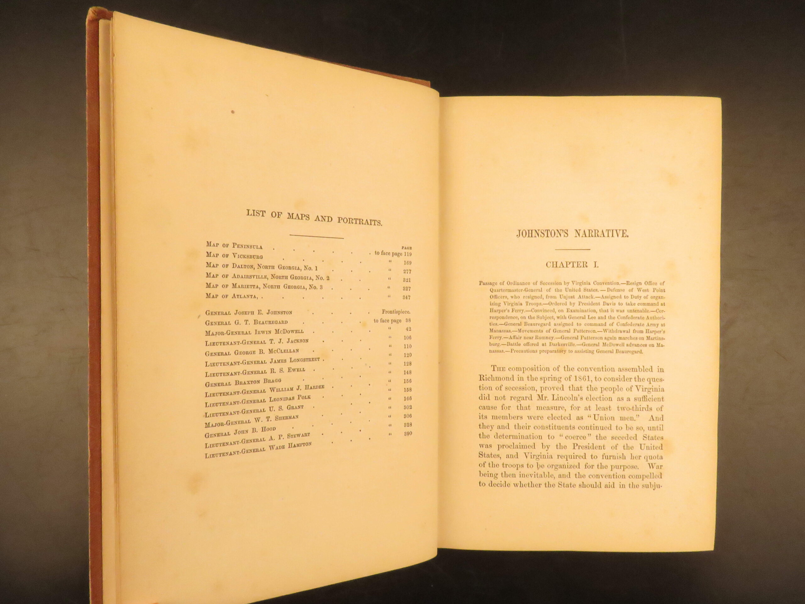 First edition of Joseph E. Johnston’s Civil War memoir printed in 1874, noted for its strong anti-Davis stance and inclusion of 21 engravings, including maps and portraits.