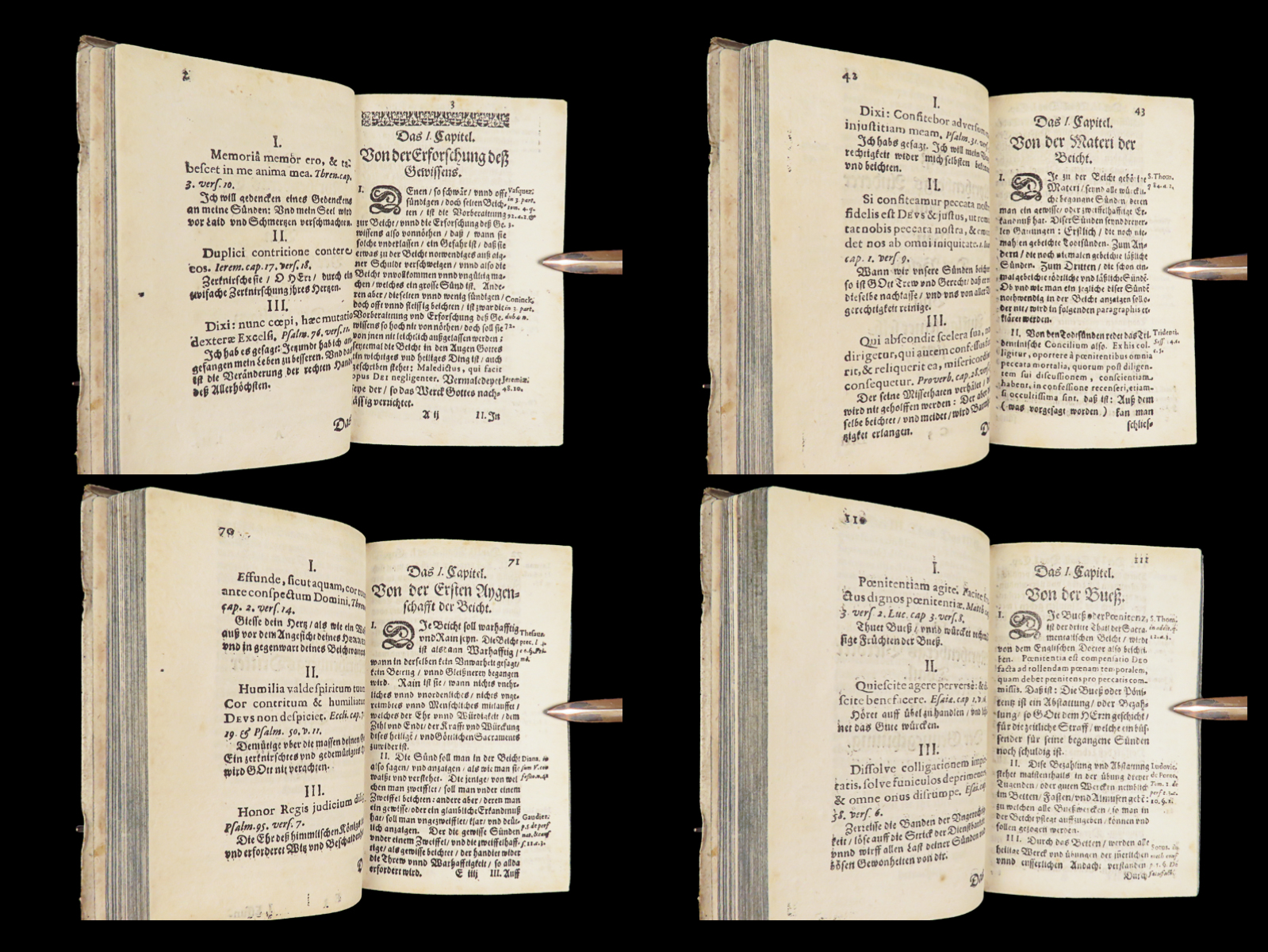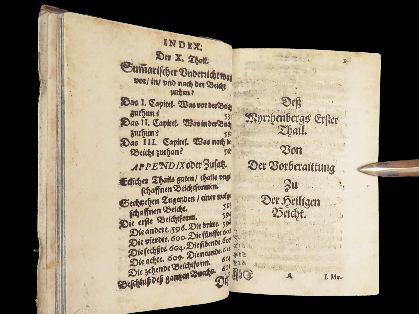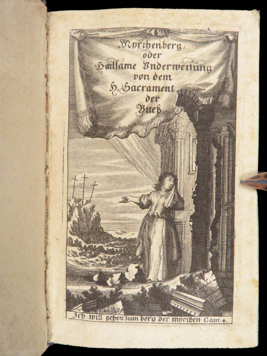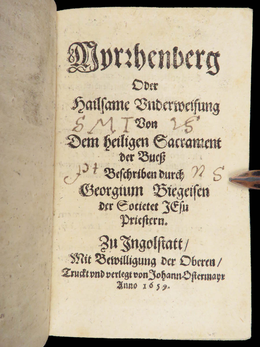 Myrzhenberg: Oder Hailsame underweisung von Dem heiligen Sacrament der Buess by Georg Biegeisen is a 1659 treatise devoted to the theology of penance. Biegeisen wrote from a Lutheran perspective comparing how  Lutheran penance varies from the Catholic traditions. Interestingly, Ingolstadt, the publishing city, was known for its Catholic traditions, not for publishing Protestant texts.