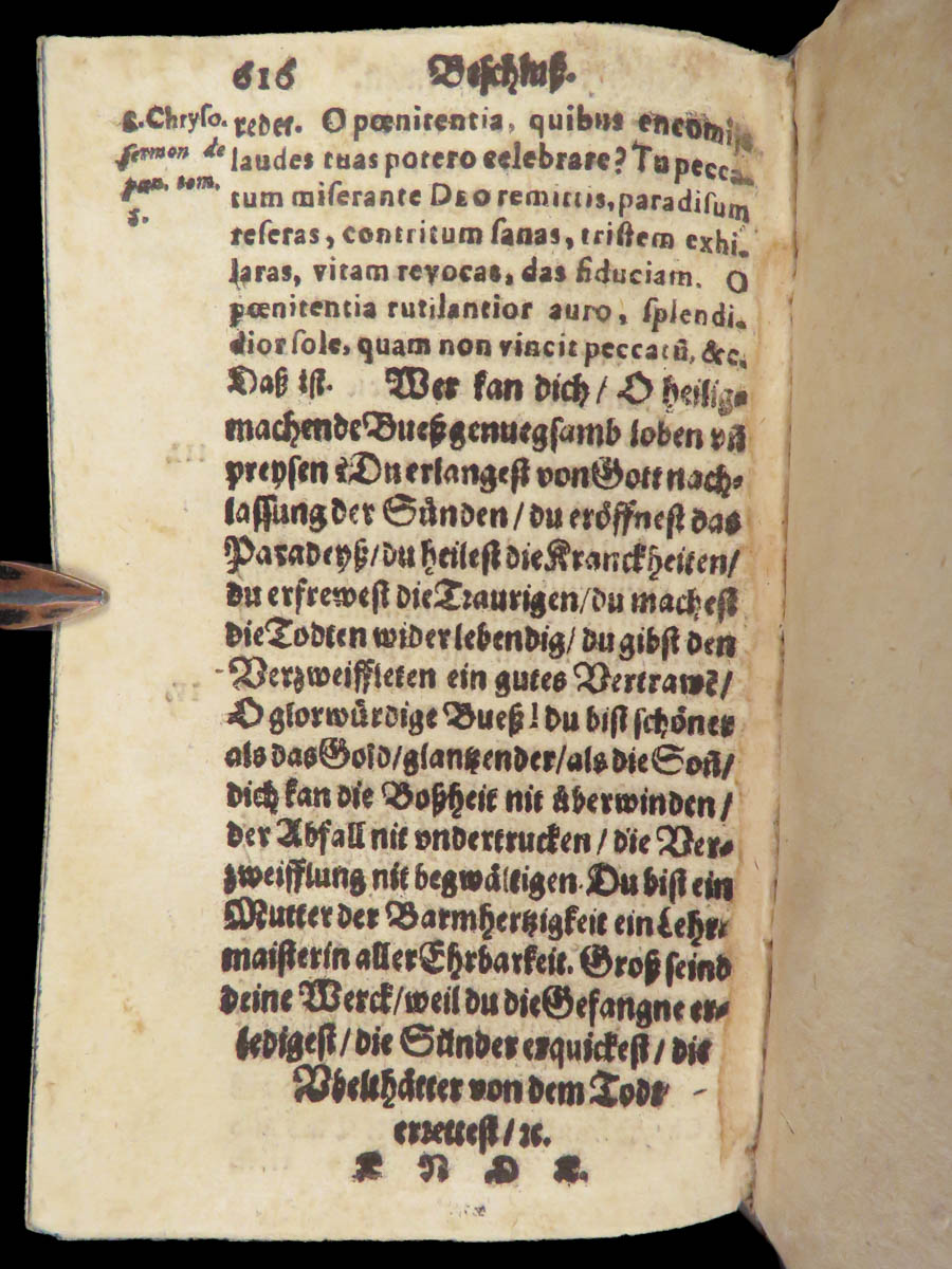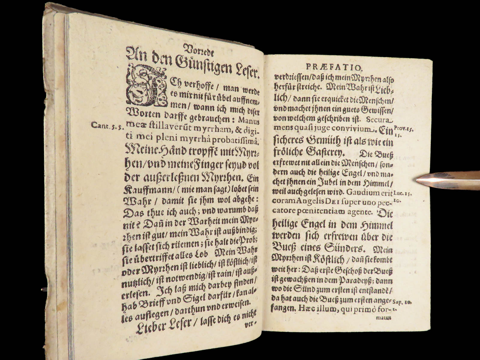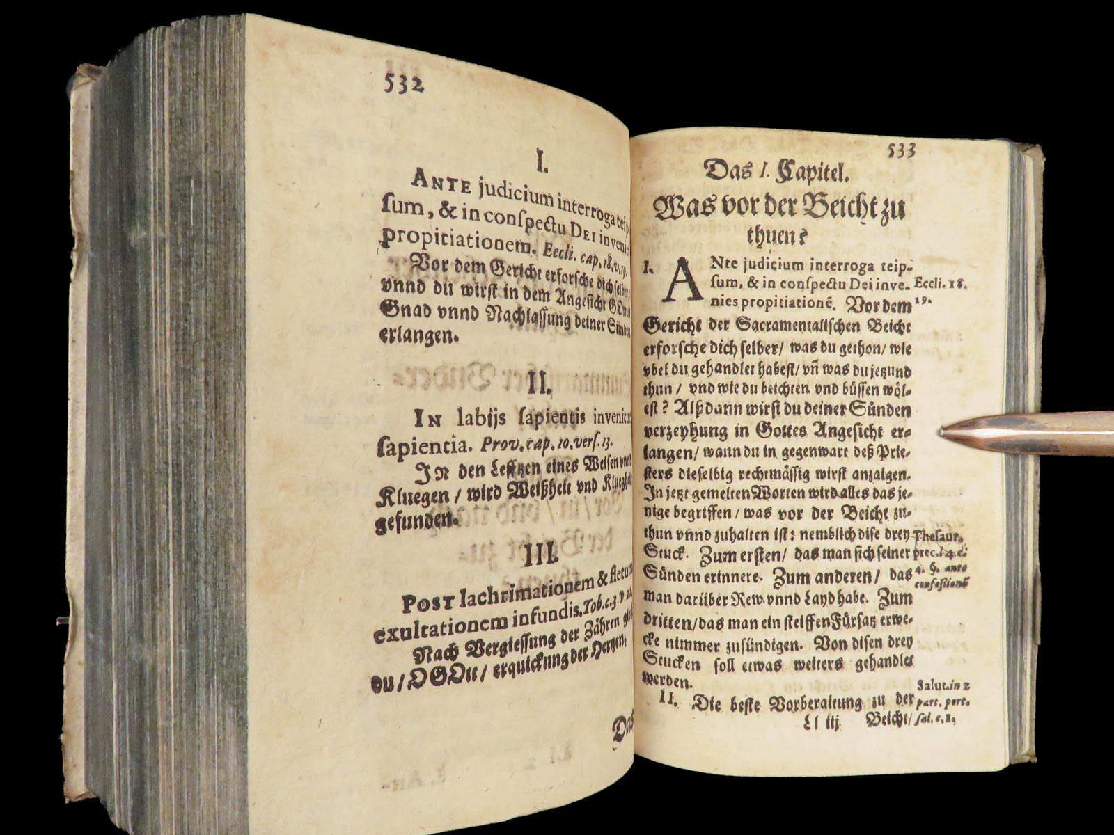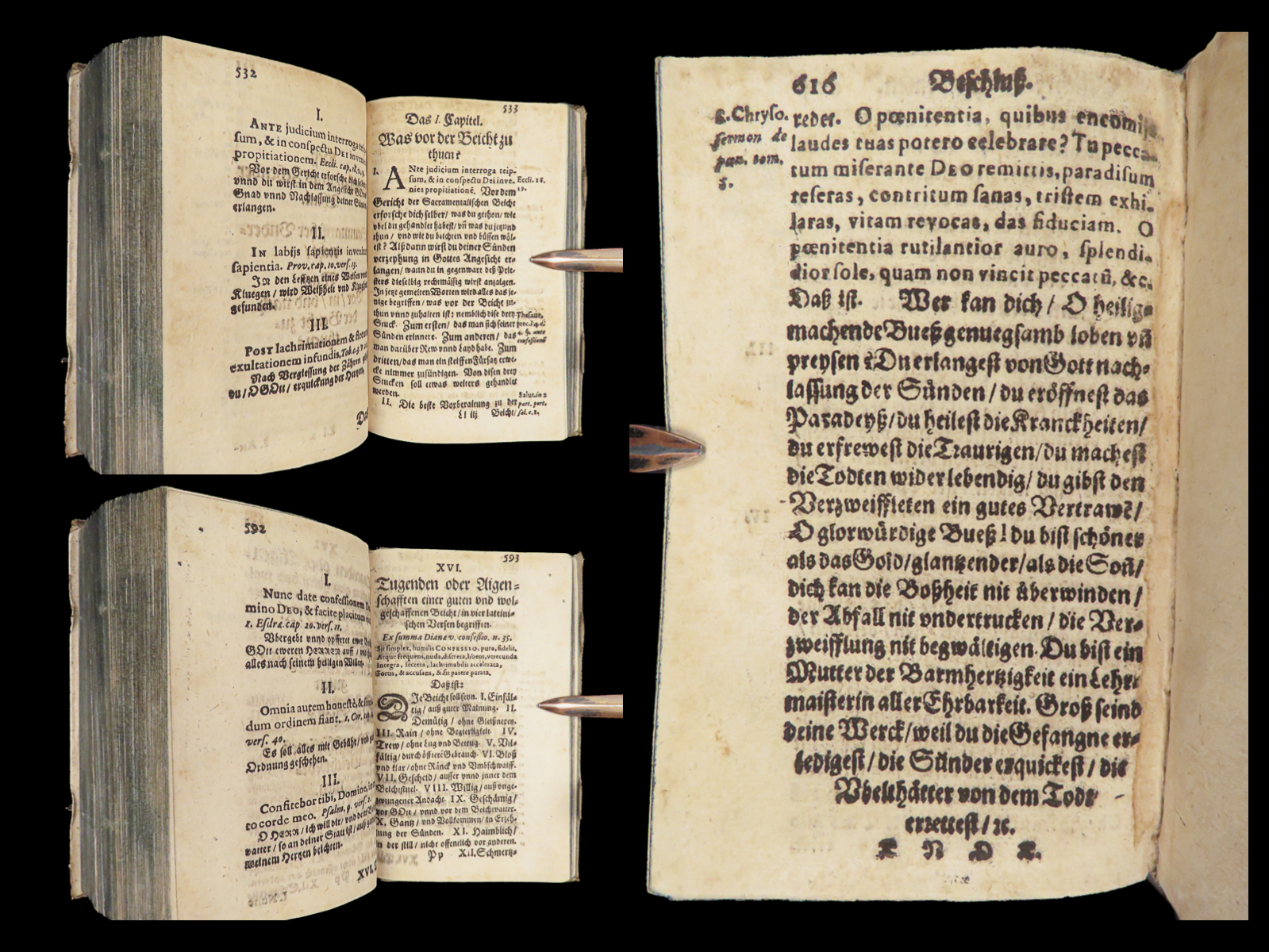 Myrzhenberg: Oder Hailsame underweisung von Dem heiligen Sacrament der Buess by Georg Biegeisen is a 1659 treatise devoted to the theology of penance. Biegeisen wrote from a Lutheran perspective comparing how  Lutheran penance varies from the Catholic traditions. Interestingly, Ingolstadt, the publishing city, was known for its Catholic traditions, not for publishing Protestant texts.