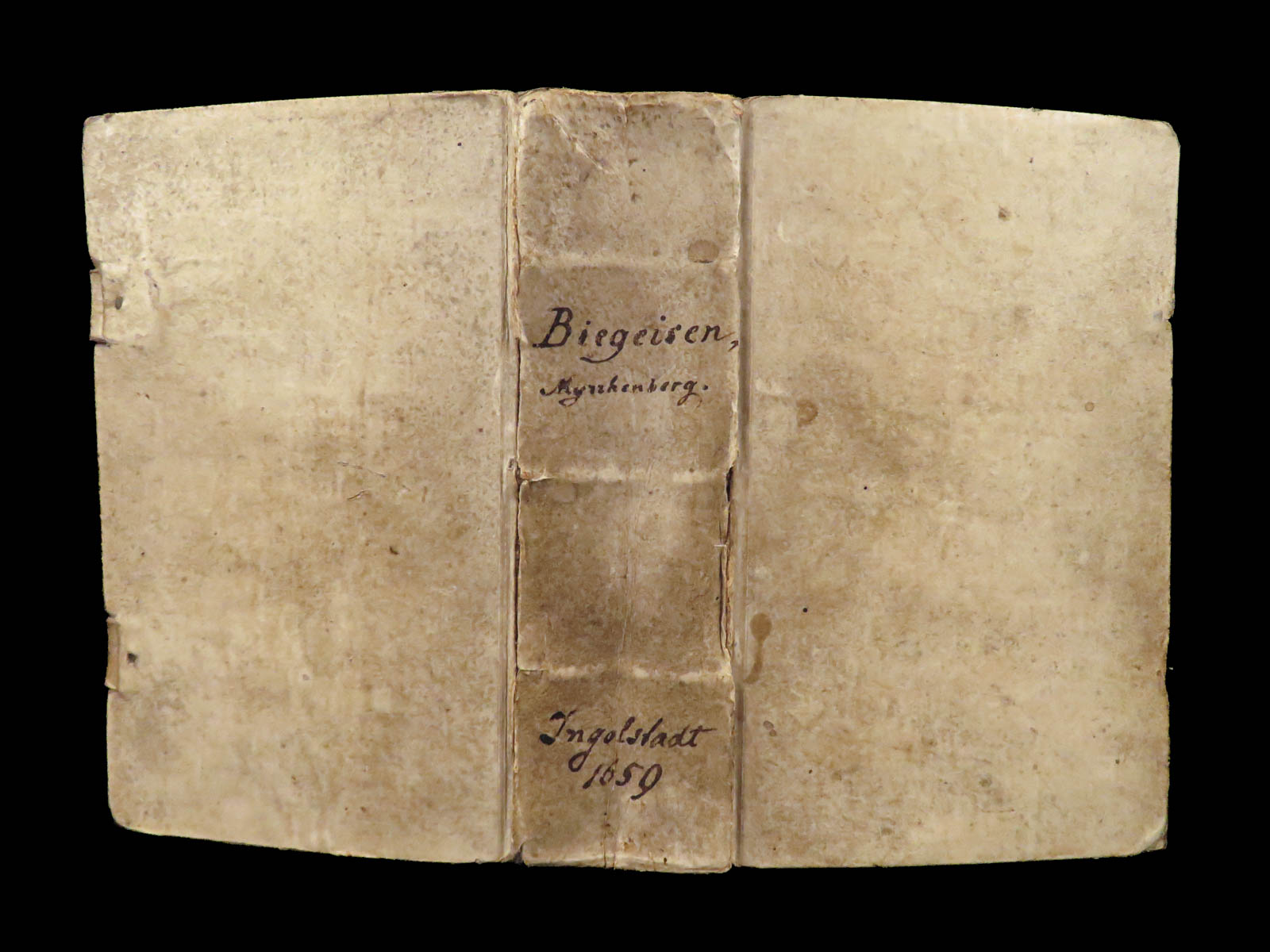 Georg Biegeisen’s Myrzhenberg, printed in Ingolstadt in 1659, is a Lutheran theological work on the sacrament of penance, bound in vellum with an engraved title page.