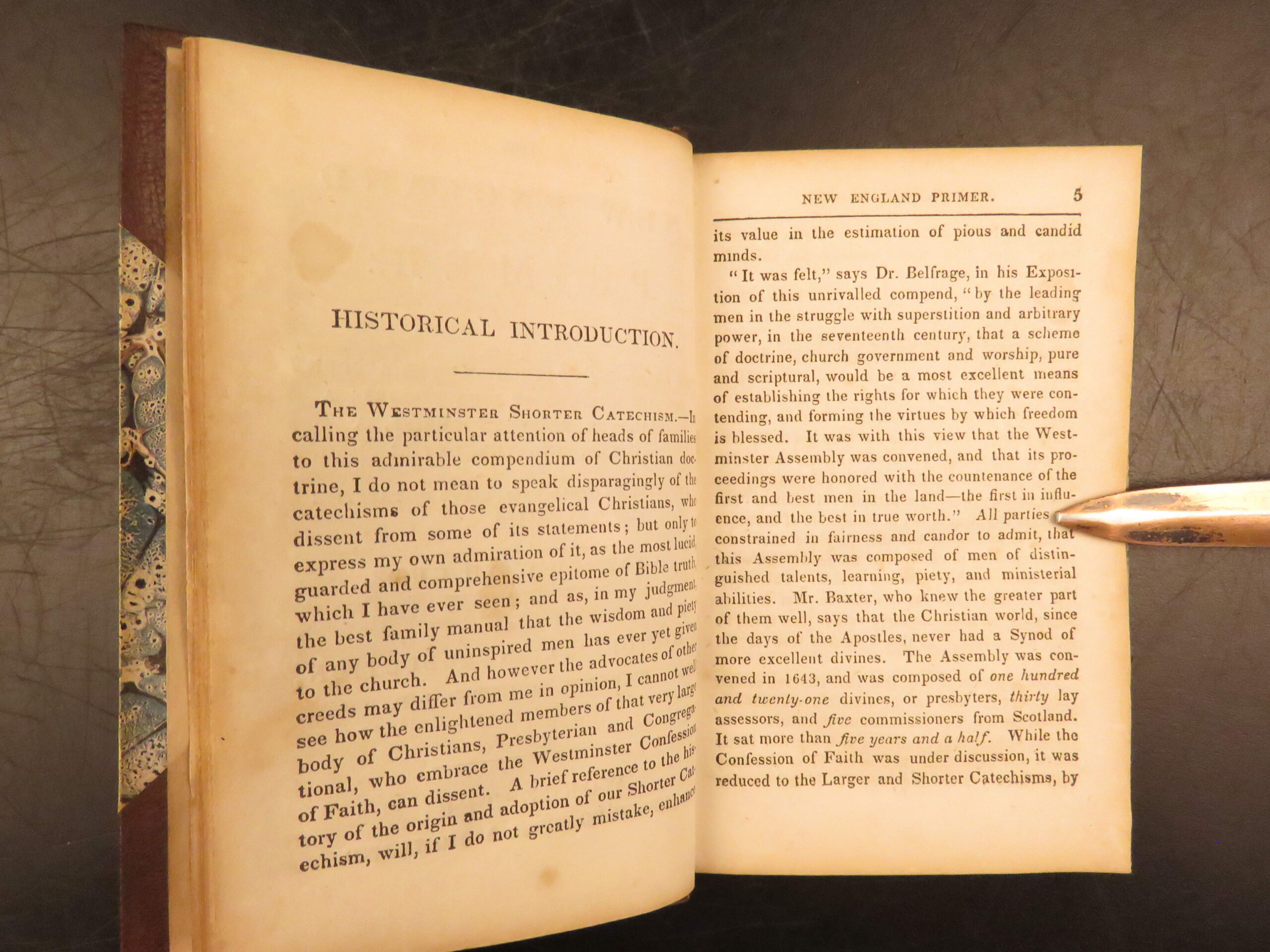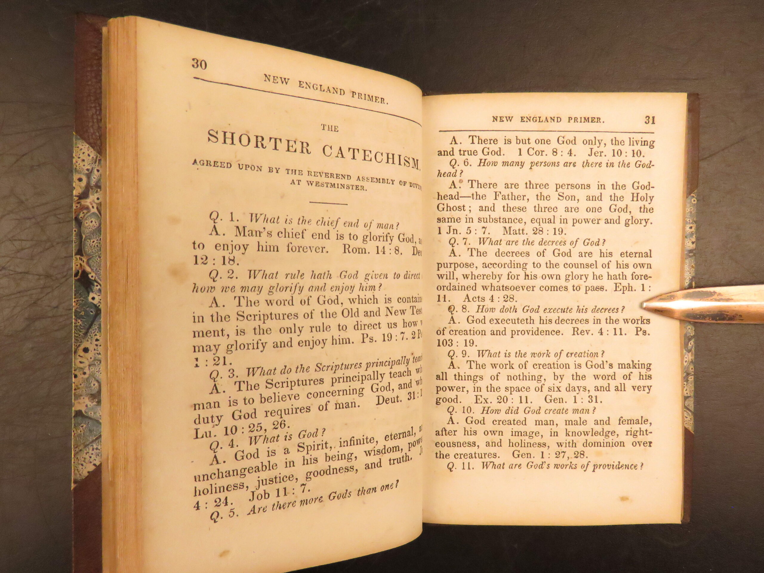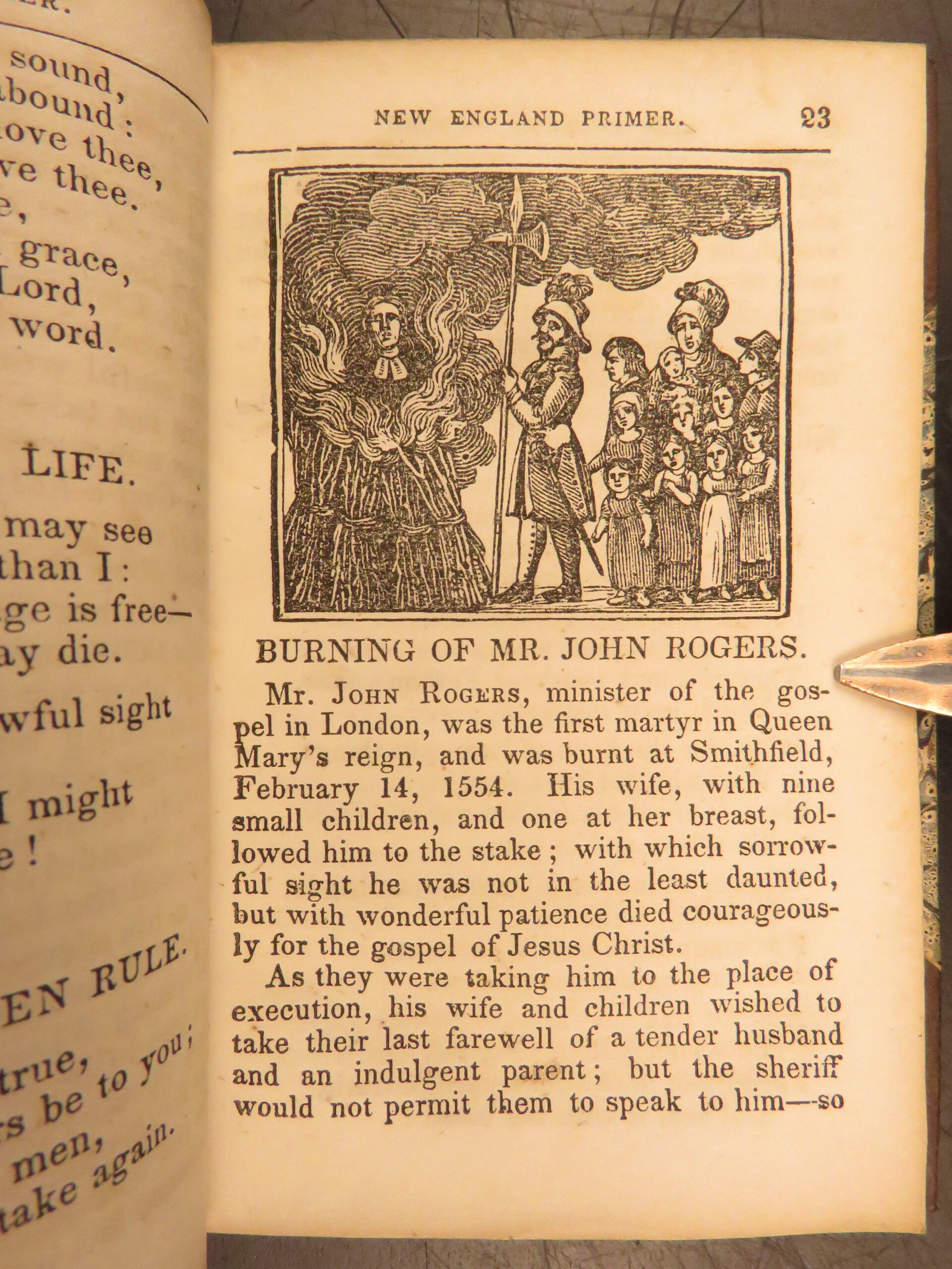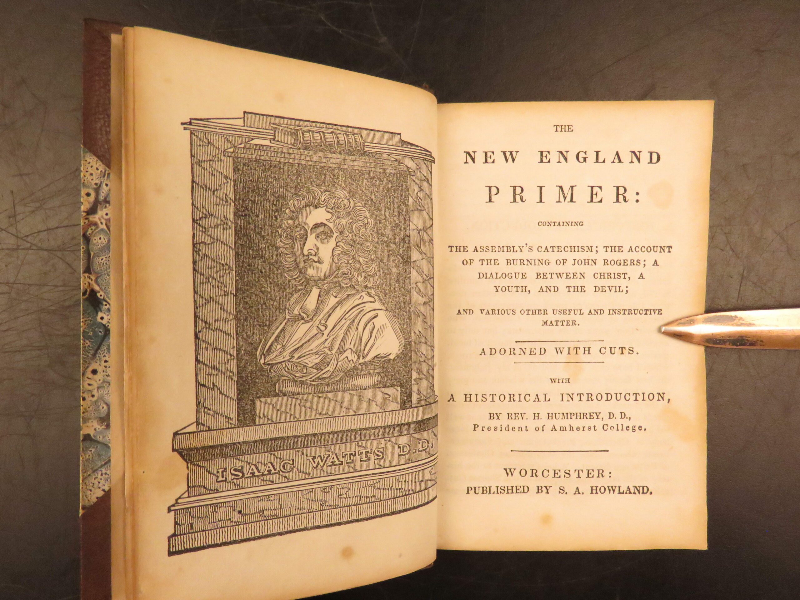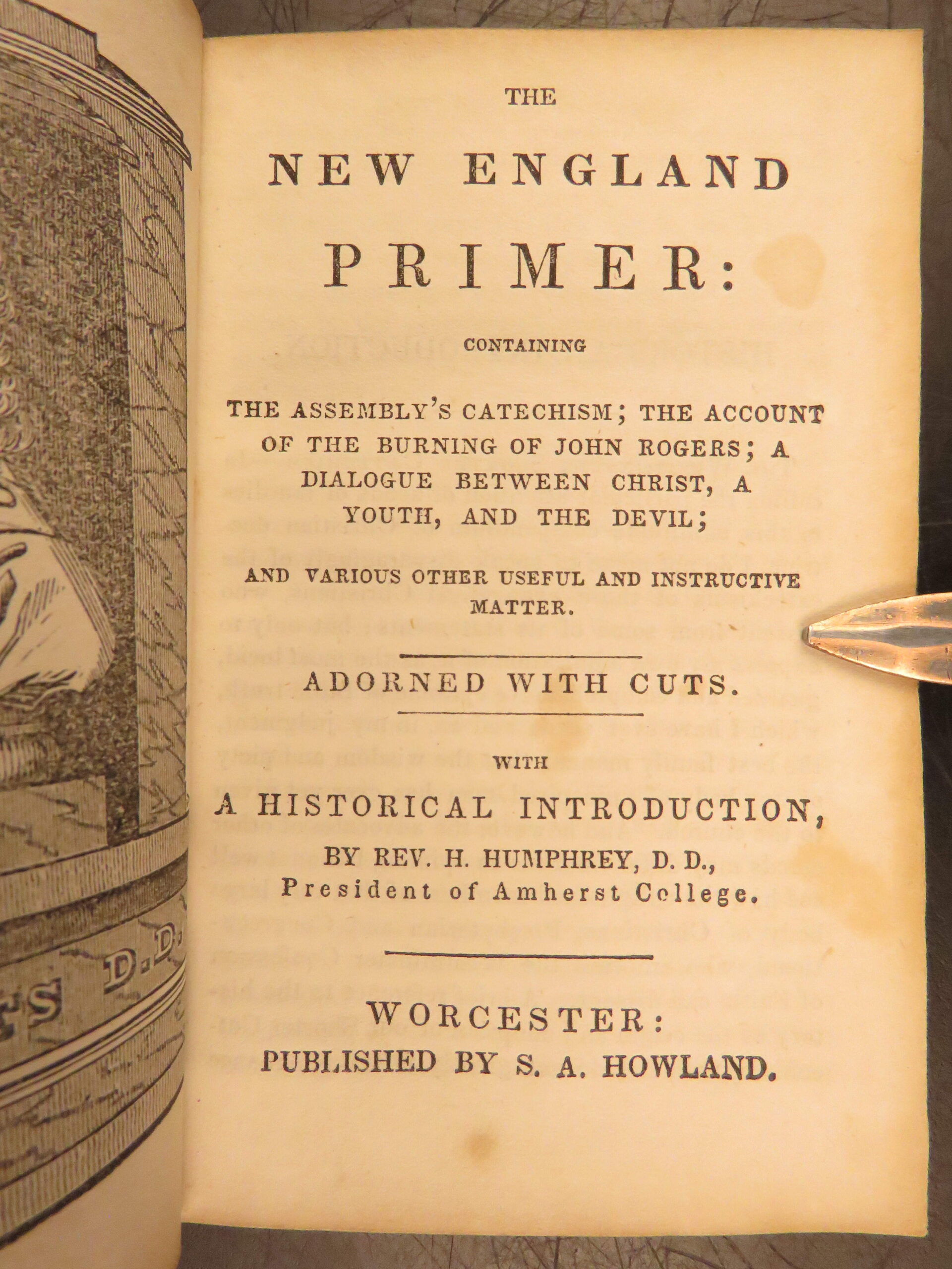 The New England Primer printed in Worcester by S.A. Howland in 1830 containing the Assembly’s Catechism, devotional prayers, scripture study passages, and the account of John Rogers with small woodcut illustrations.