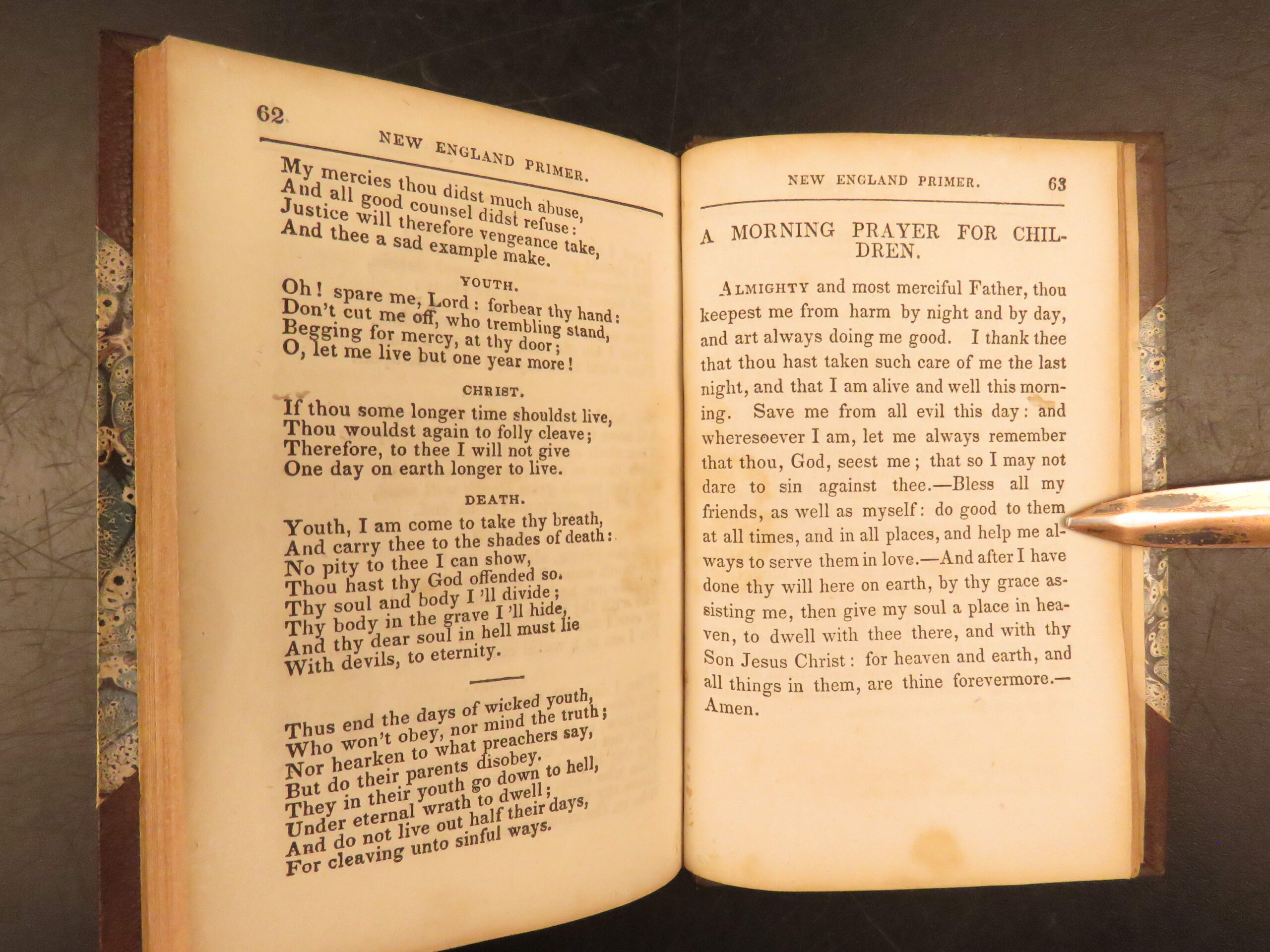 This 1830 edition was published in Worcester and is notable for being a small, pocket-sized edition that features prayers, scripture verses, and the Worcester Catechism. Other topics include an account of the burning of John Rogers, a dialogue between Christ, a youth, and the Devil, and woodcut illustrations.