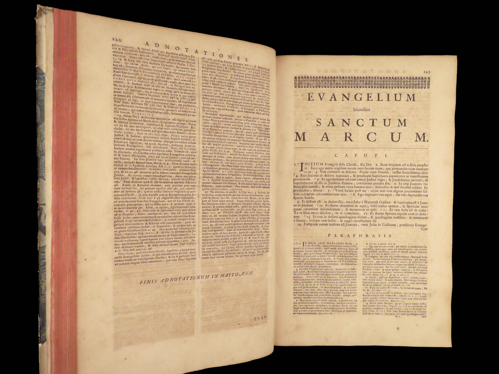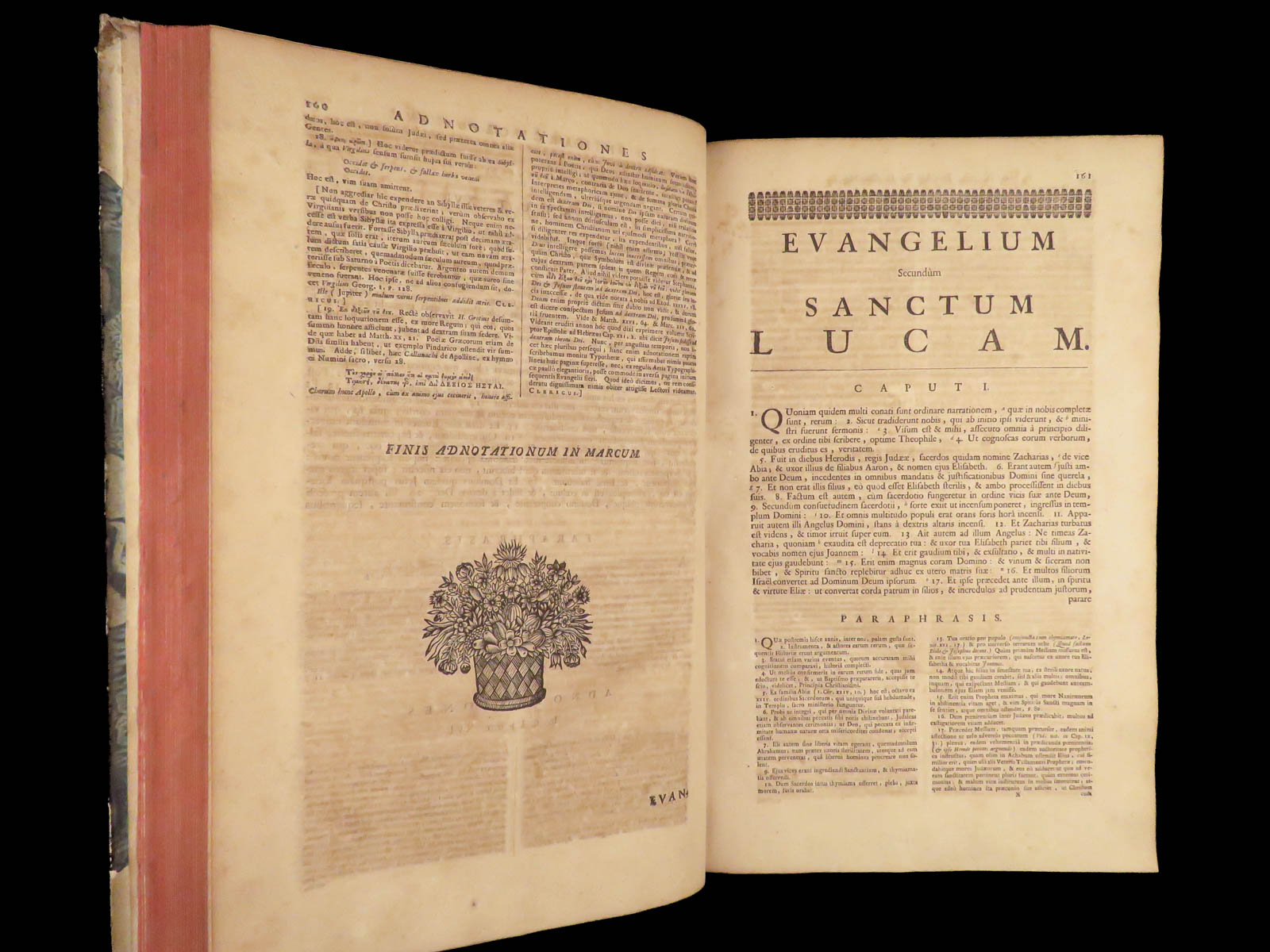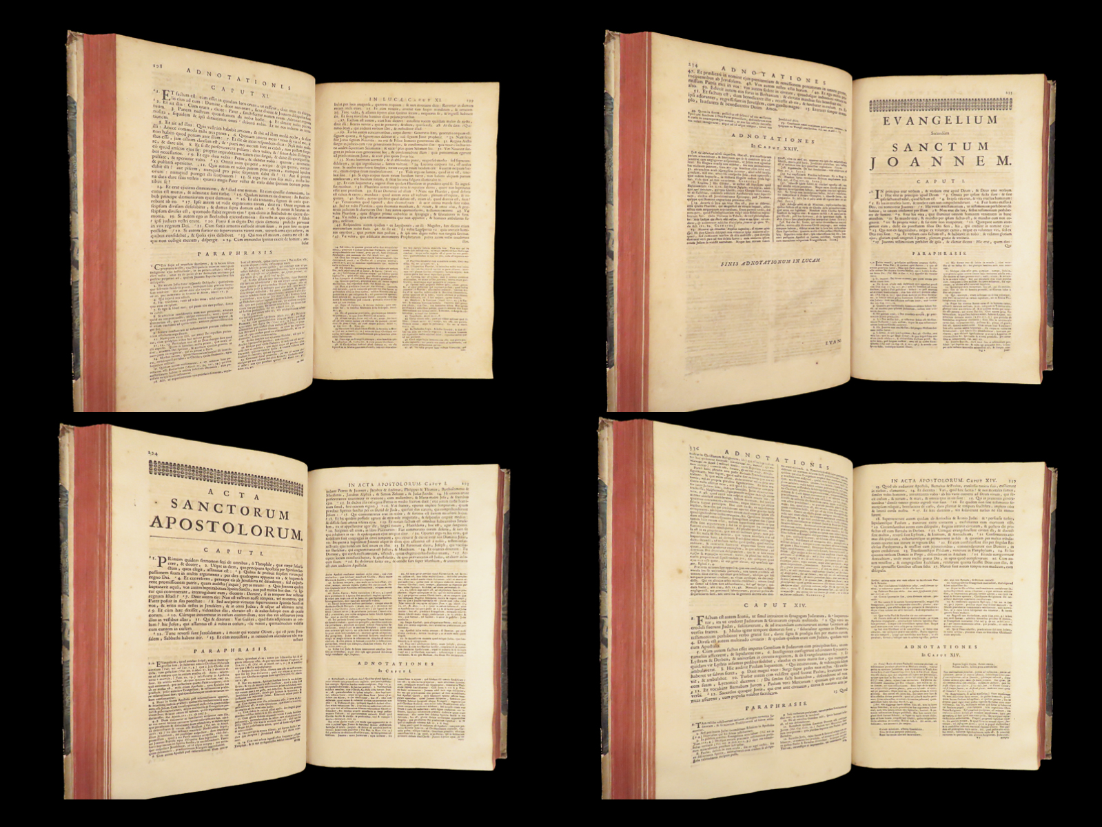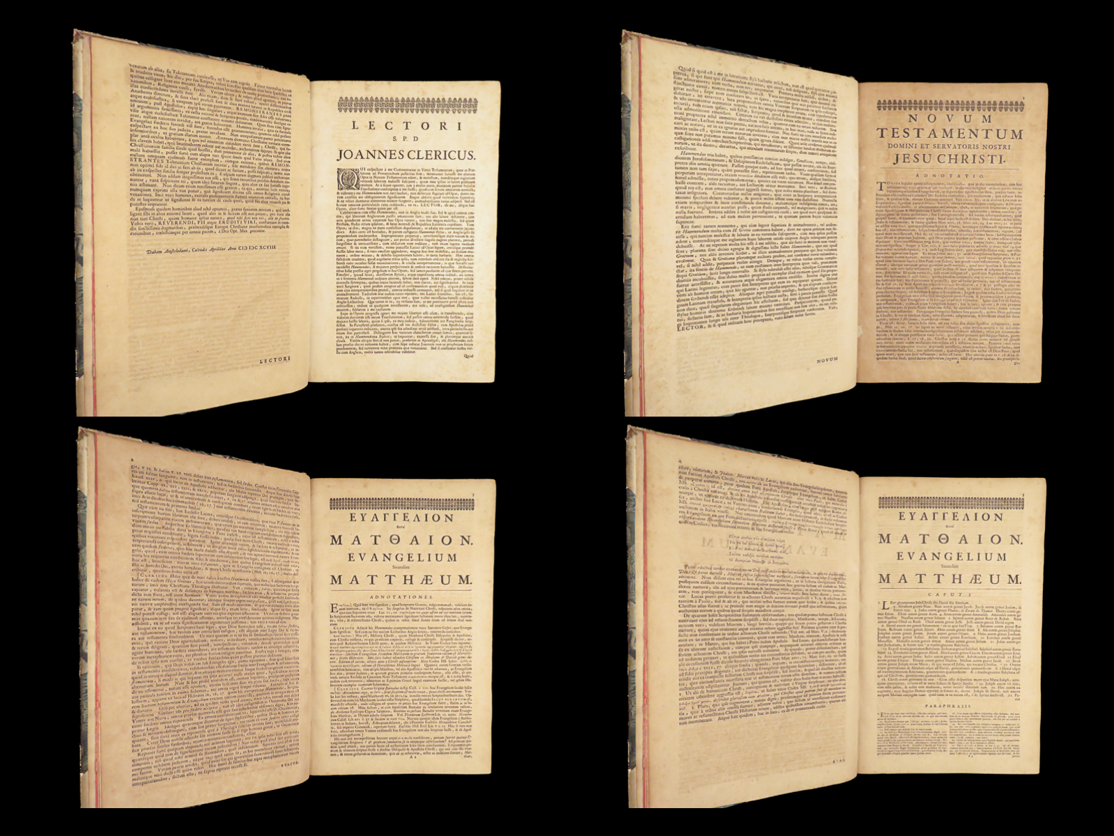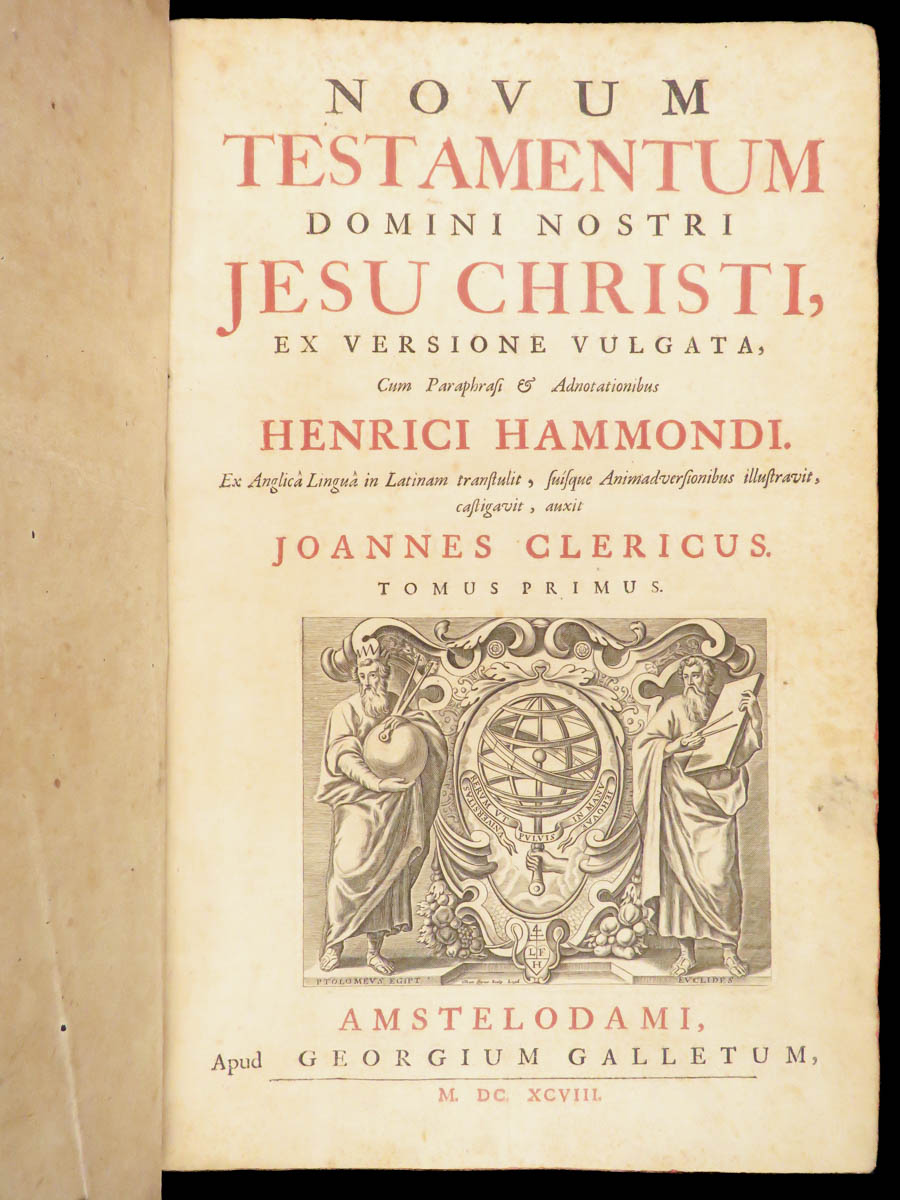 Amsterdam 1698 Latin New Testament with Henry Hammond’s paraphrase and annotations, translated by Jean Le Clerc, an influential edition of seventeenth-century Biblical scholarship.