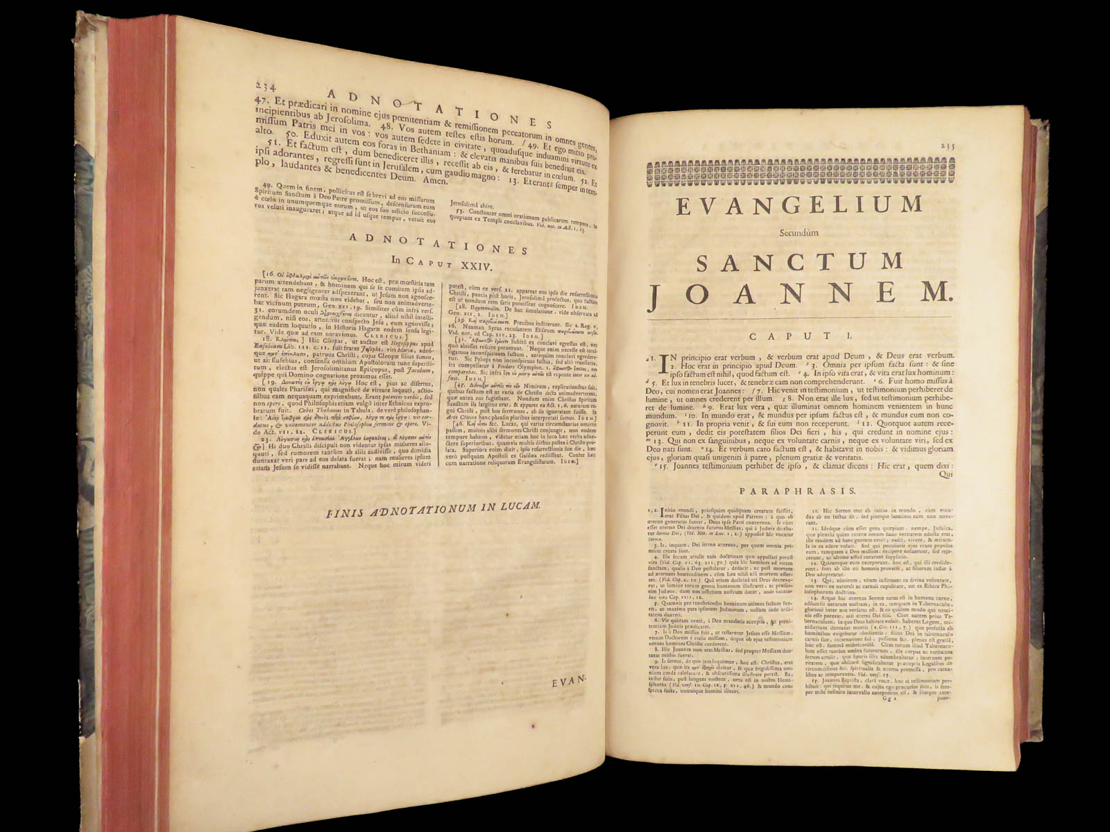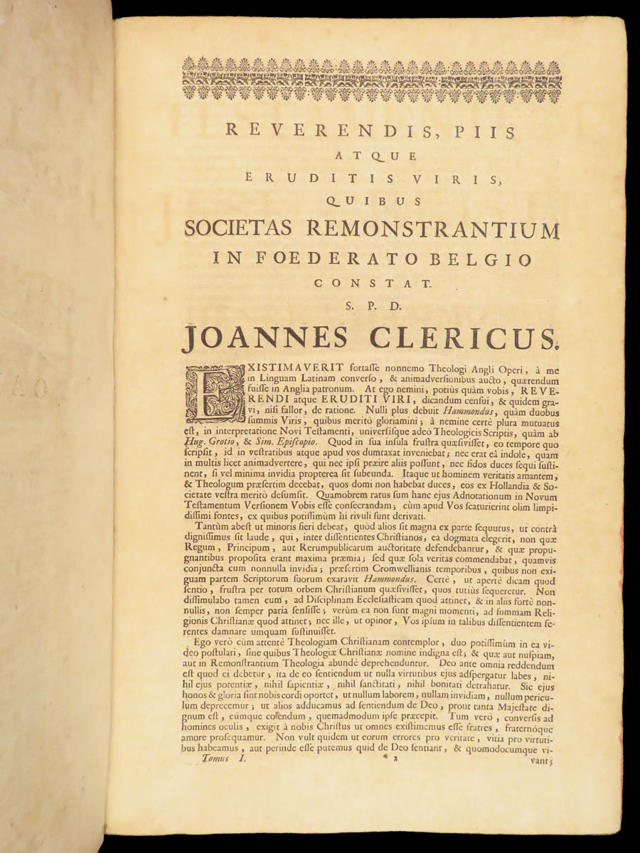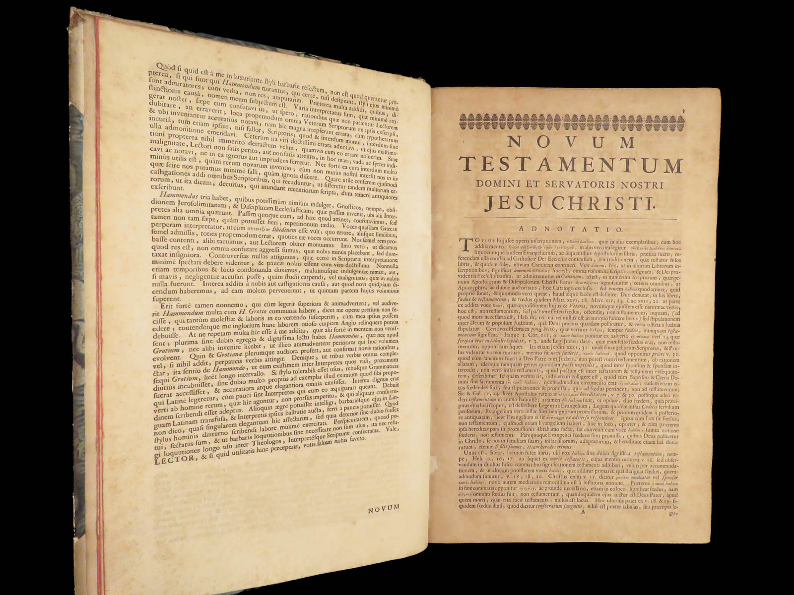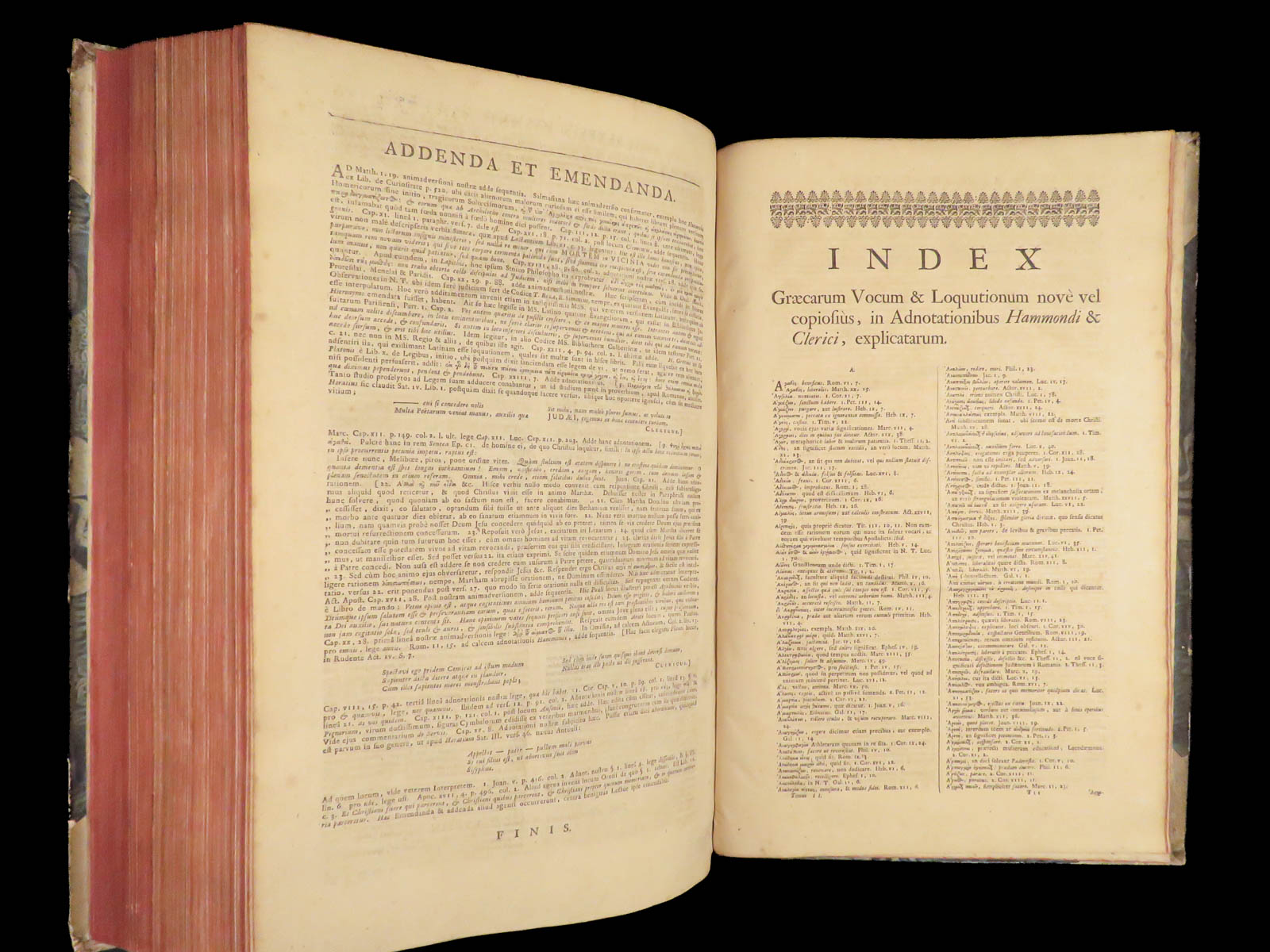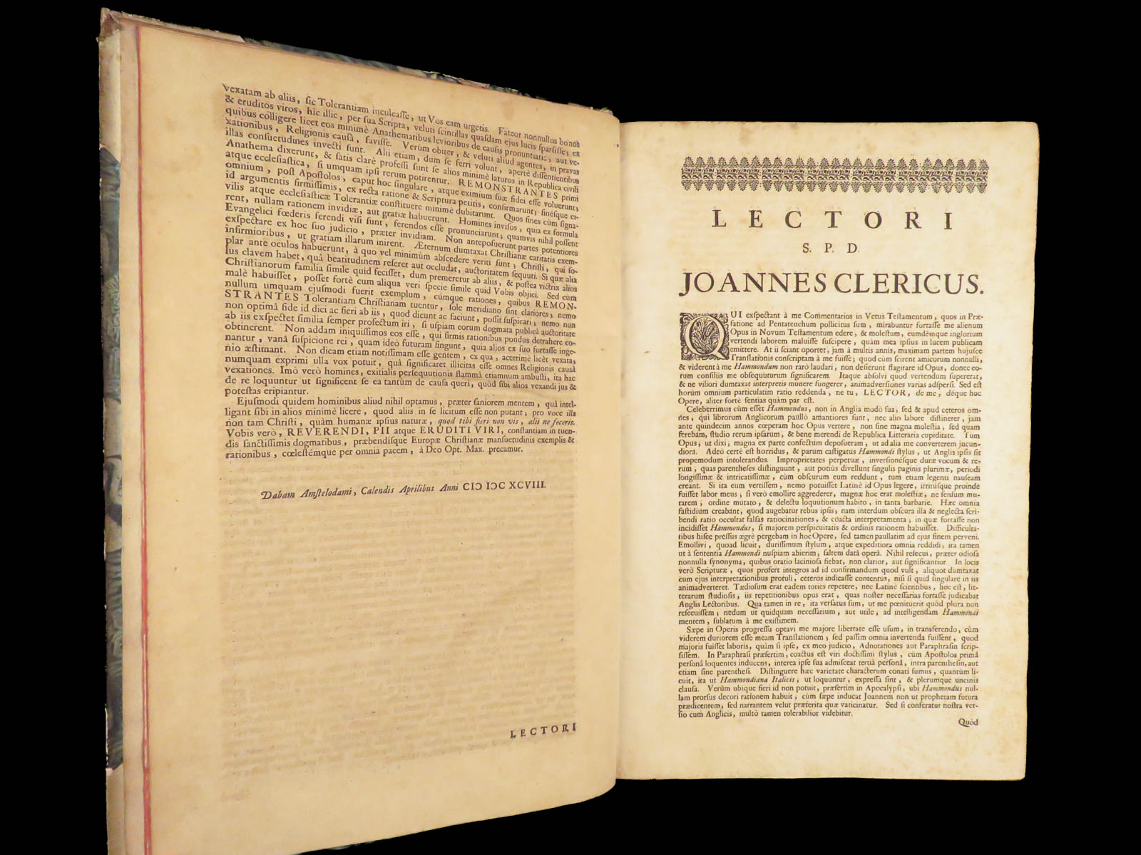Amsterdam 1698 Latin New Testament with Henry Hammond’s paraphrase and annotations, translated by Jean Le Clerc, an influential edition of seventeenth-century Biblical scholarship.