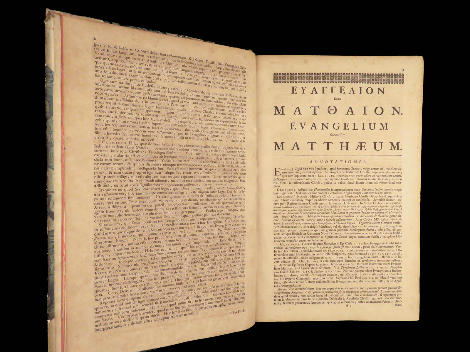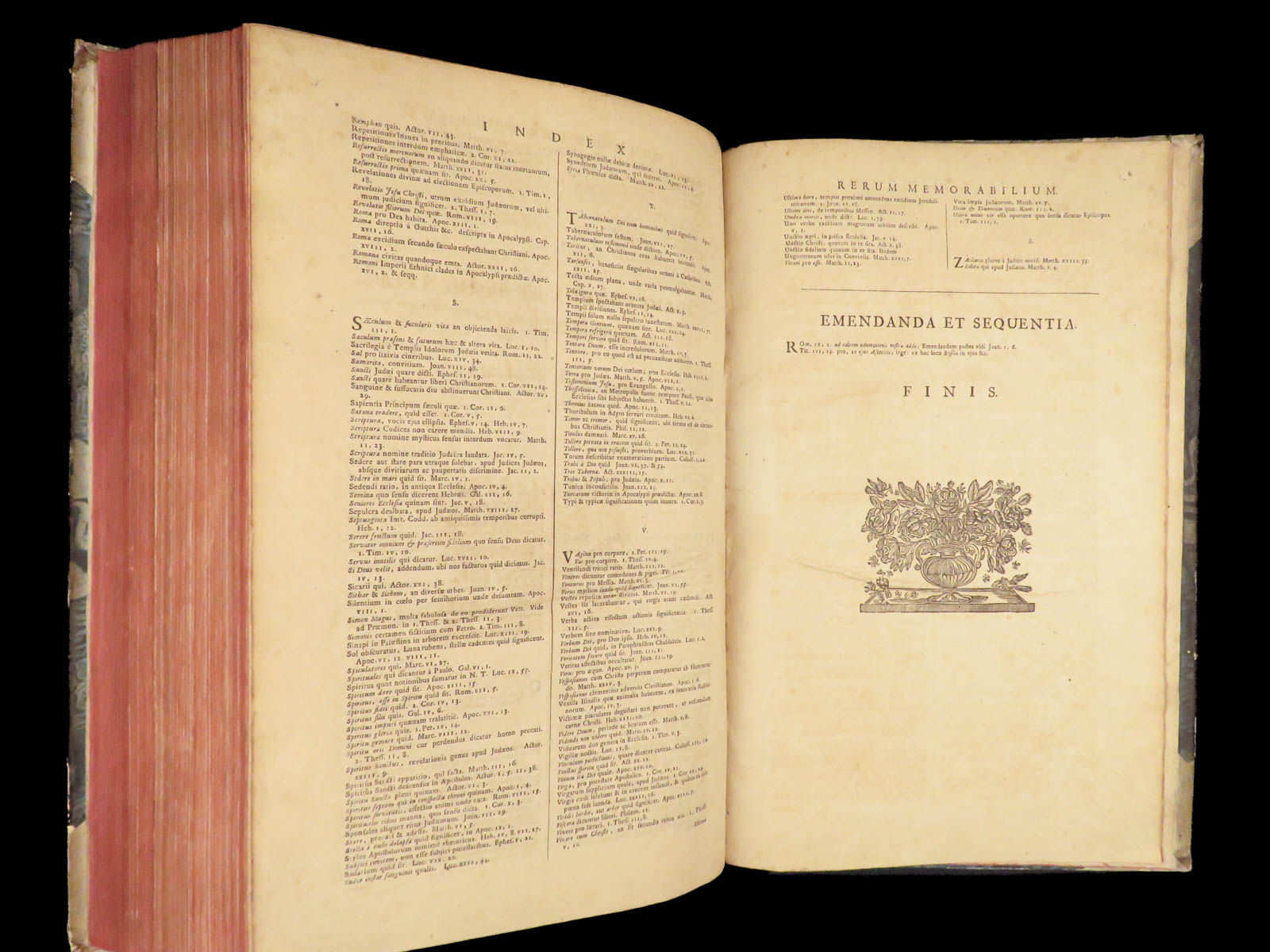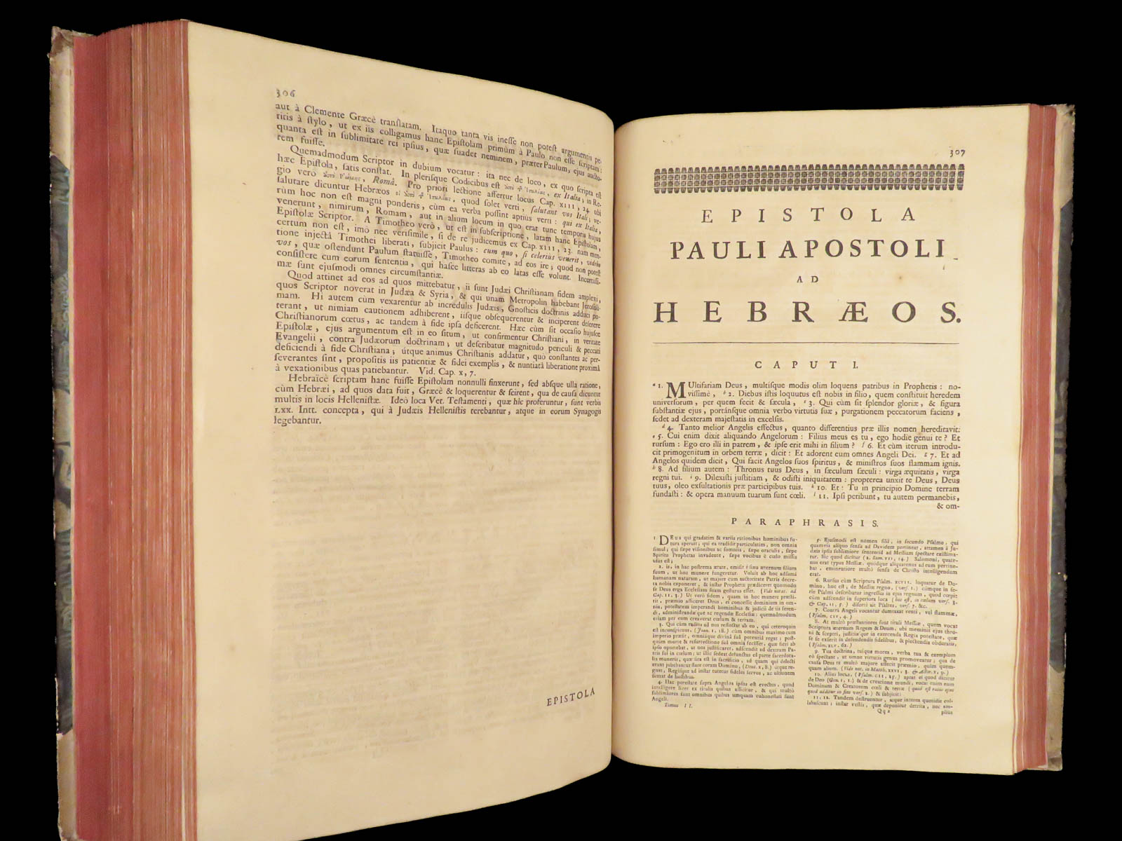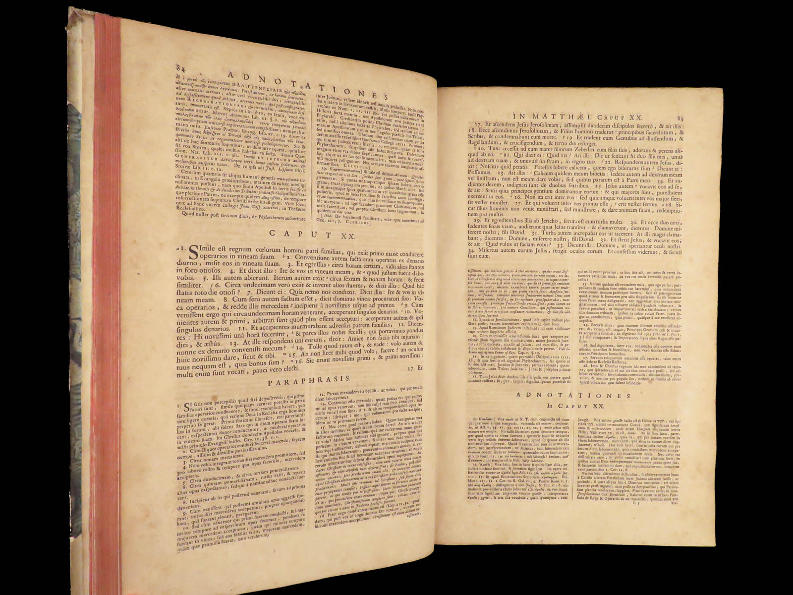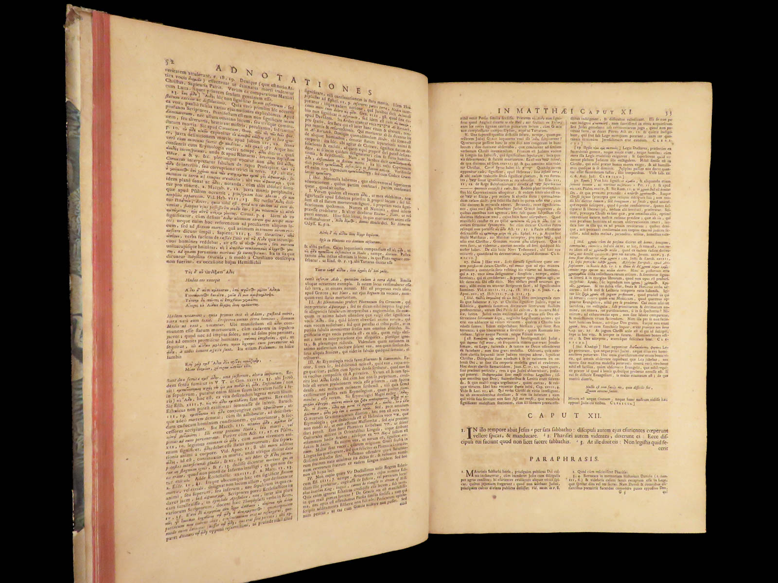 Amsterdam 1698 Latin New Testament with Henry Hammond’s paraphrase and annotations, translated by Jean Le Clerc, an influential edition of seventeenth-century Biblical scholarship.