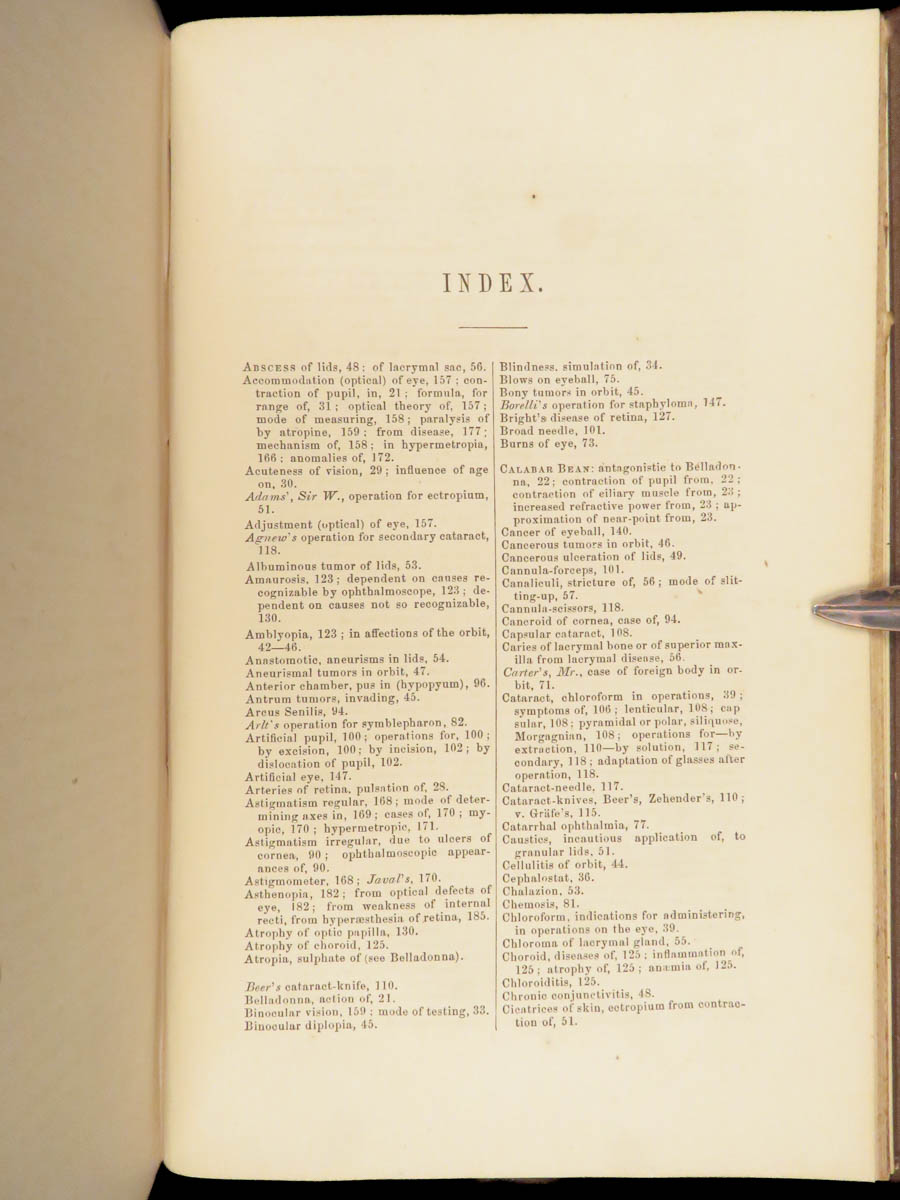 A Handy-Book of Ophthalmic Surgery for the Use of Practitioners by John Zachariah Laurence and Robert Charles Moon was published in Philadelphia by Lea in 1866. This early English-language guide reflects the establishment of ophthalmology as a distinct branch of medical study in the mid-nineteenth century. The authors, both noted London ophthalmologists, present clear practical instructions for physicians treating disorders of the eye. The volume covers examination techniques and a range of ocular diseases, including conditions of the eyelids, lacrymal apparatus, muscles, conjunctiva, cornea, iris, and crystalline lens. It also includes sections on glaucoma, visual assessment, and optical defects.