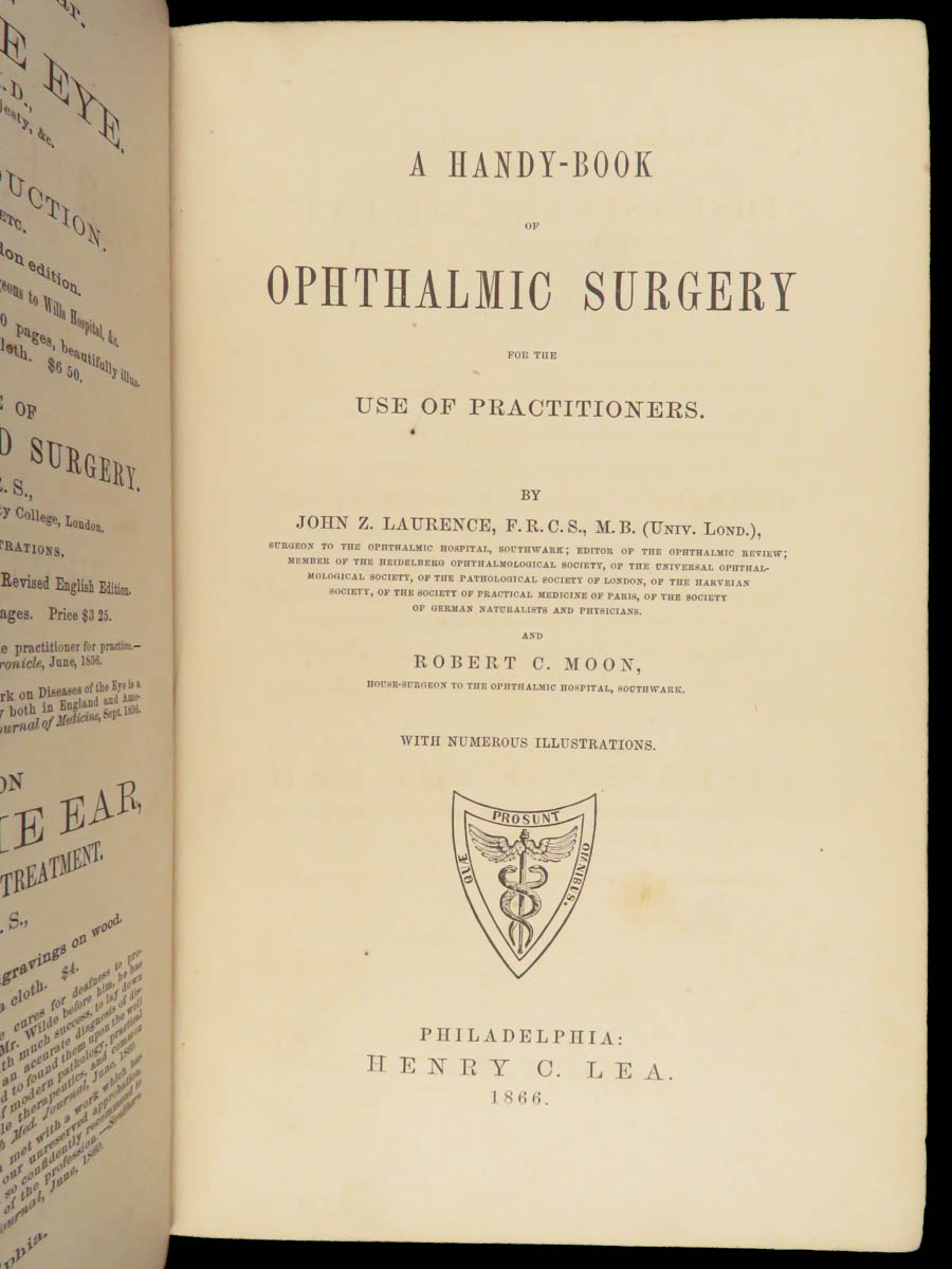 Laurence and Moon’s 1866 Philadelphia edition presents an early manual of ophthalmic surgery, covering diagnostic methods and eye disorders, including glaucoma and optical defects, for practical medical reference.
