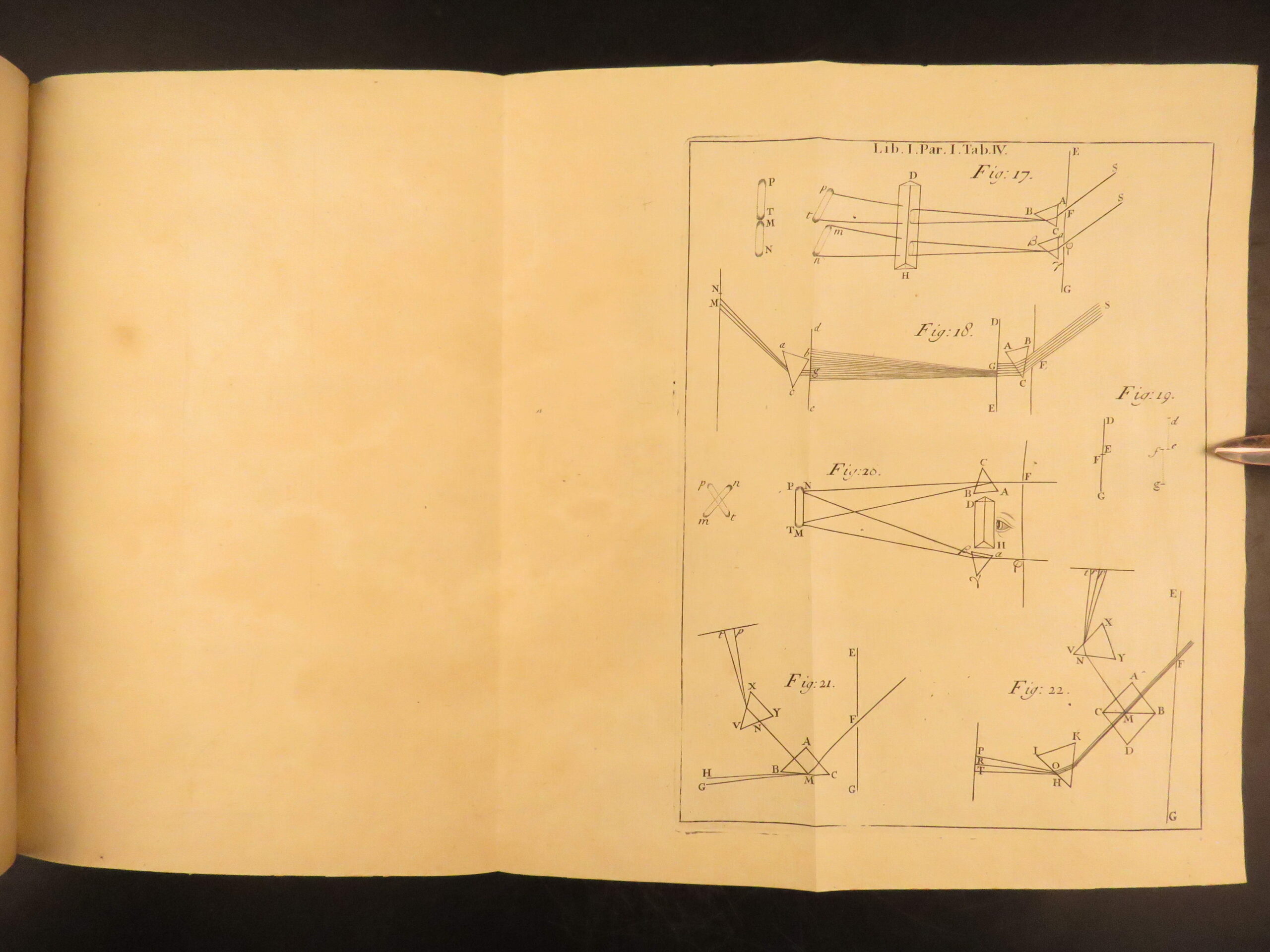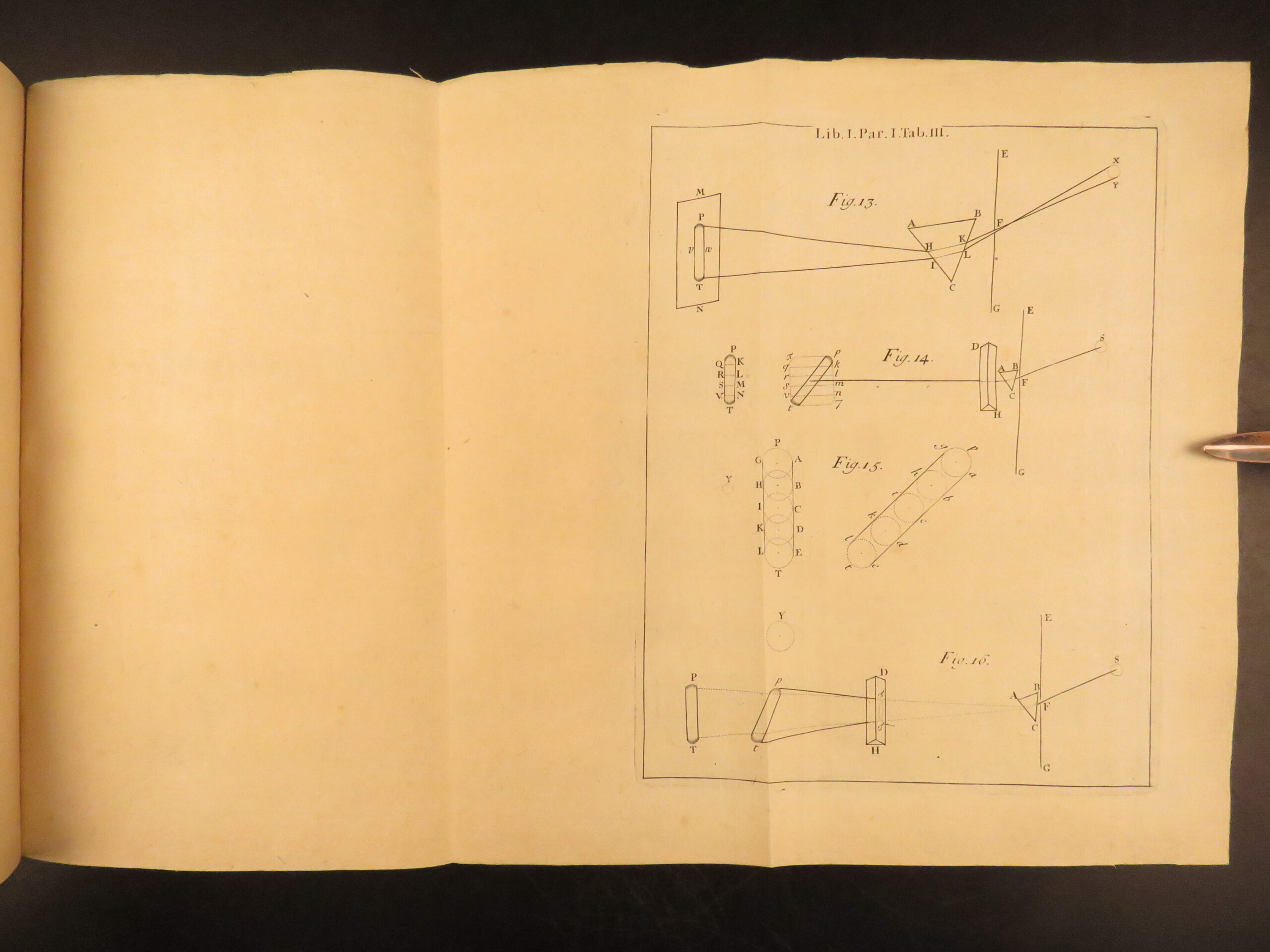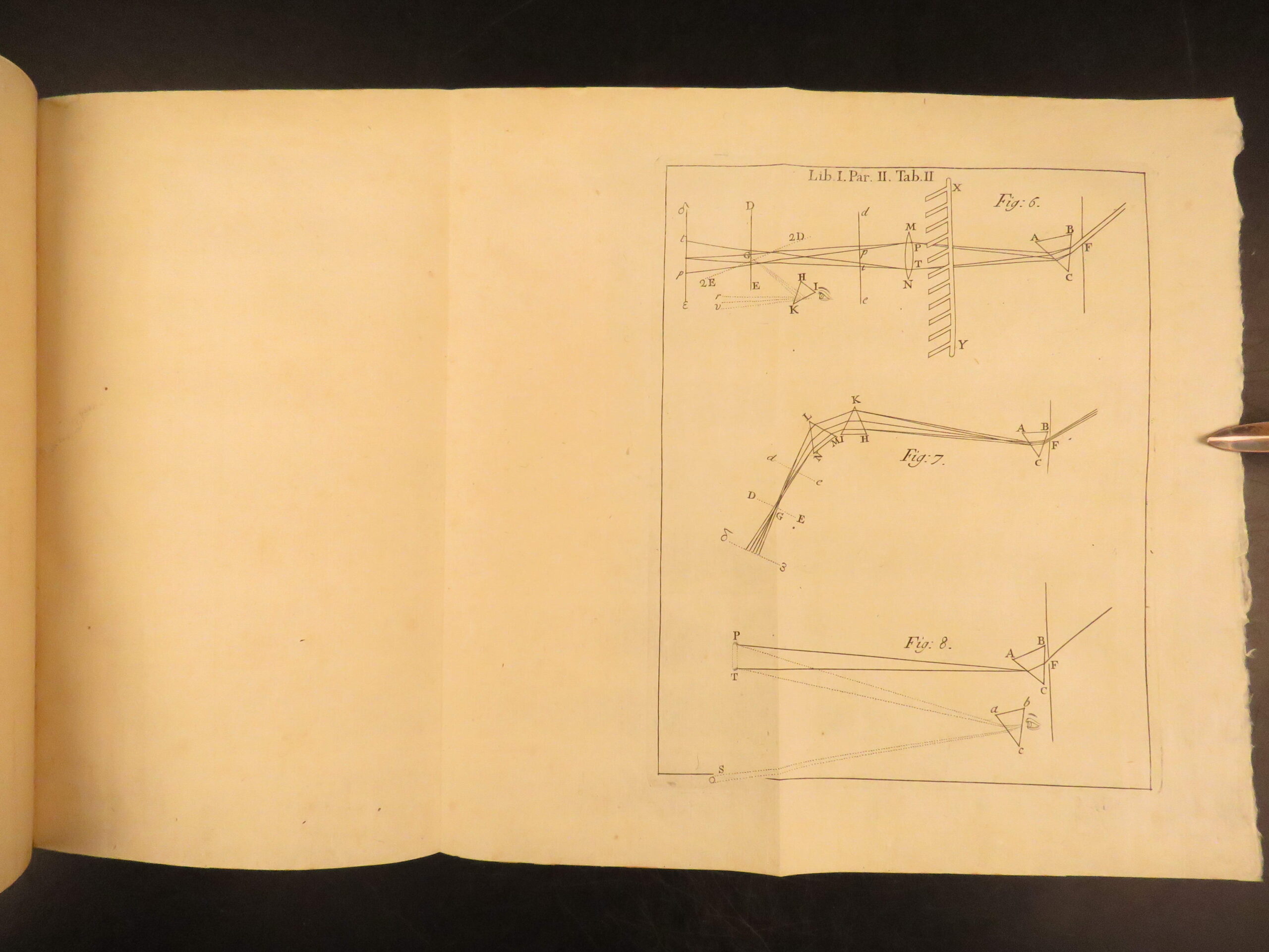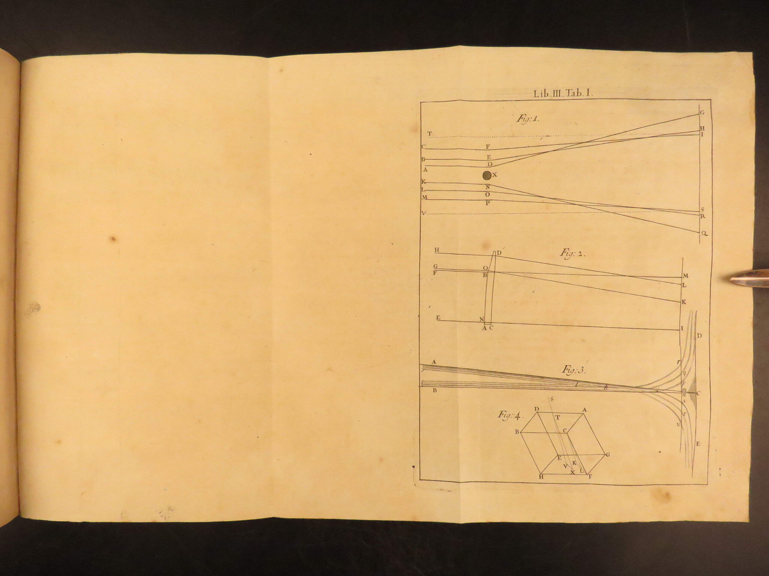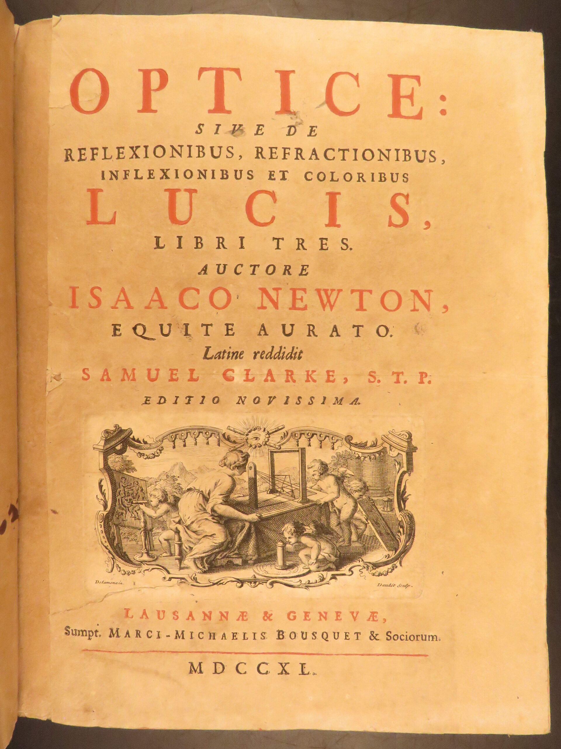 1740 Latin edition of Newton’s Optice with 12 folding engravings, translated by Samuel Clarke and printed in Lausanne and Geneva in full vellum binding.
