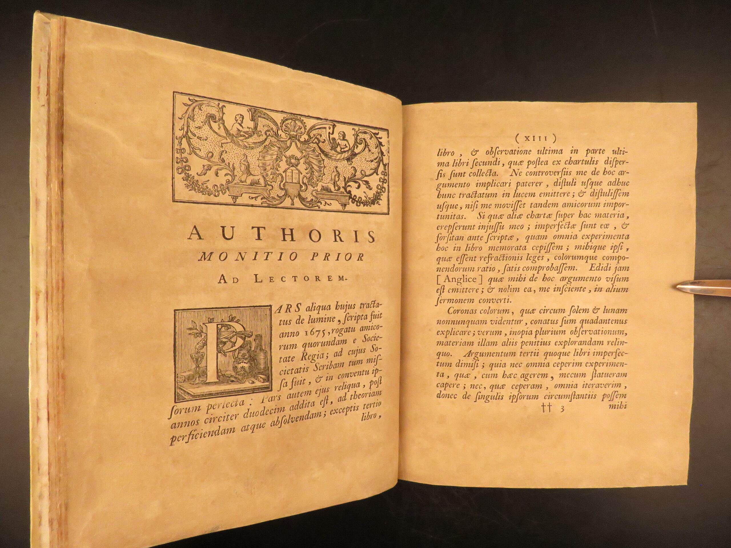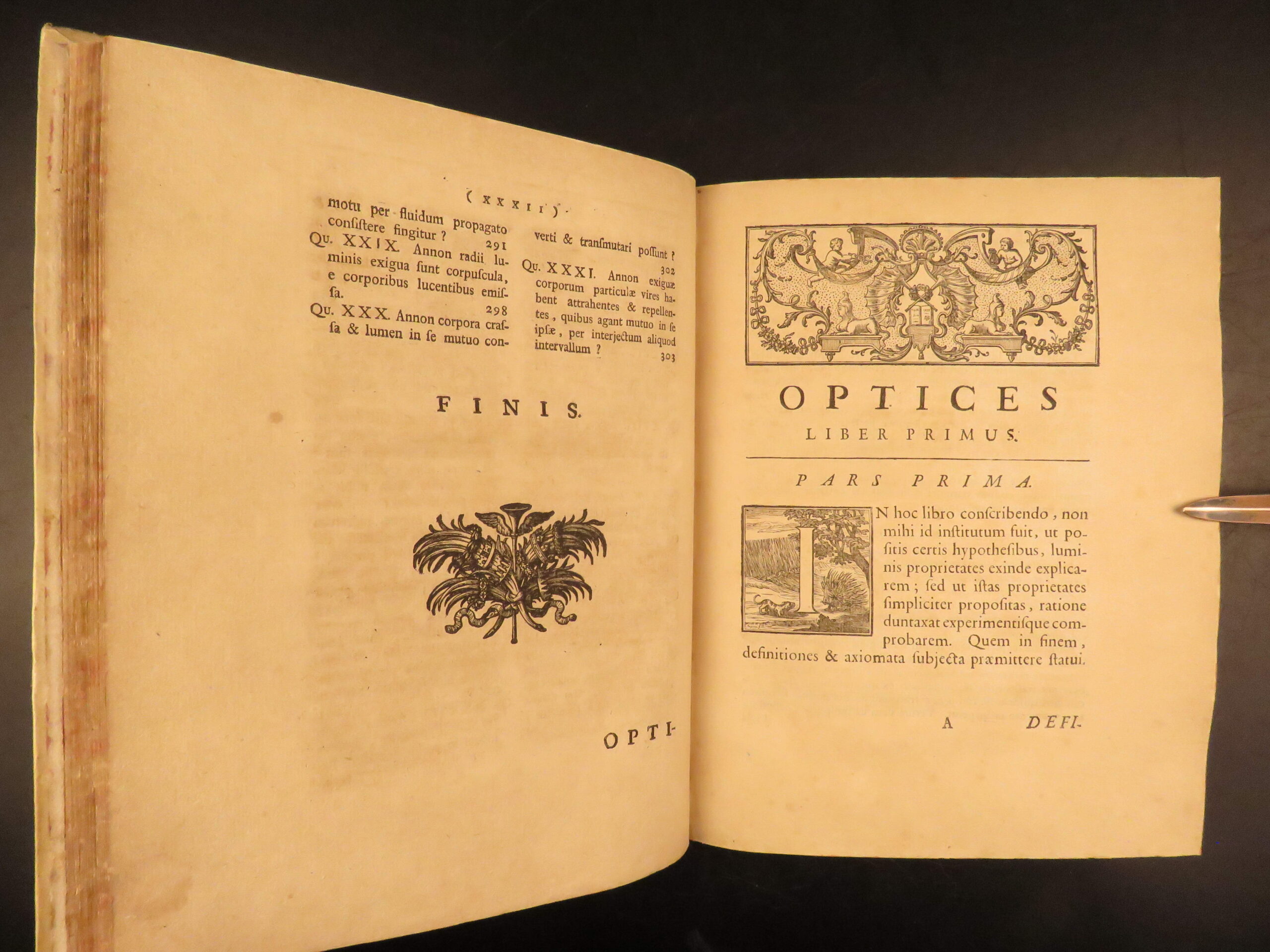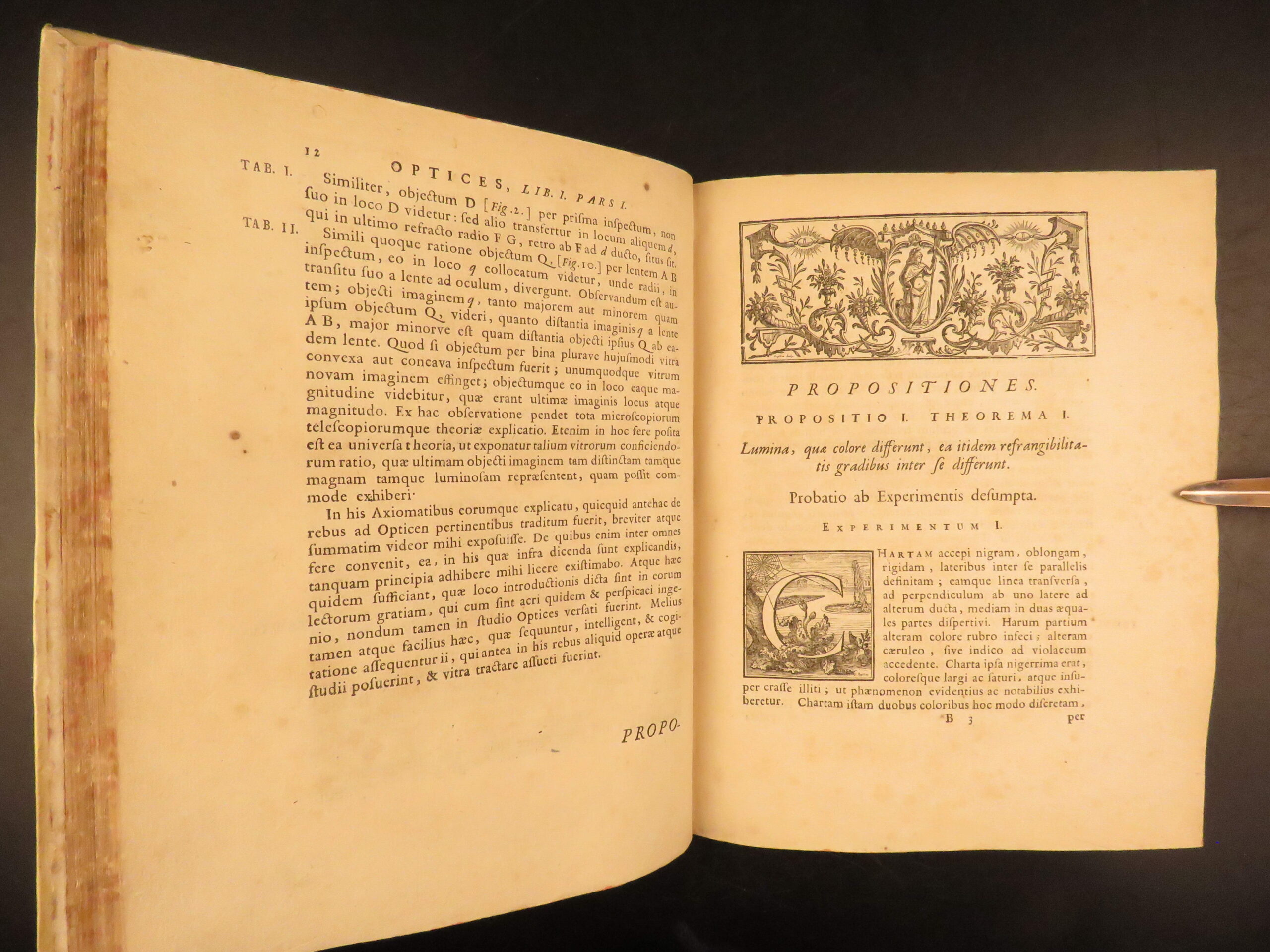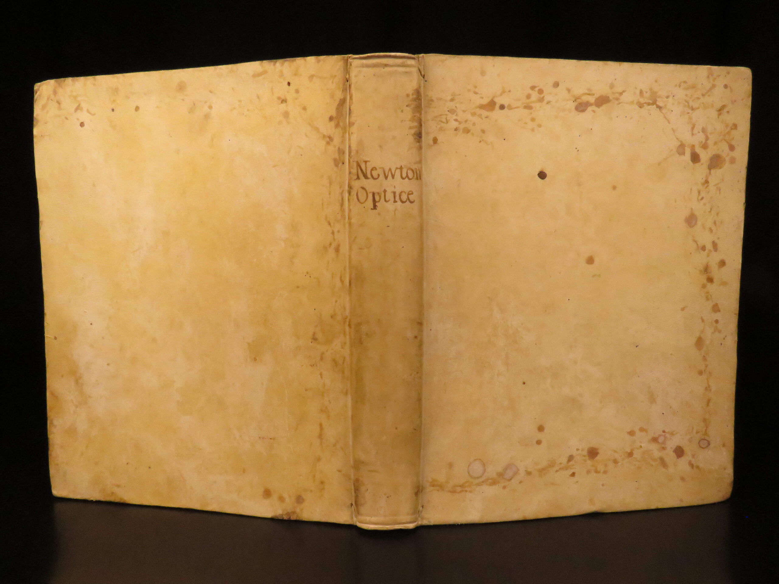 1740 Latin edition of Newton’s Optice with 12 folding engravings, translated by Samuel Clarke and printed in Lausanne and Geneva in full vellum binding.