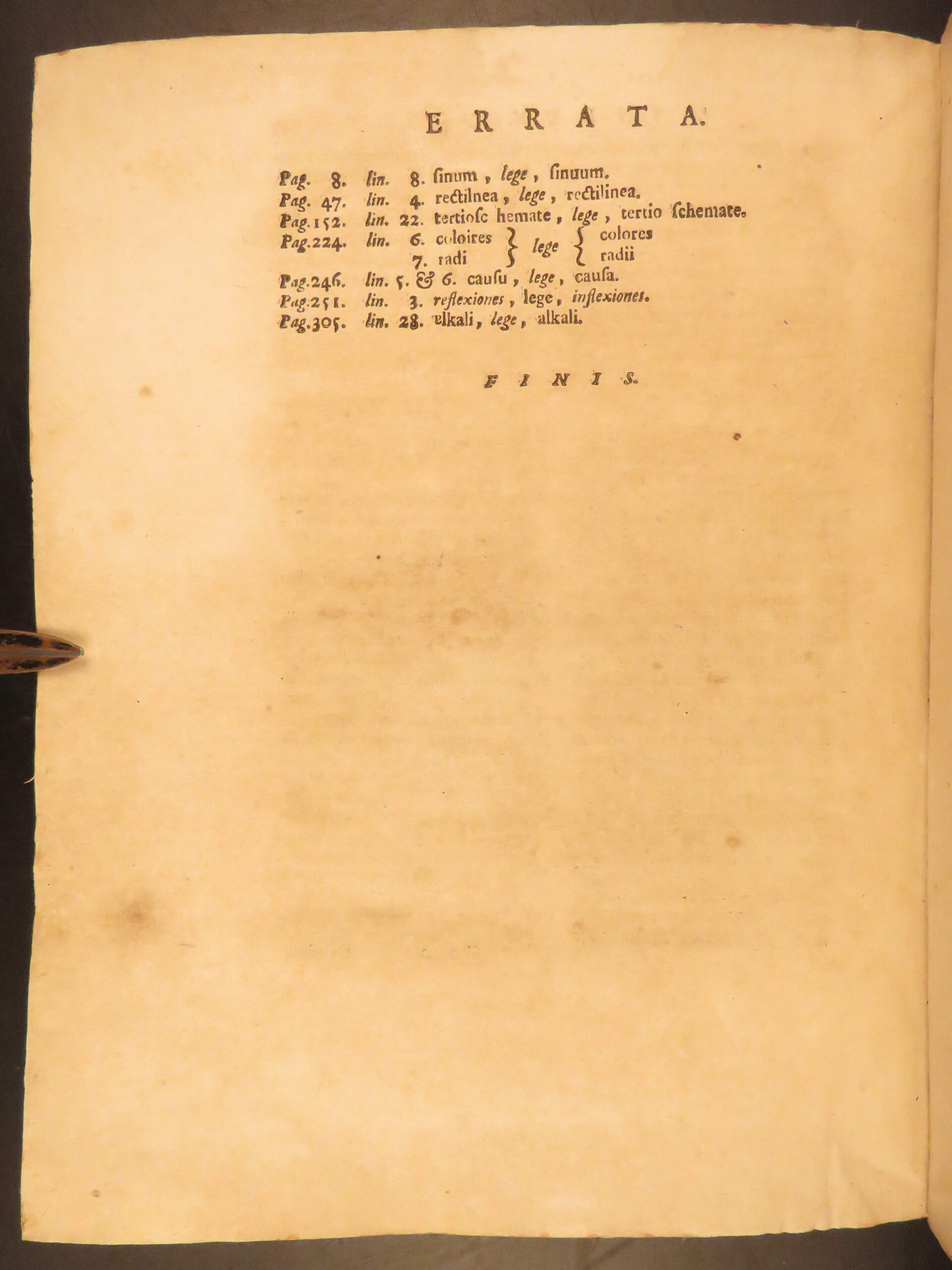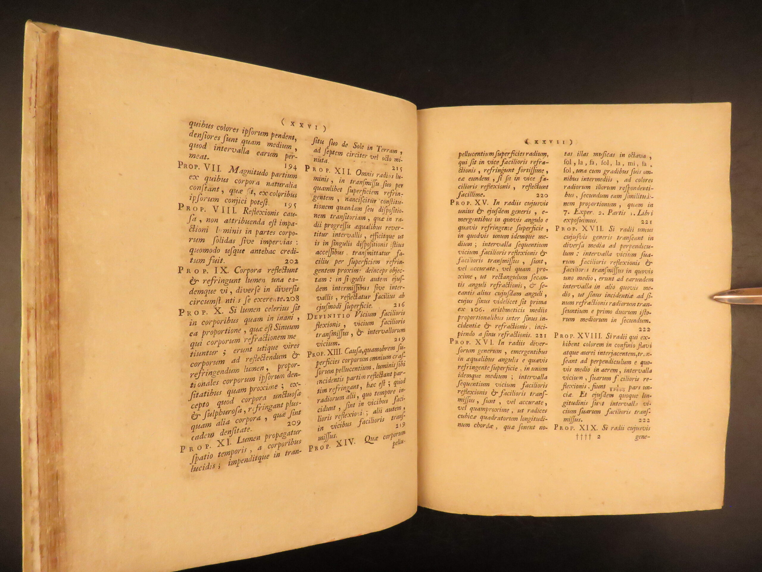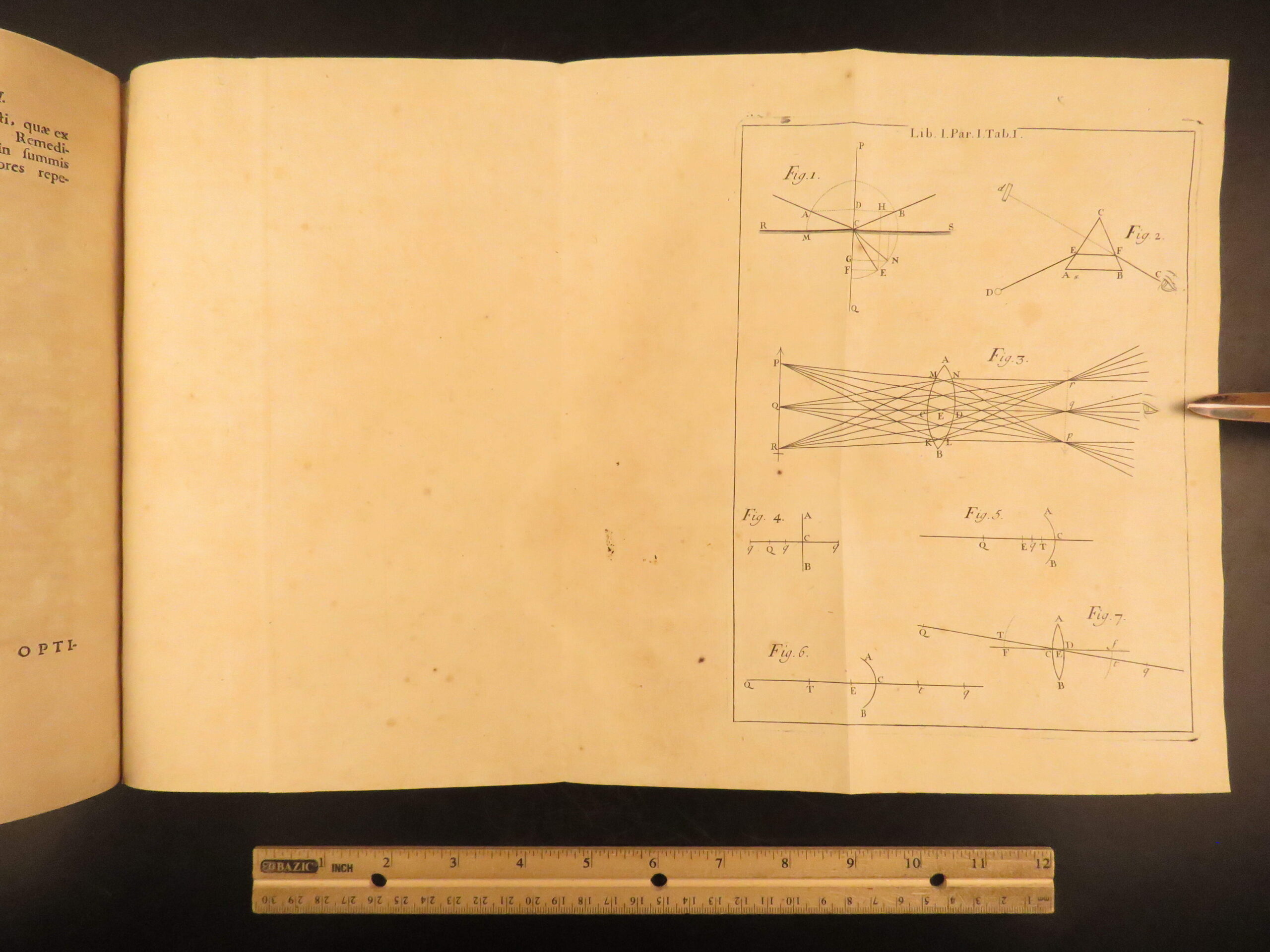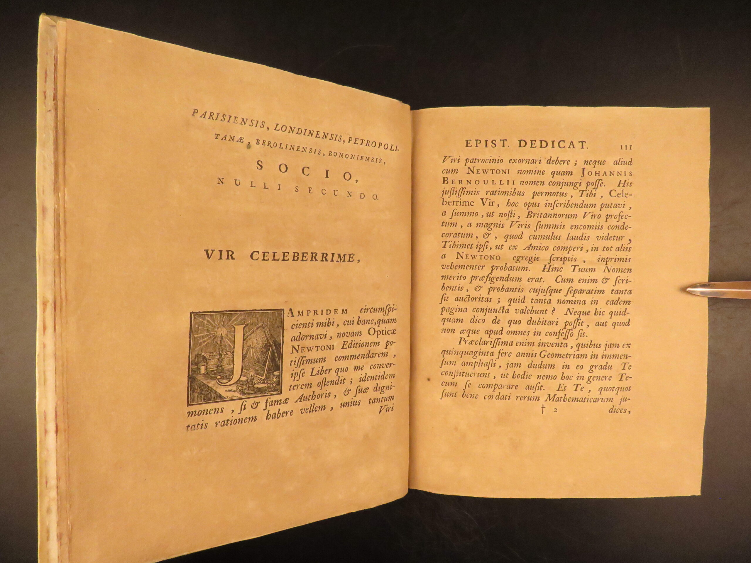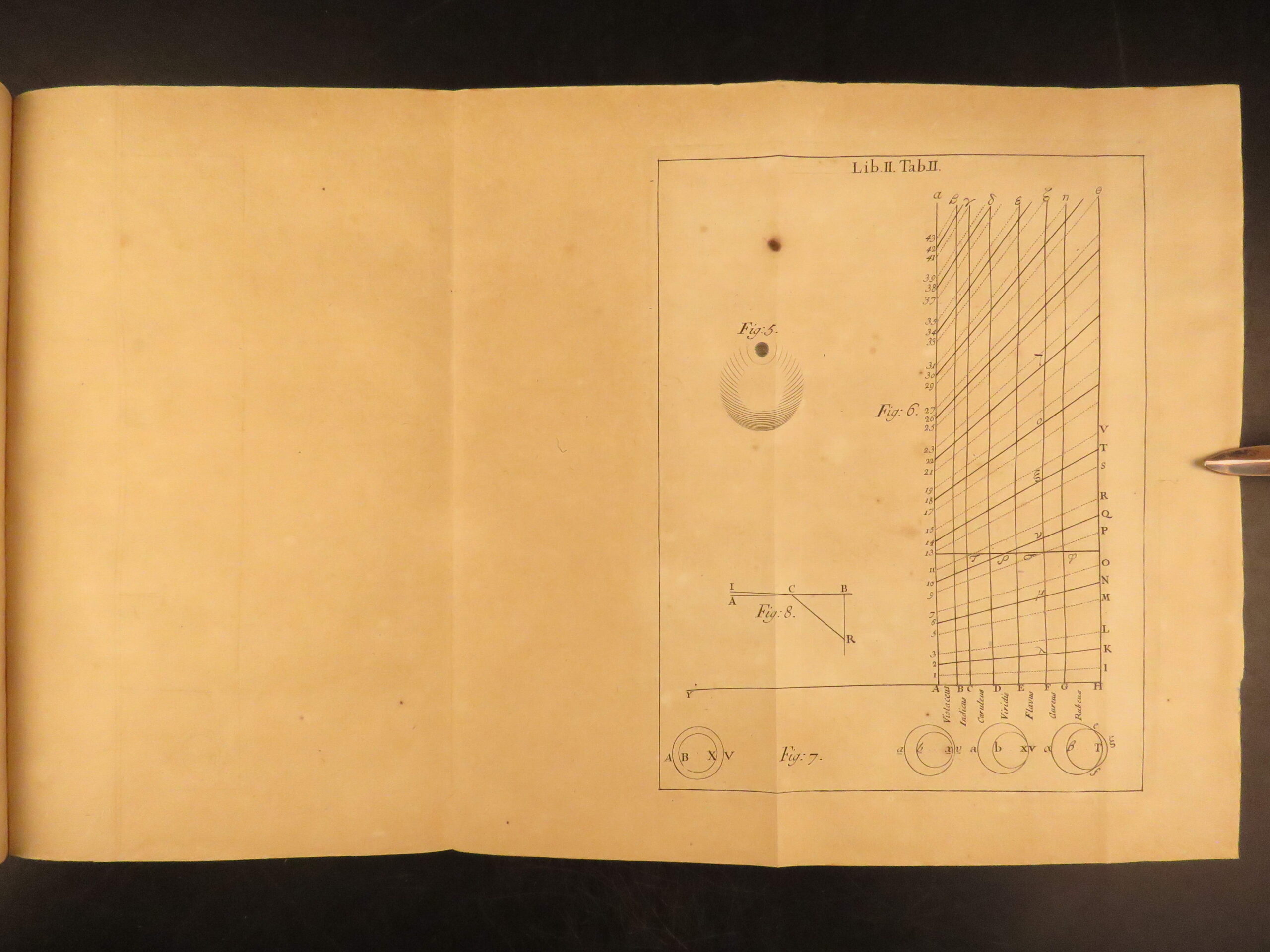 1740 Latin edition of Newton’s Optice with 12 folding engravings, translated by Samuel Clarke and printed in Lausanne and Geneva in full vellum binding.