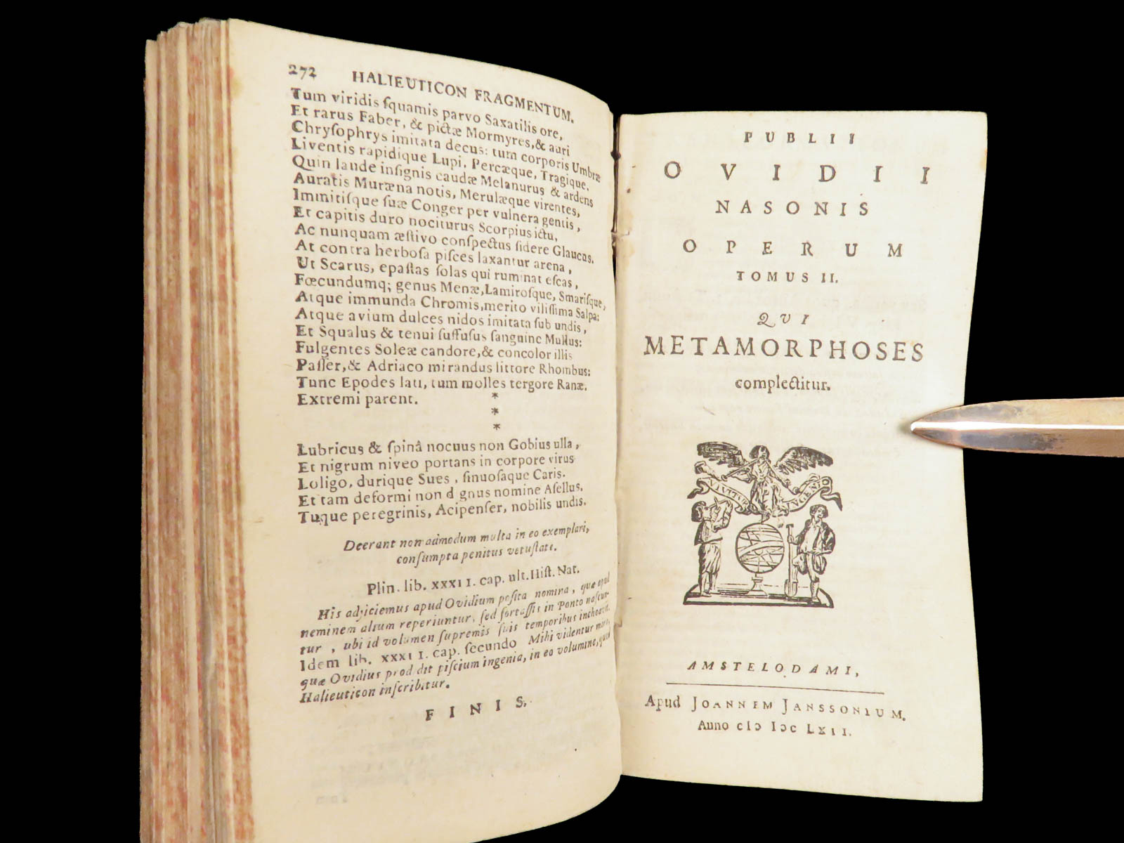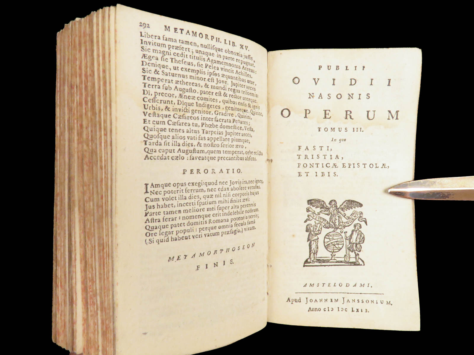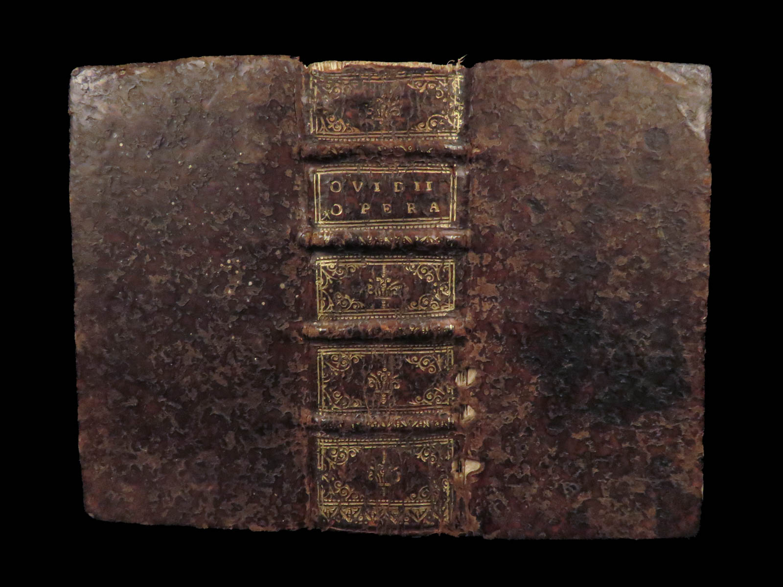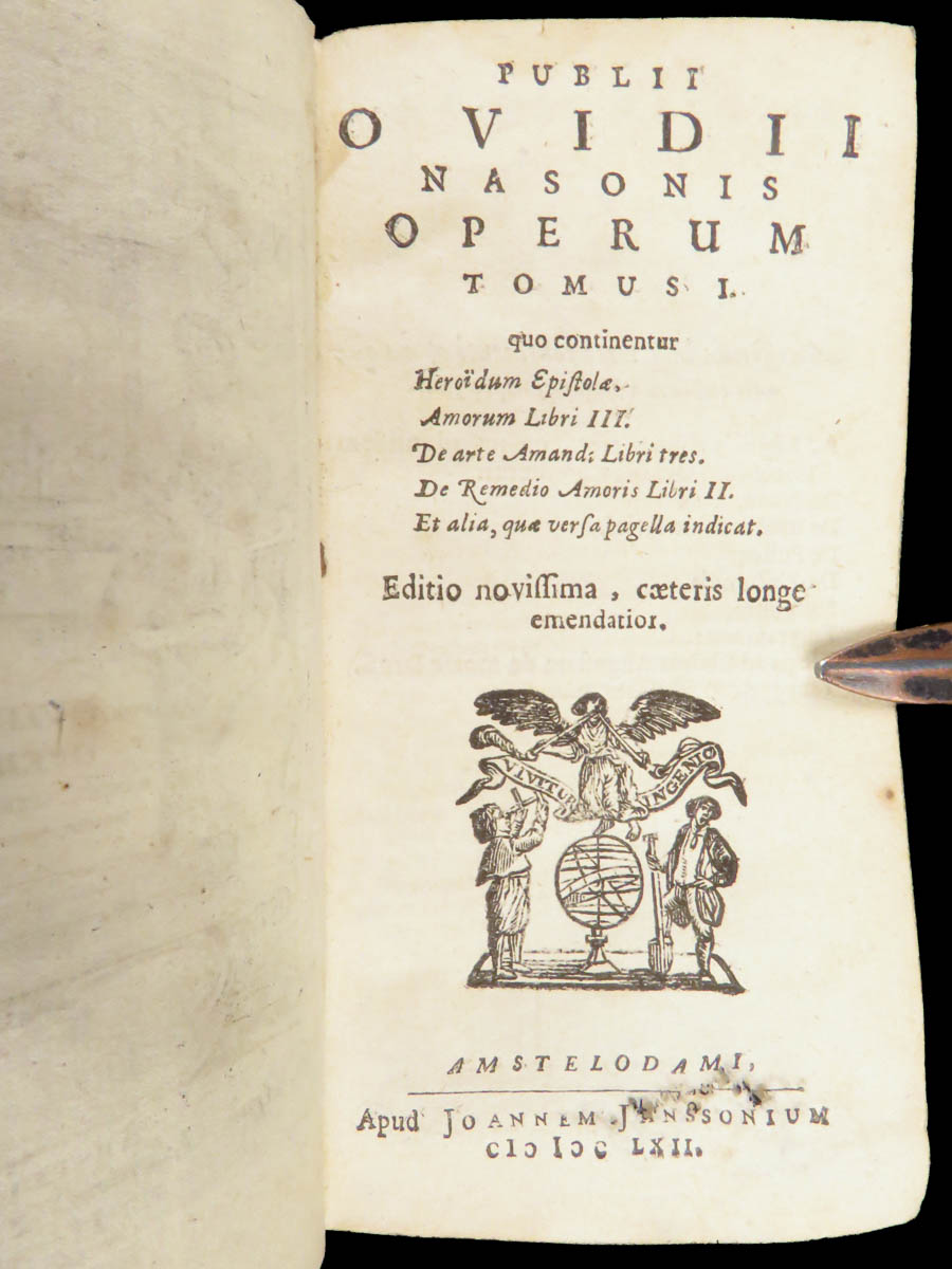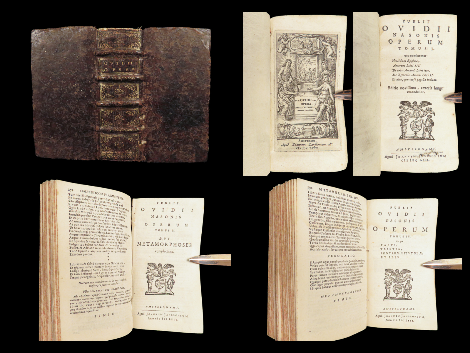 Ovid’s full Latin poetic works printed in 1662 by Janssonius in Amsterdam, including Metamorphoses, Heroides, and exile poems, edited by Heinsius in a single full-leather volume.