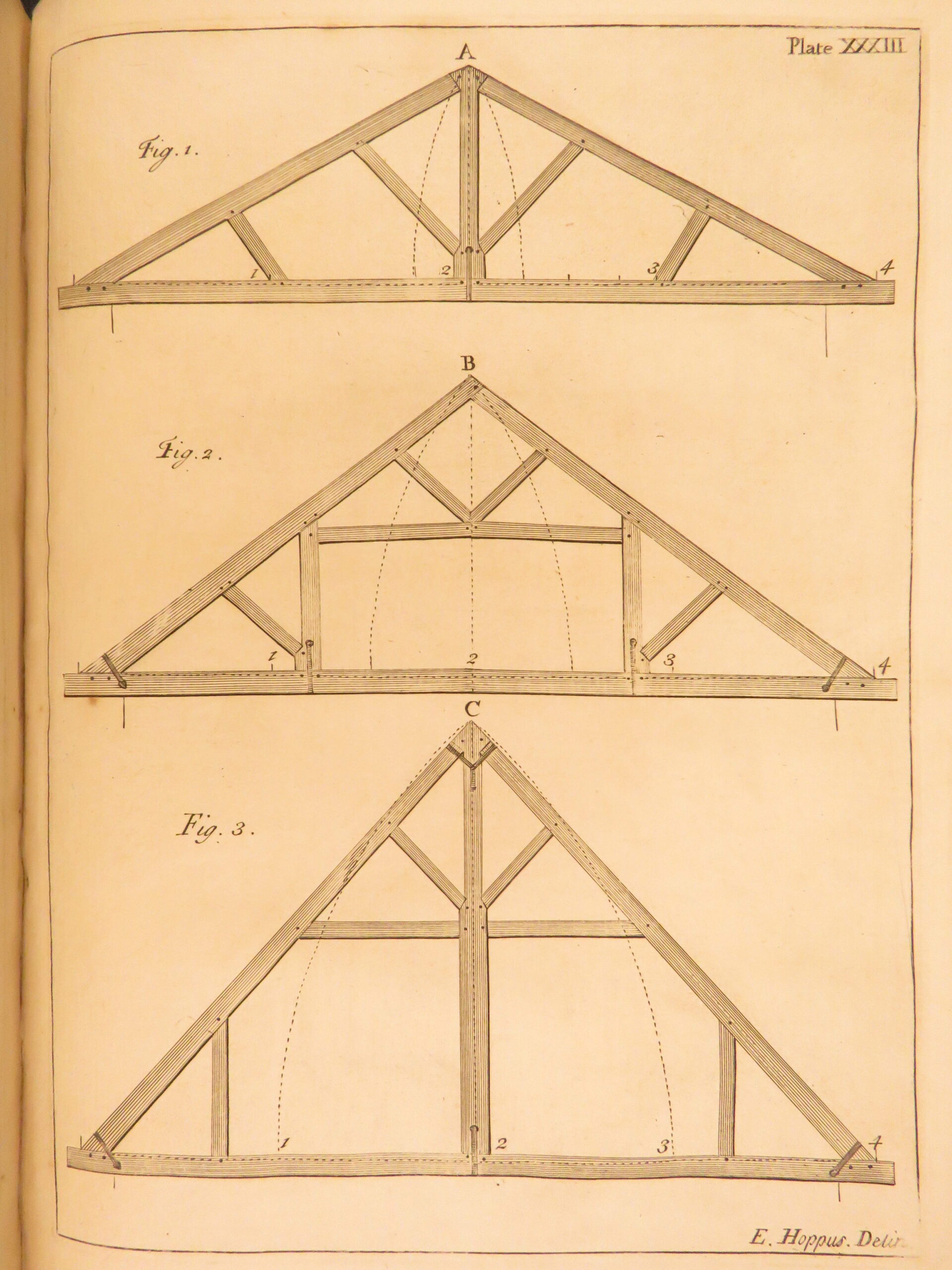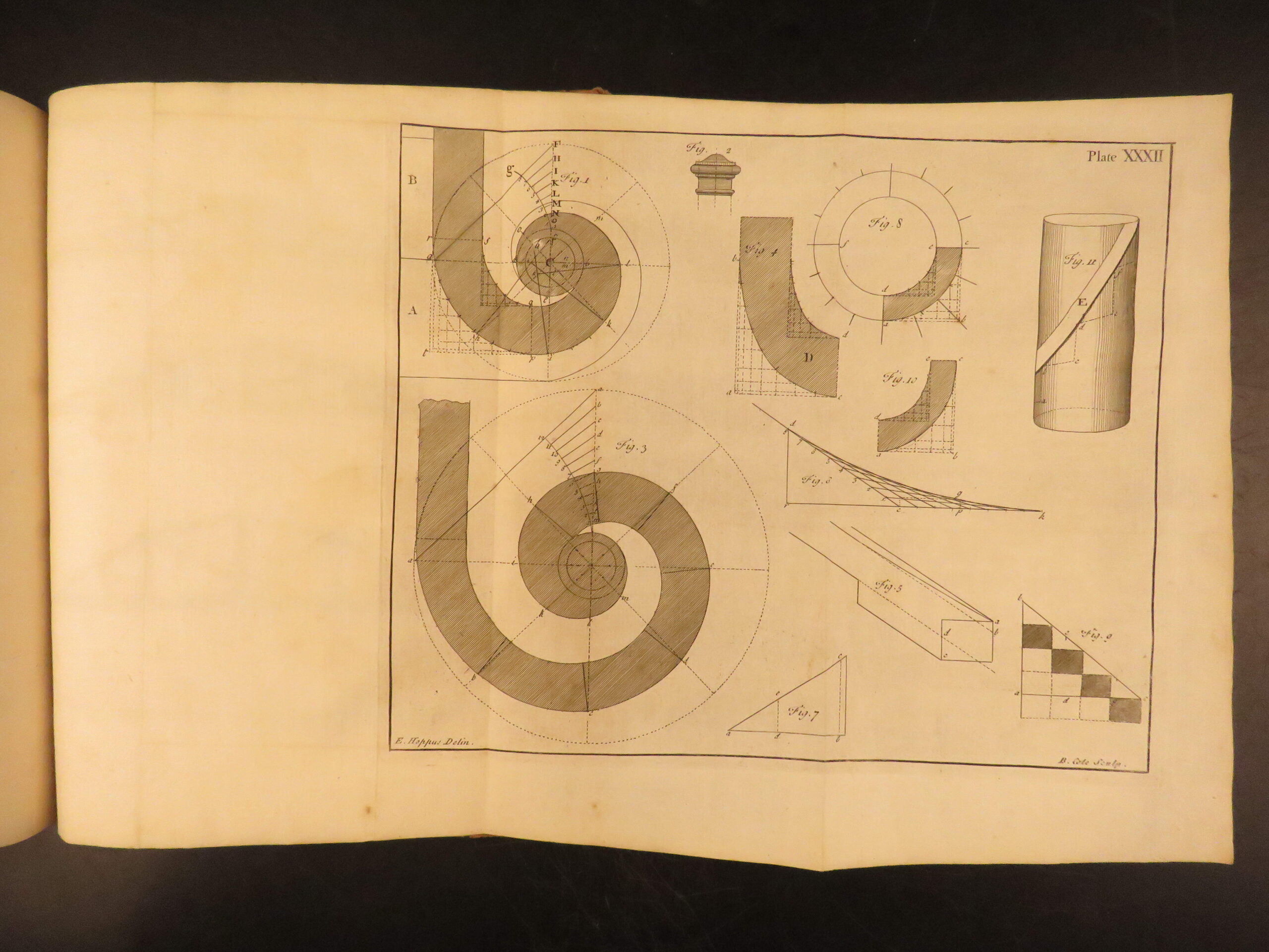 William Salmon’s Palladio Londinensis was a 17th-century building and mathematics manual. This book, more commonly known as ‘The London Art of Building’, was based on the teachings of architectural giants Vignola, Palladio, and Vitruvius. It frequently references Vigonla’s “Five Orders” offering instruction and direction for bricklayers, masons, carpenters, and all other sorts of tradesmen. This work contains dozens of numerous, folding engravings with hundreds of figures illustrating geometric problems, building plans, column construction, door frames, trusses, and much more!