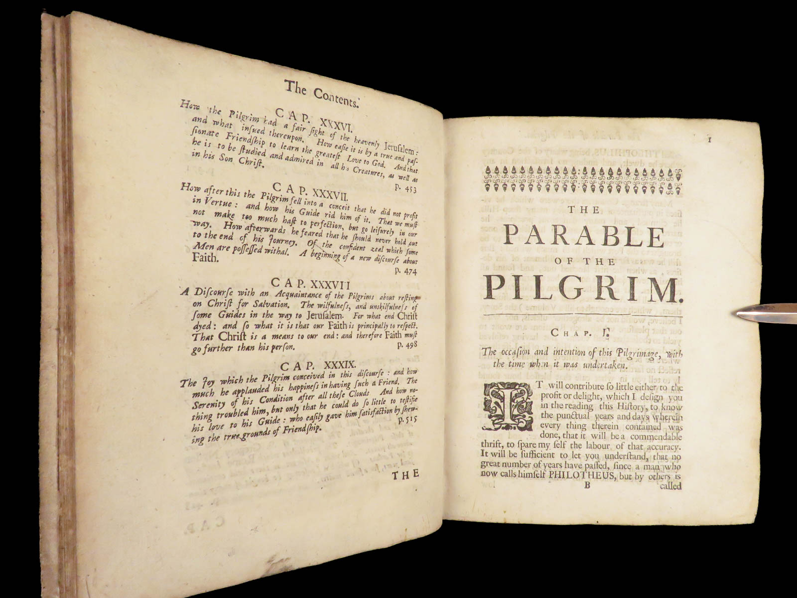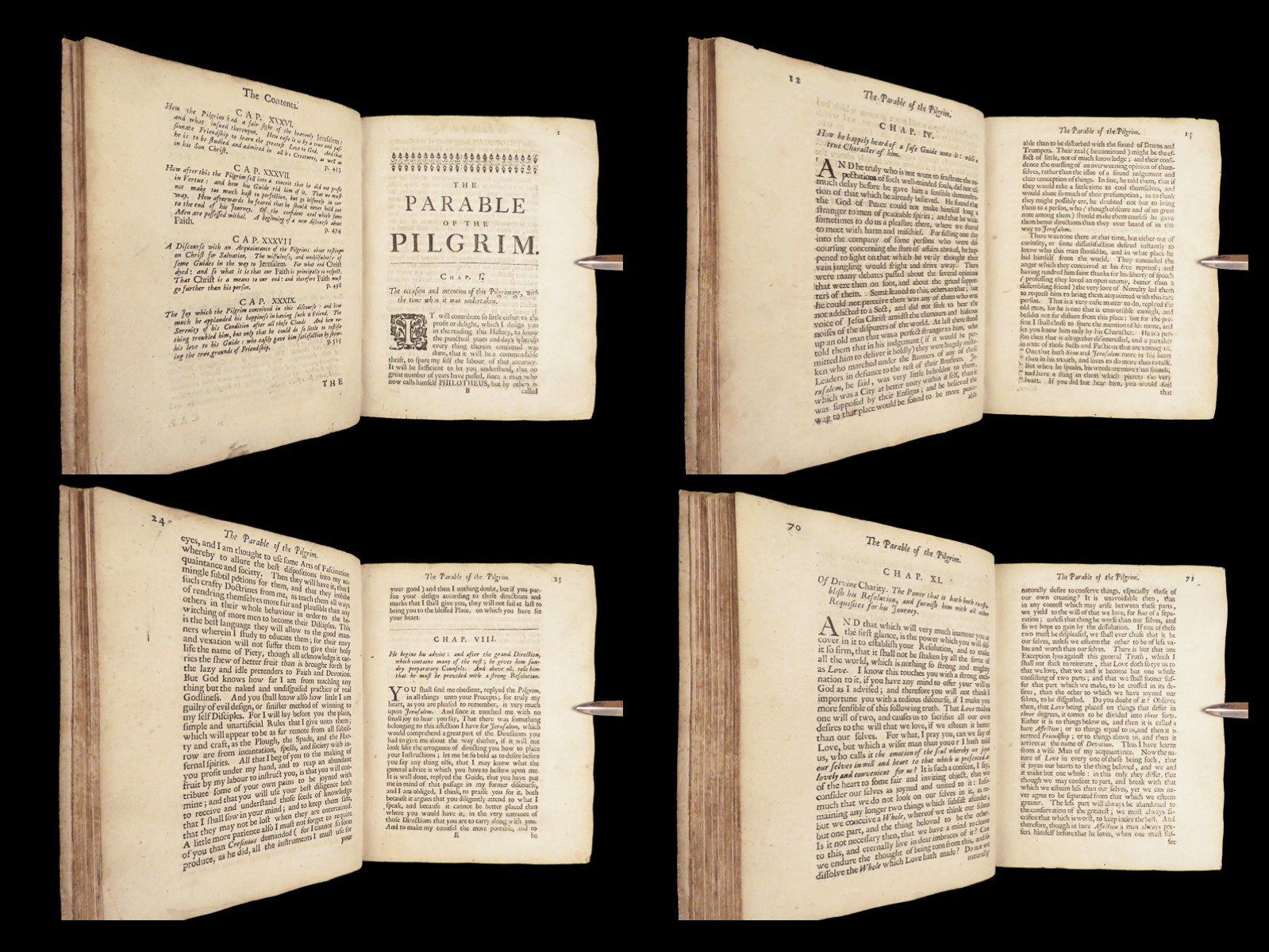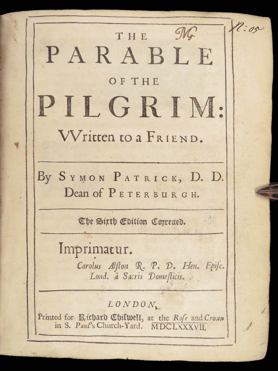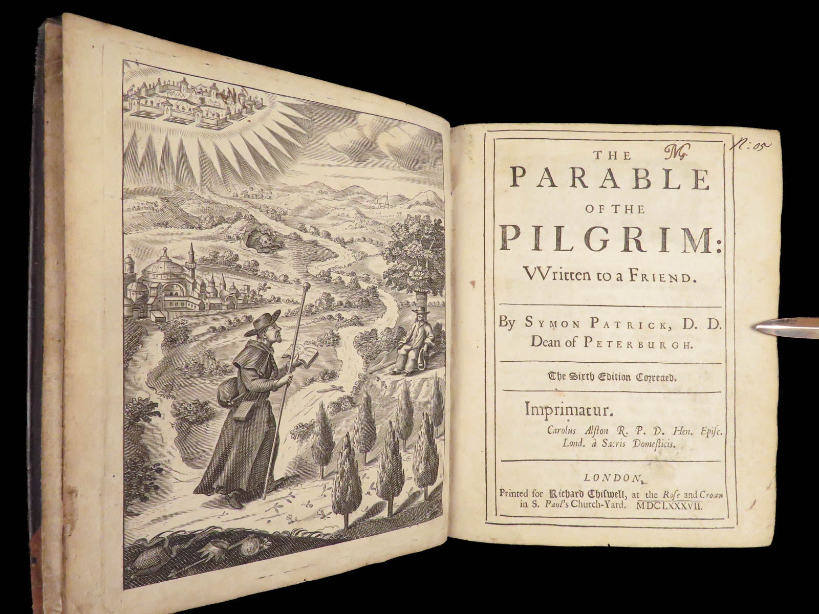 1687 sixth edition of Simon Patrick’s The Parable of the Pilgrim, a 17th-century Anglican devotional allegory printed in London by Richard Chiswell, in full leather with engraved frontispiece.