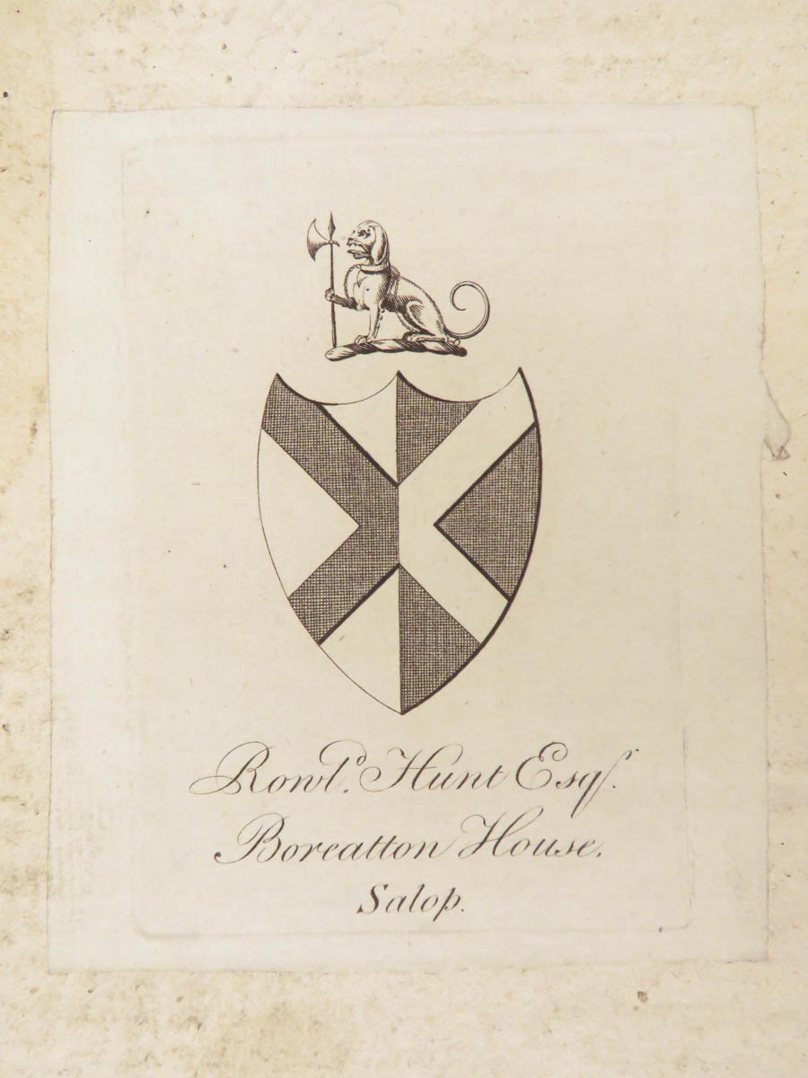 - Provenance: Bookplate of Rowland Hunt Esq., Boreatton House, Salop