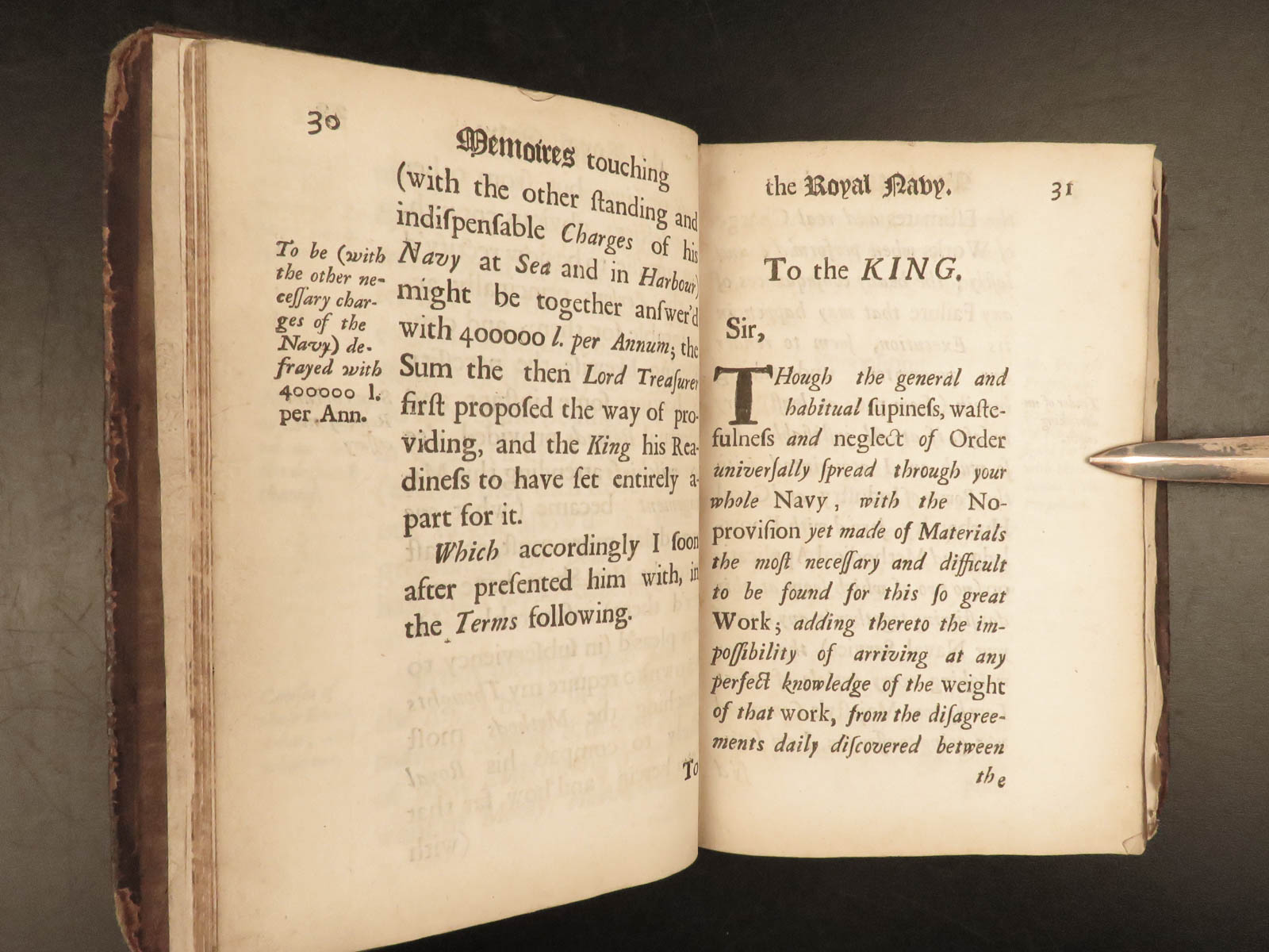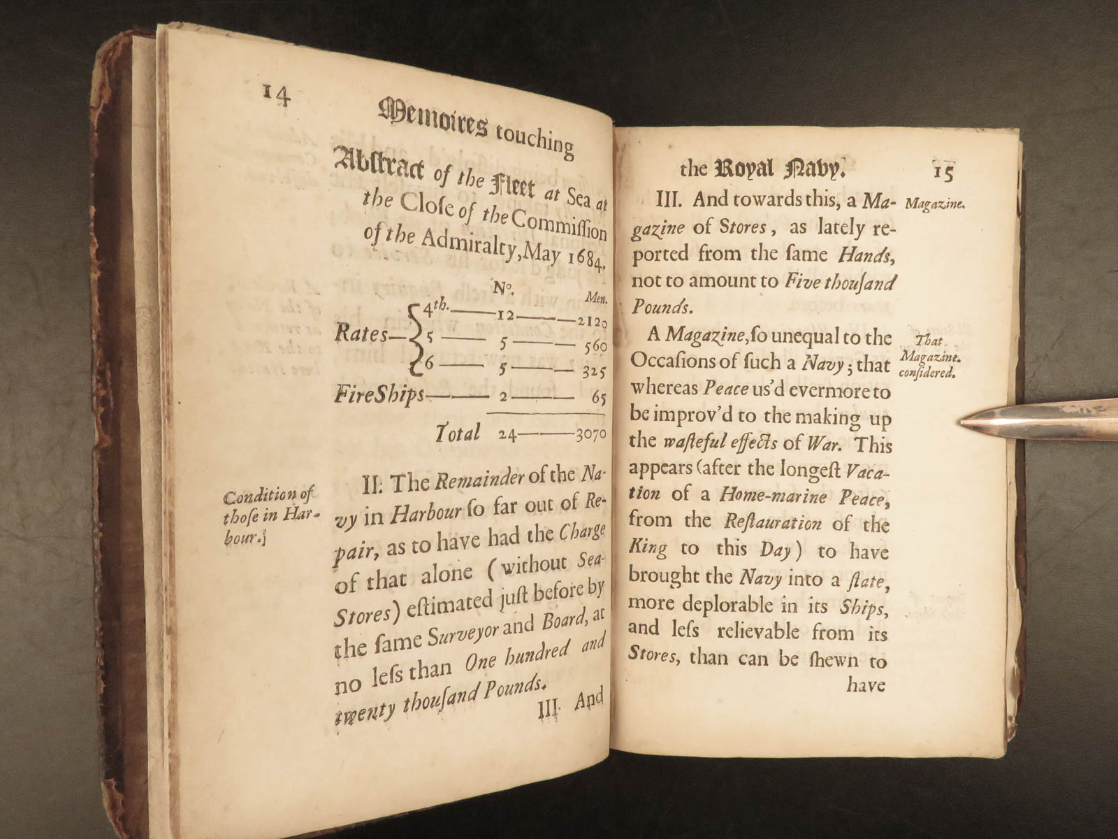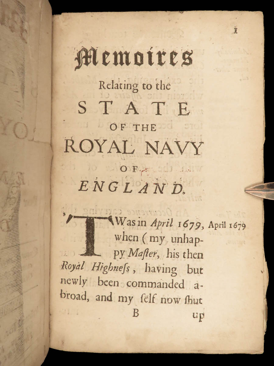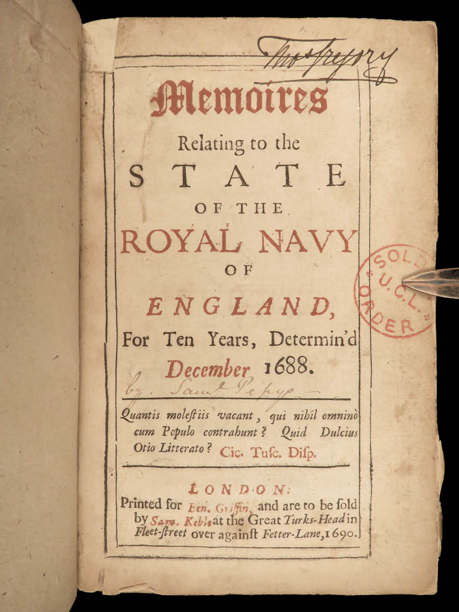 Interestingly, only one work of Pepys was published during his lifetime. His ‘State of the Royal Navy of England’ was published in 1690 and covers the state of the Royal Navy leading up to the Glorious Revolution and his demands for change. Notable topics include: