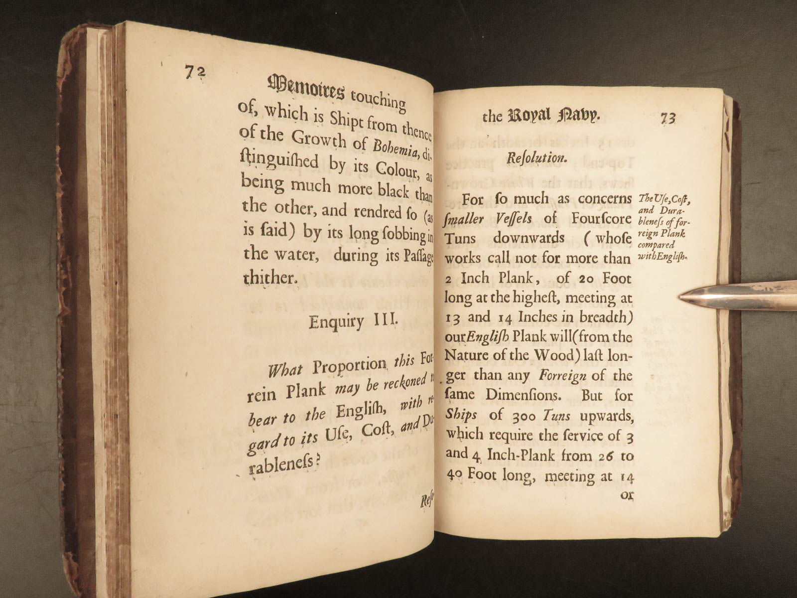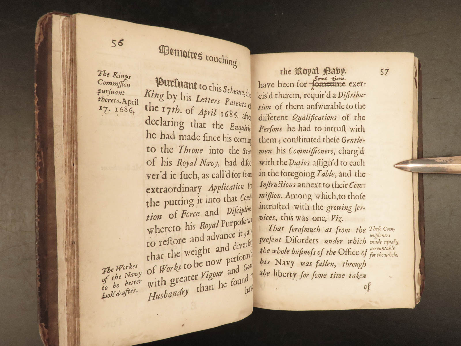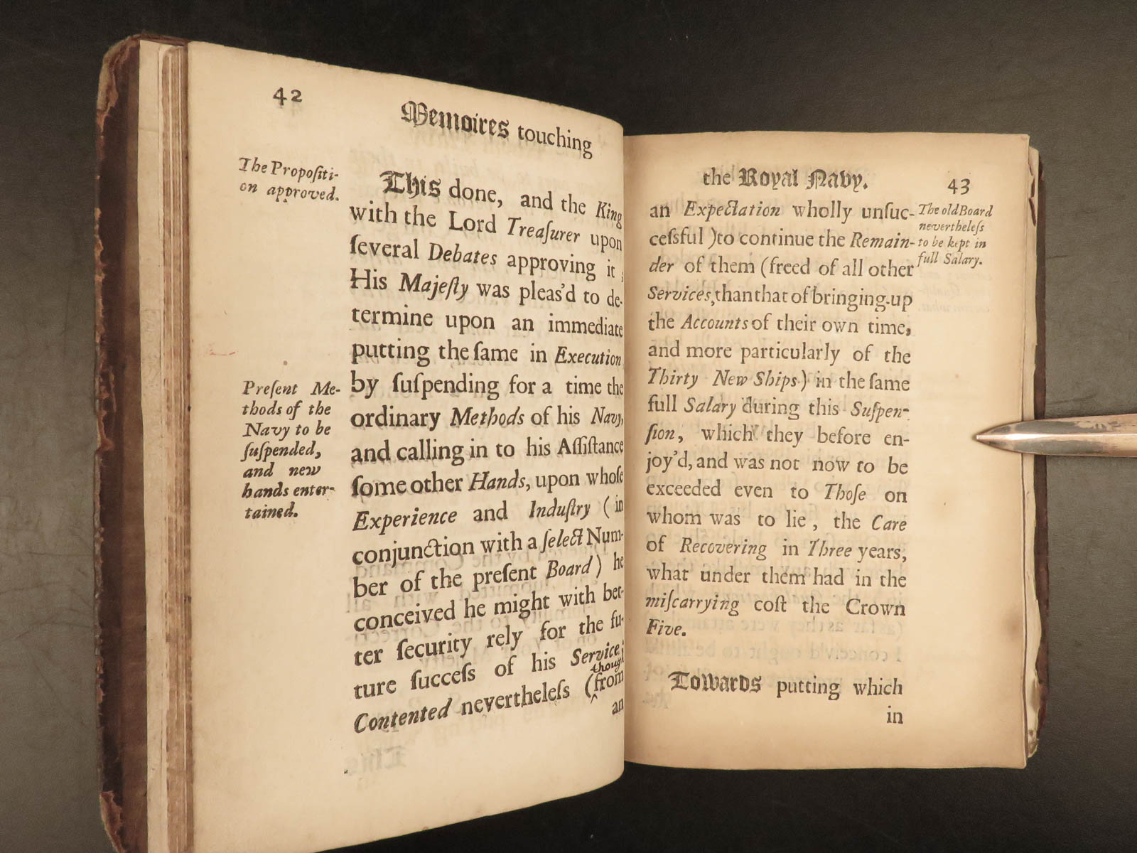 Interestingly, only one work of Pepys was published during his lifetime. His ‘State of the Royal Navy of England’ was published in 1690 and covers the state of the Royal Navy leading up to the Glorious Revolution and his demands for change. Notable topics include: