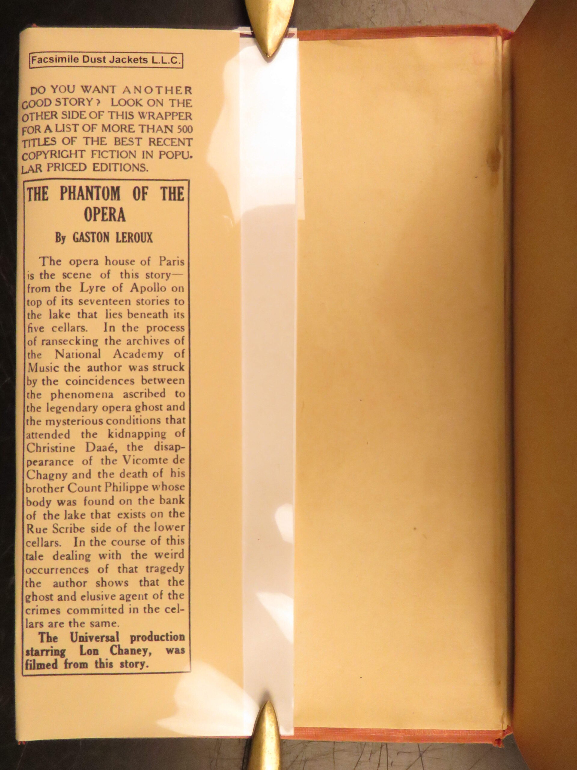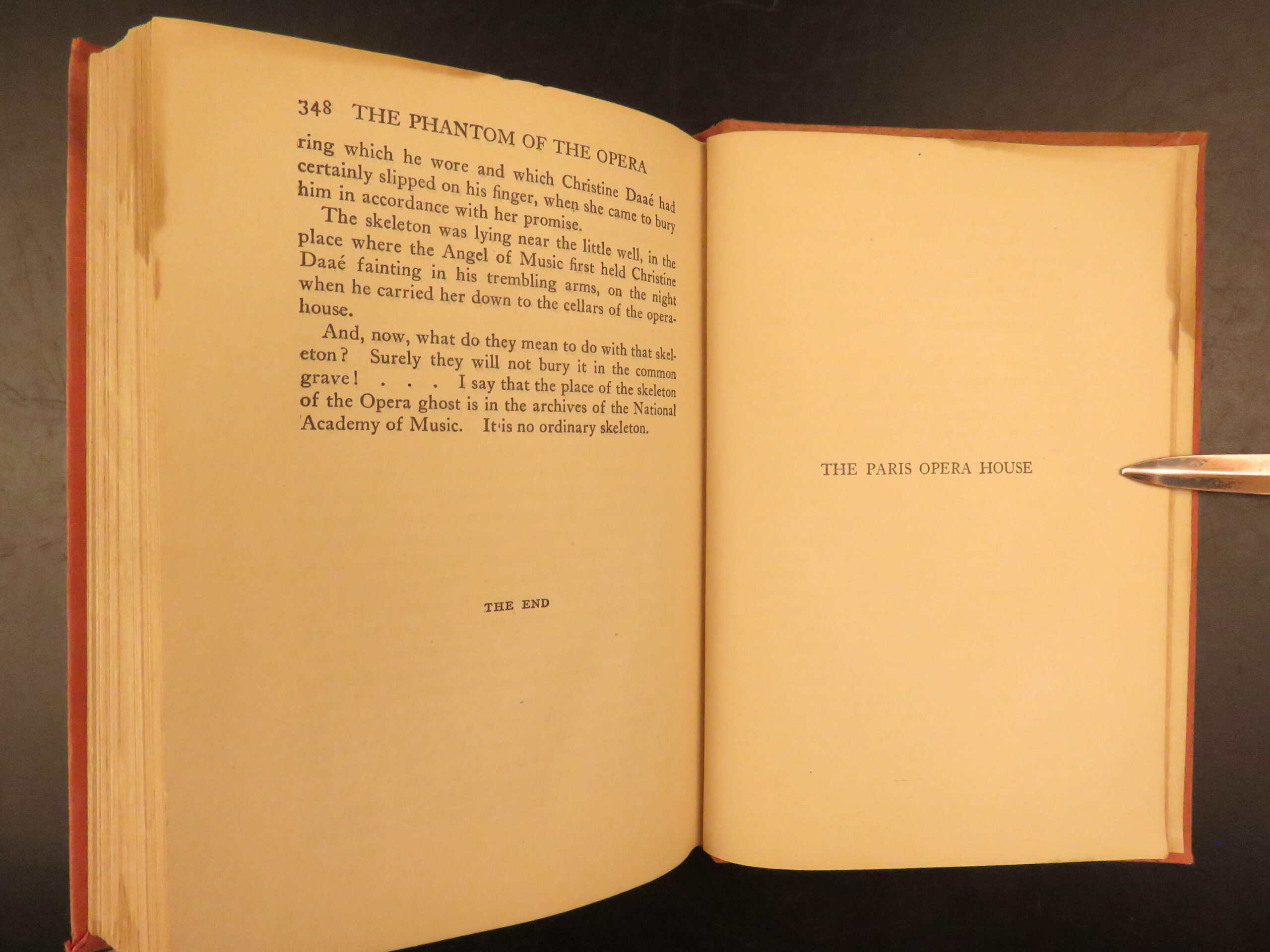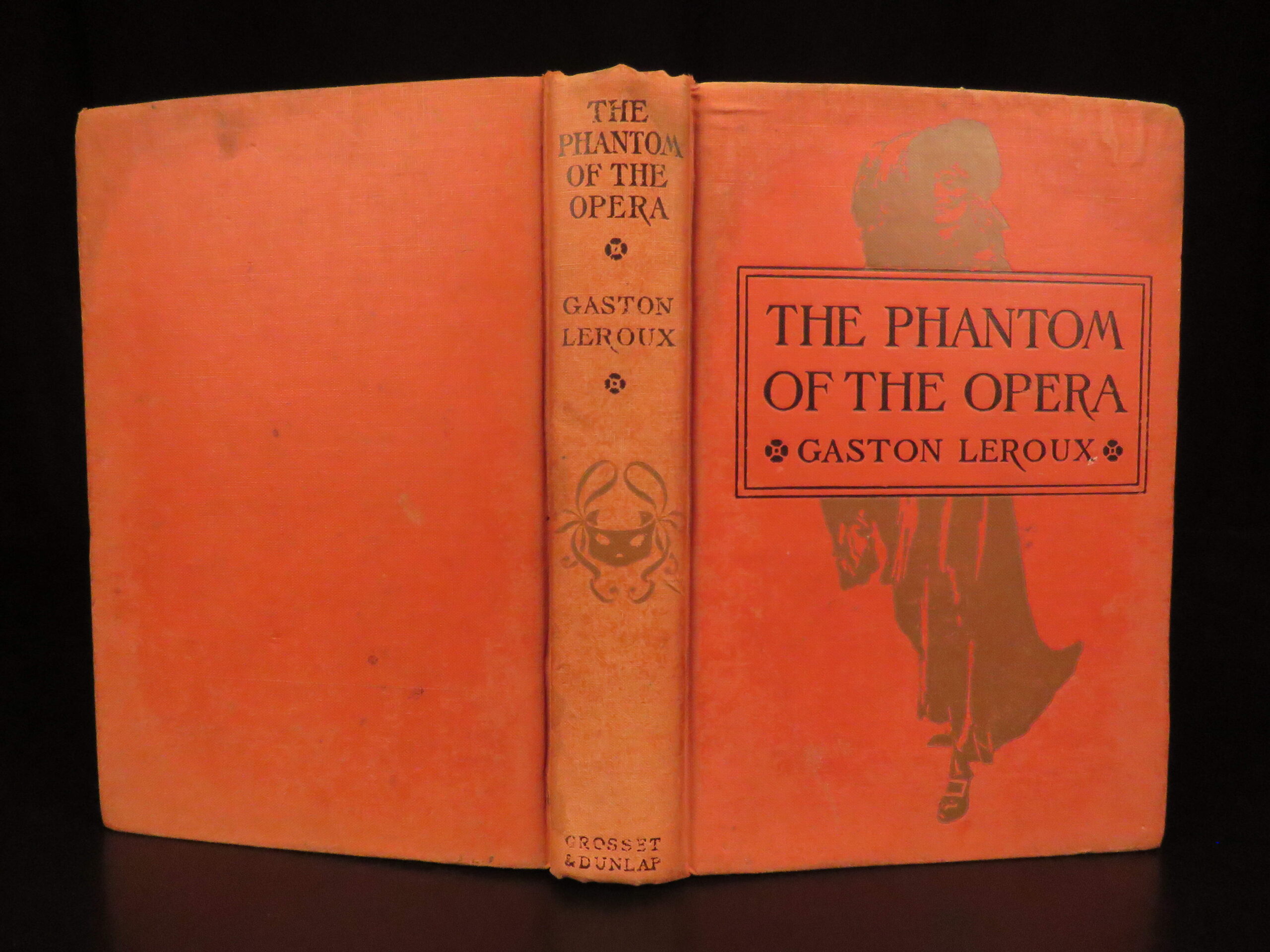 This early edition of The Phantom of the Opera by Gaston Leroux tells the story of a horrifically disfigured man who lives beneath the Paris Opera House falling obsessively in love with Christine, a young opera singer. This novel is styled as a Gothic horror, with the Phantom descending into increasingly mad and violent tactics to gain Christine’s love, combined with elements of the mystery and romance genres. The text is accompanied by 4 double page color plates and a color frontispiece by famous illustrator Andre Castaigne and was issued by Grosset & Dunlap with a unique binding of the publisher’s original red cloth with the Phantom on the cover.