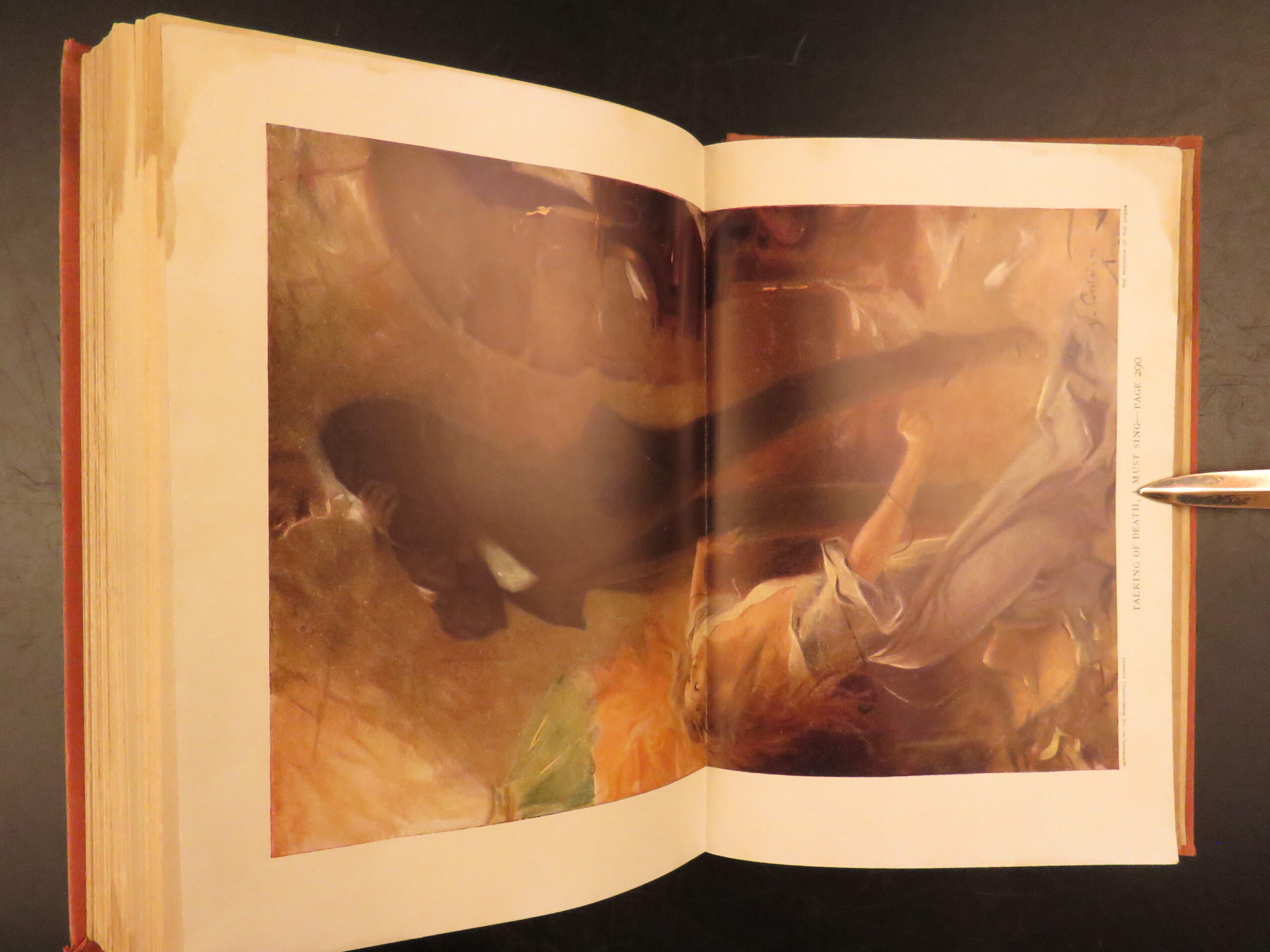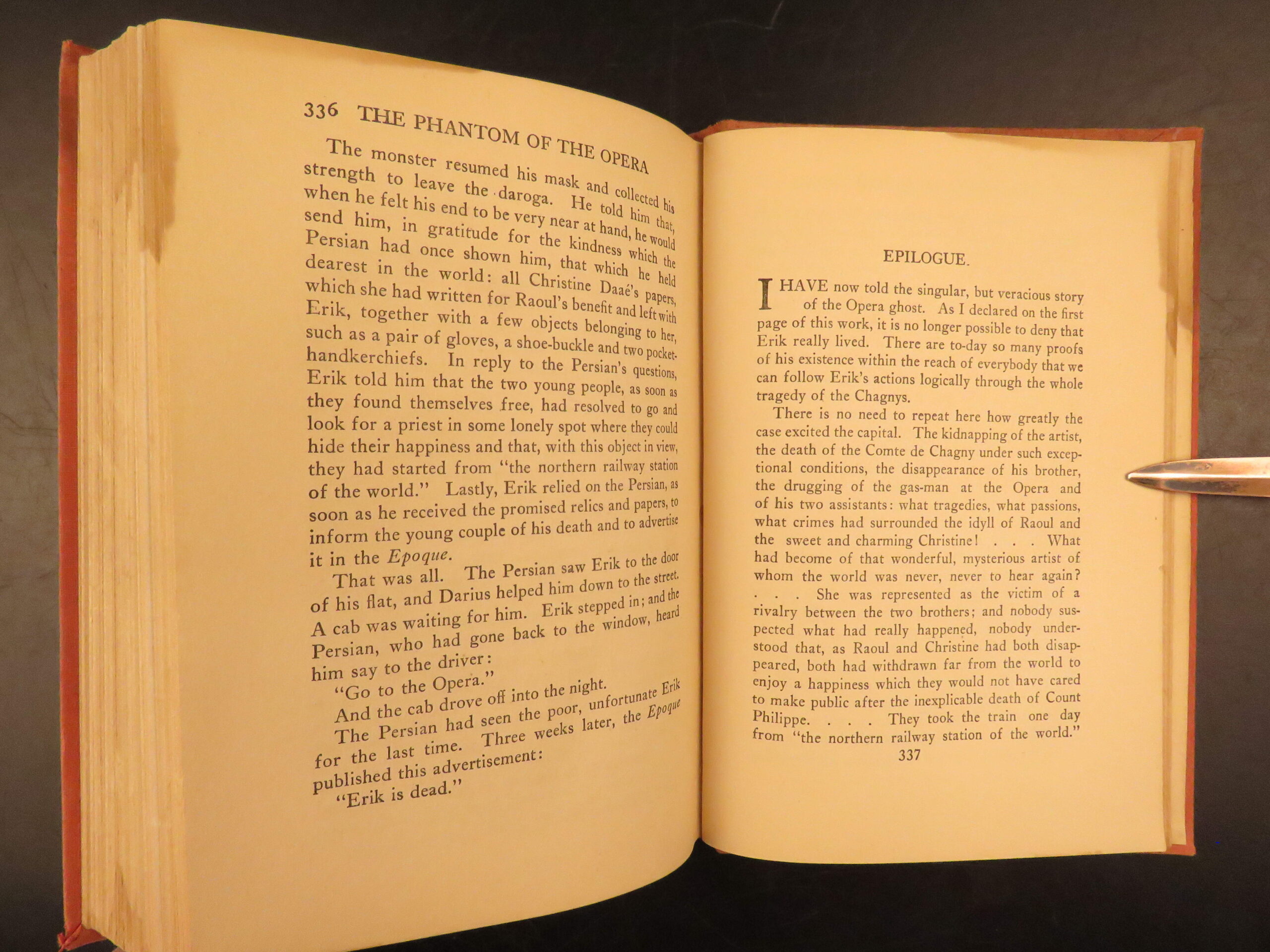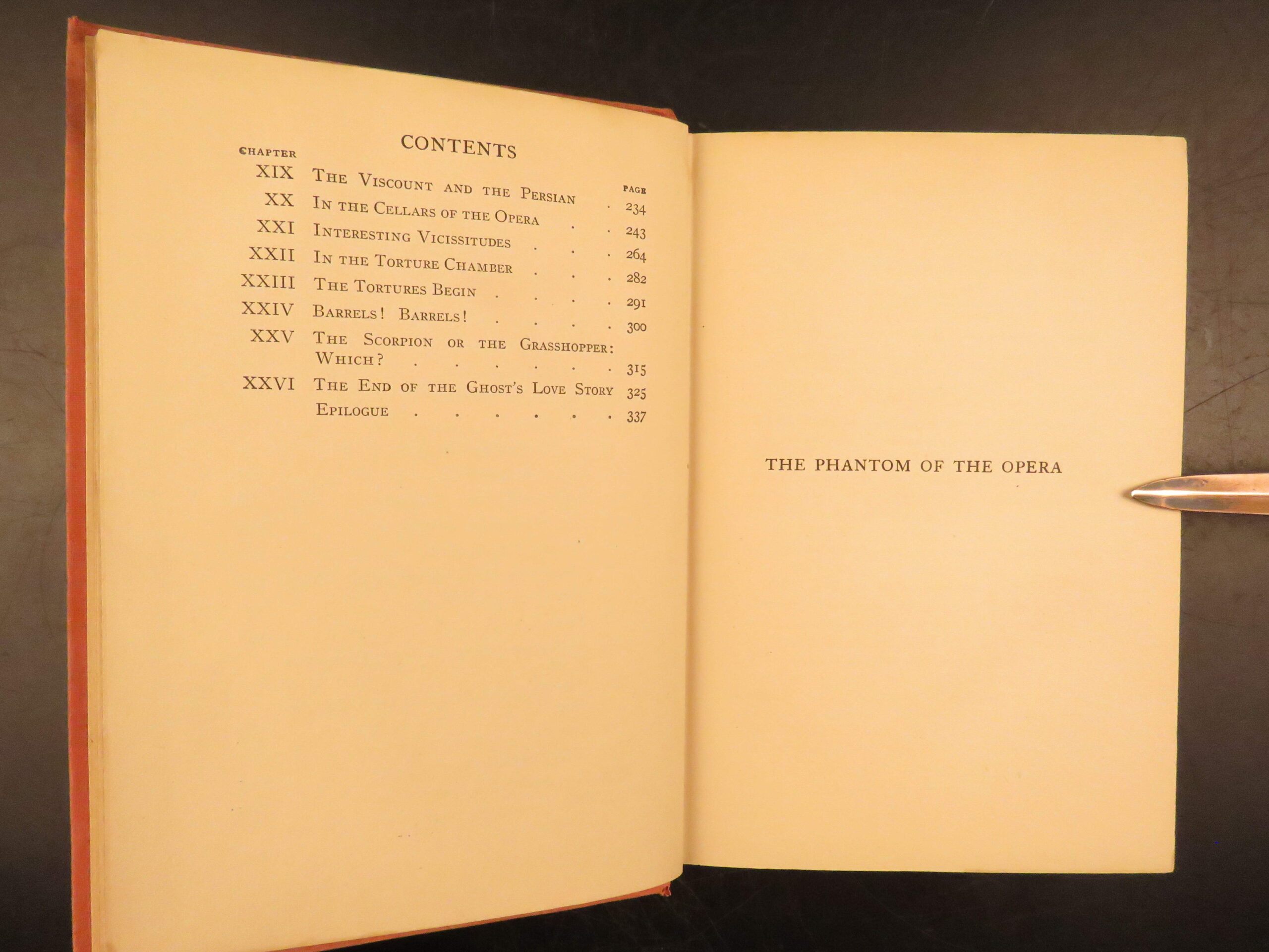 This early edition of The Phantom of the Opera by Gaston Leroux tells the story of a horrifically disfigured man who lives beneath the Paris Opera House falling obsessively in love with Christine, a young opera singer. This novel is styled as a Gothic horror, with the Phantom descending into increasingly mad and violent tactics to gain Christine’s love, combined with elements of the mystery and romance genres. The text is accompanied by 4 double page color plates and a color frontispiece by famous illustrator Andre Castaigne and was issued by Grosset & Dunlap with a unique binding of the publisher’s original red cloth with the Phantom on the cover.