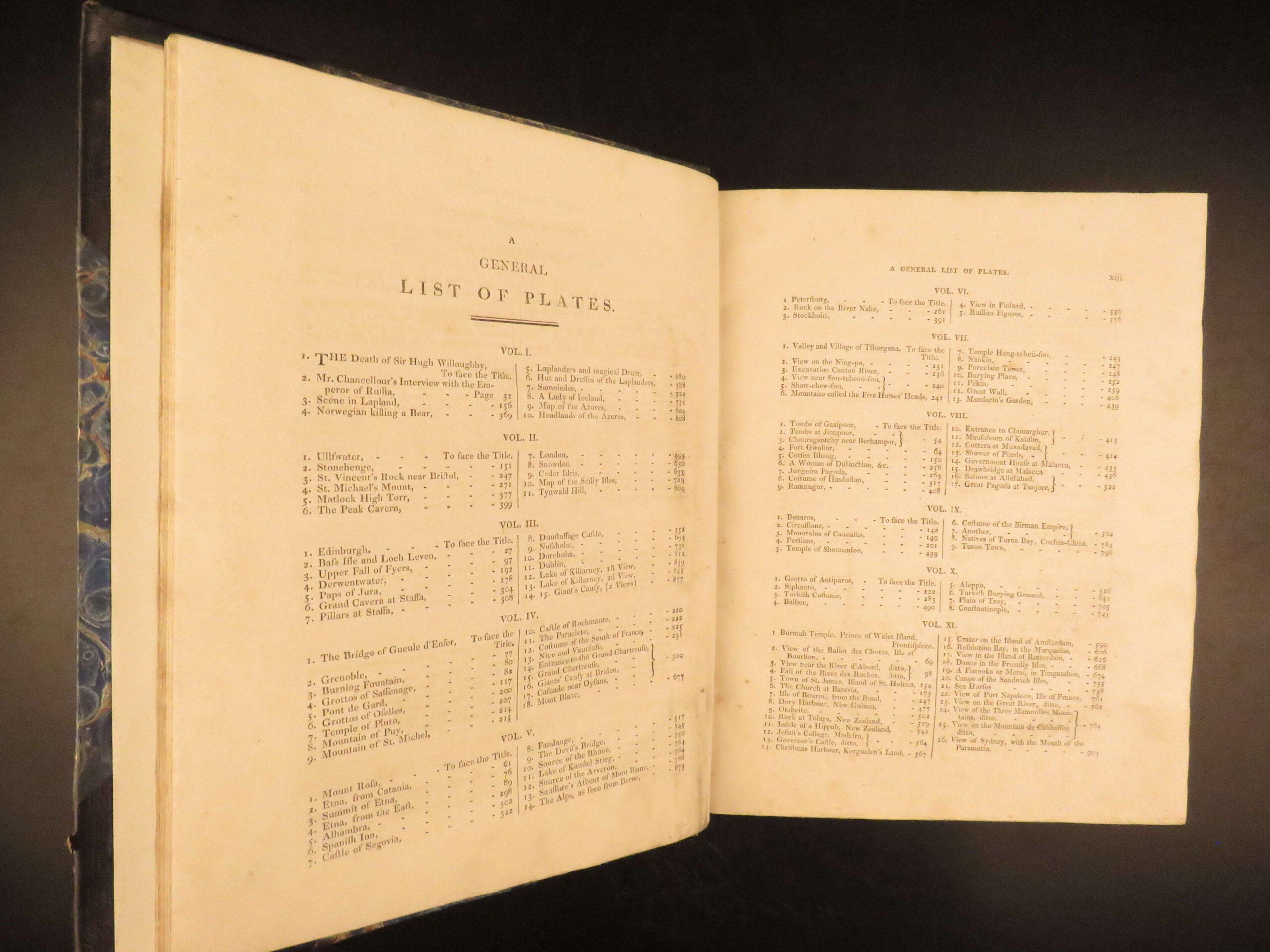 Very good. Leather bindings strong and secure with gilt titles retained on spine. Marbled boards show only mild wear that does not affect the display. Pages and illustrations clean and free of staining and major tears.