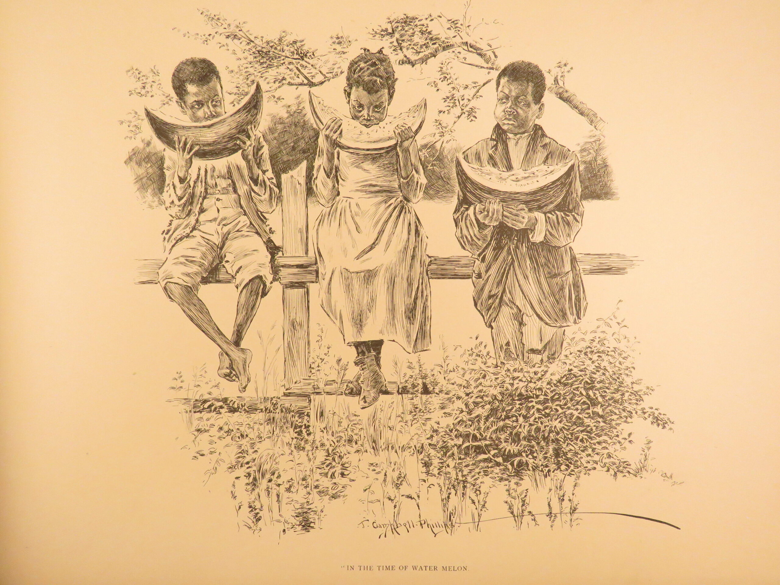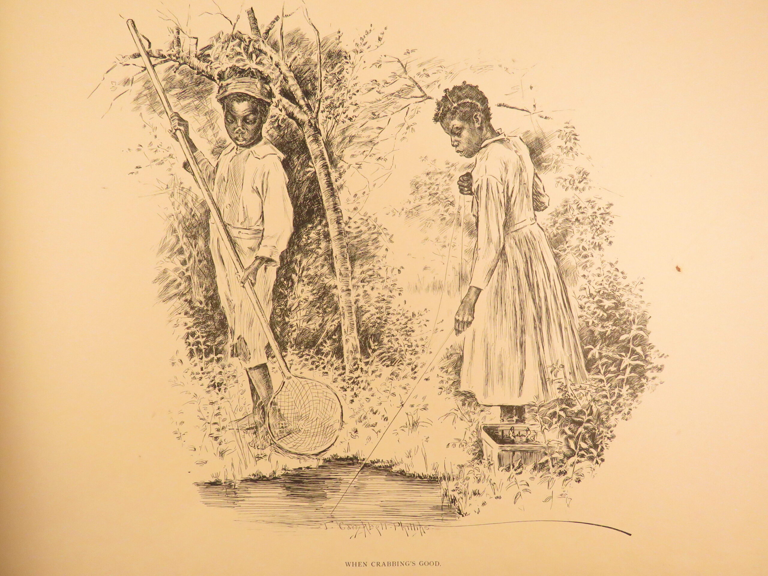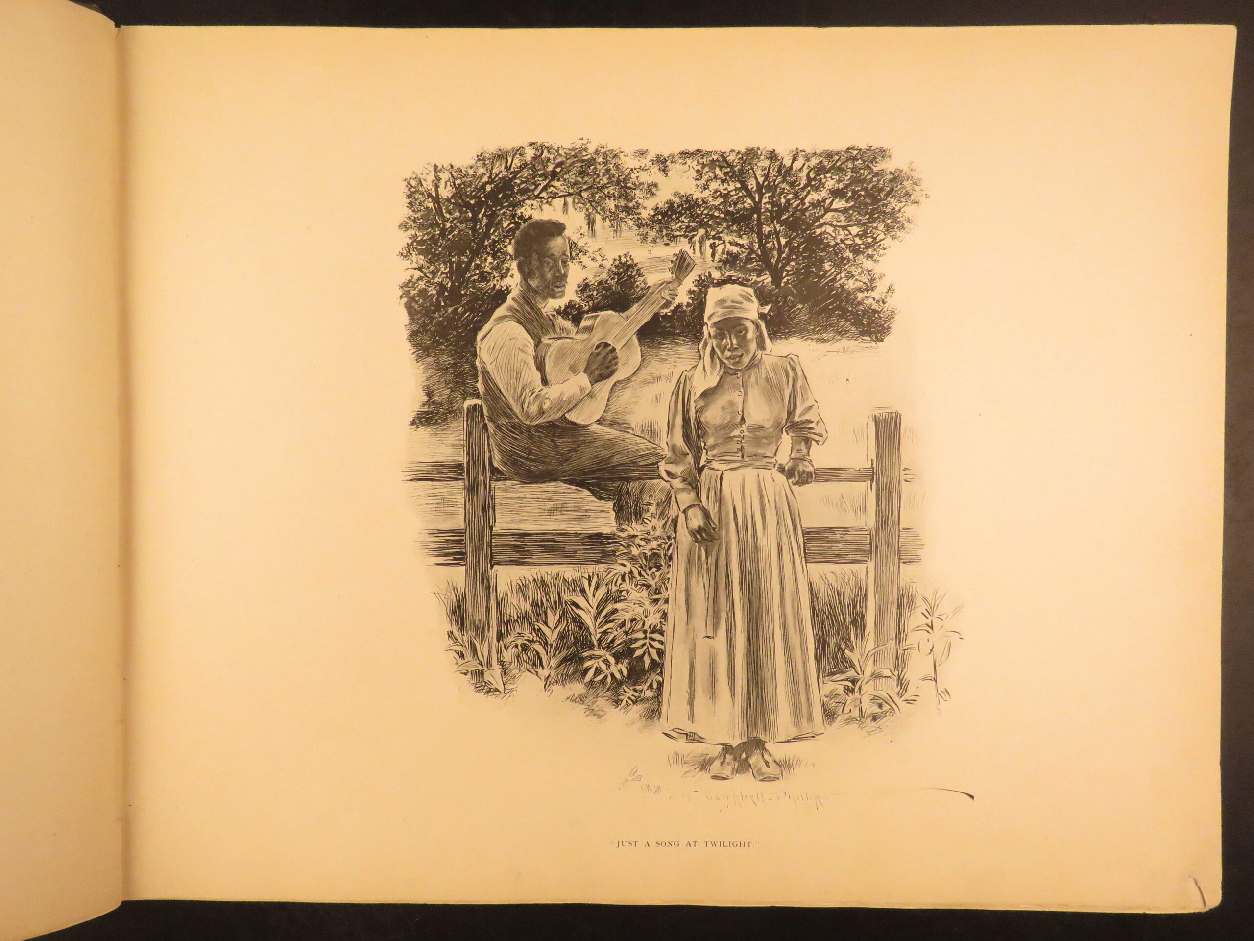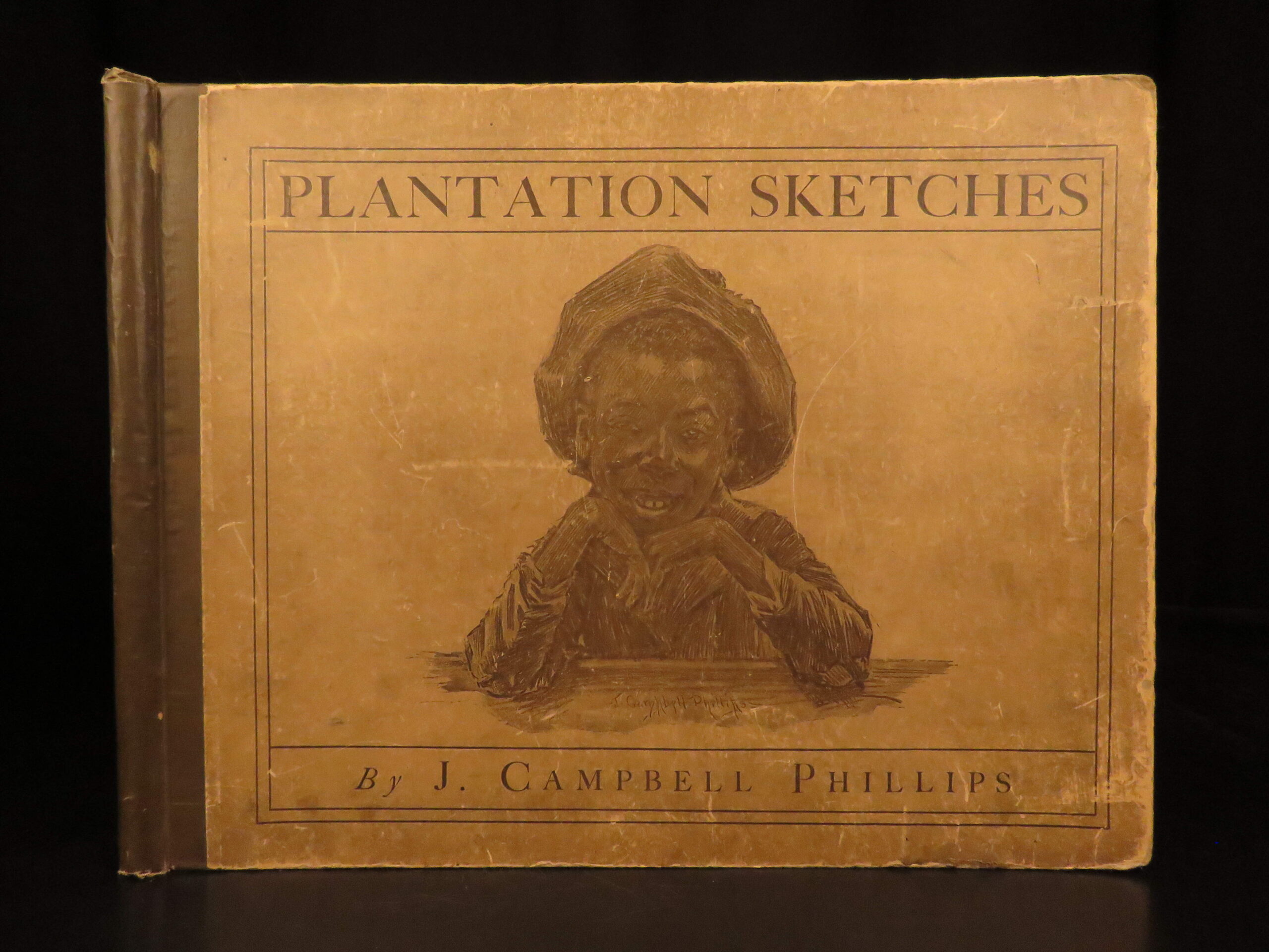 Plantation Sketches by J Campbell Phillips is a rare, 1899 portfolio of artwork depicting scenes associated with plantation and farm life in the American South. Many of the illustrations show slaves and slave children in their day-to-day life in a “comic style” presentation. The is merely a collection of plates rather than written descriptions, nevertheless, this work is a highly desirable and considerably valuable piece of Reconstruction Era art depicting African American and black Americans in the post-war South.