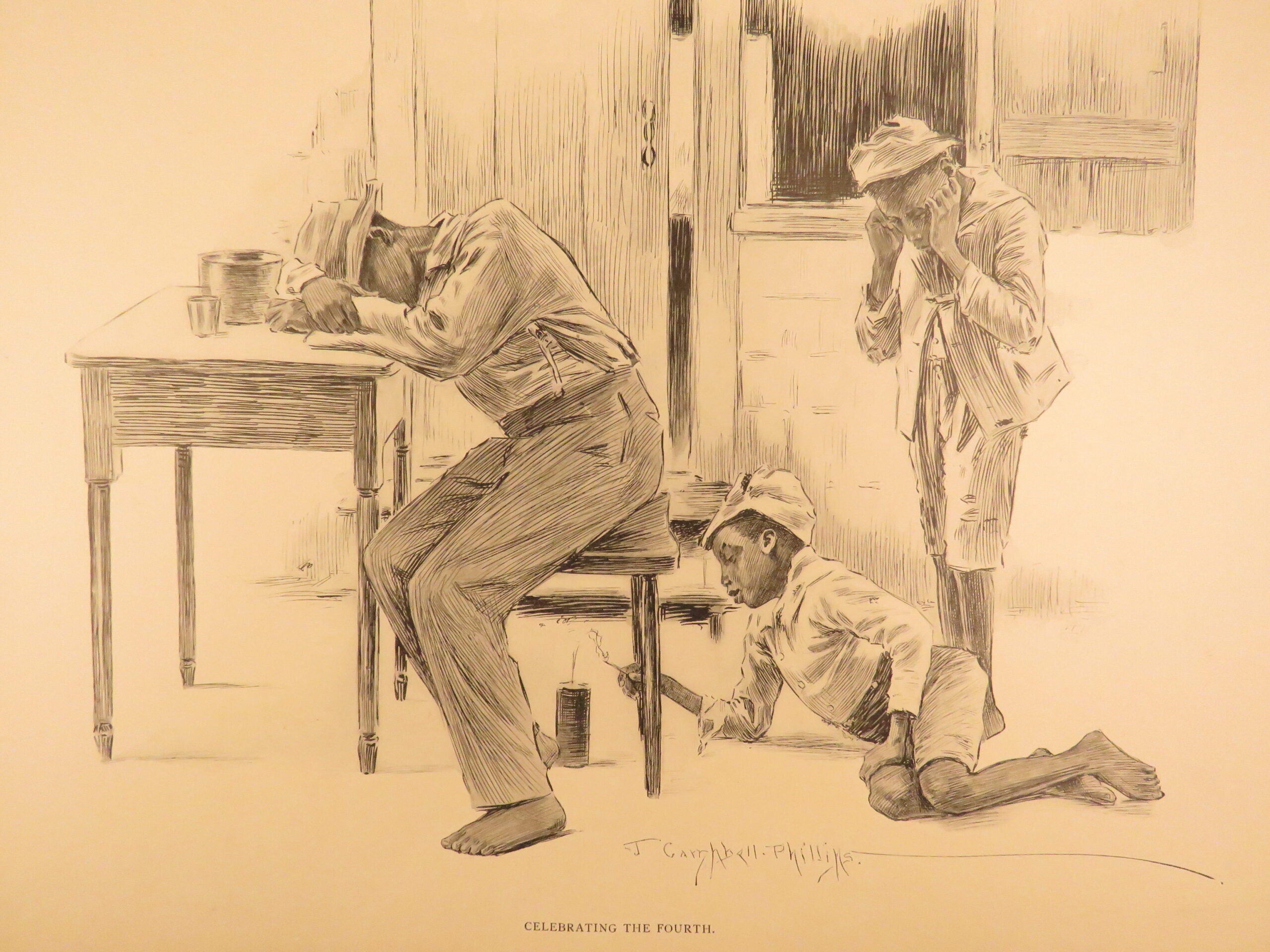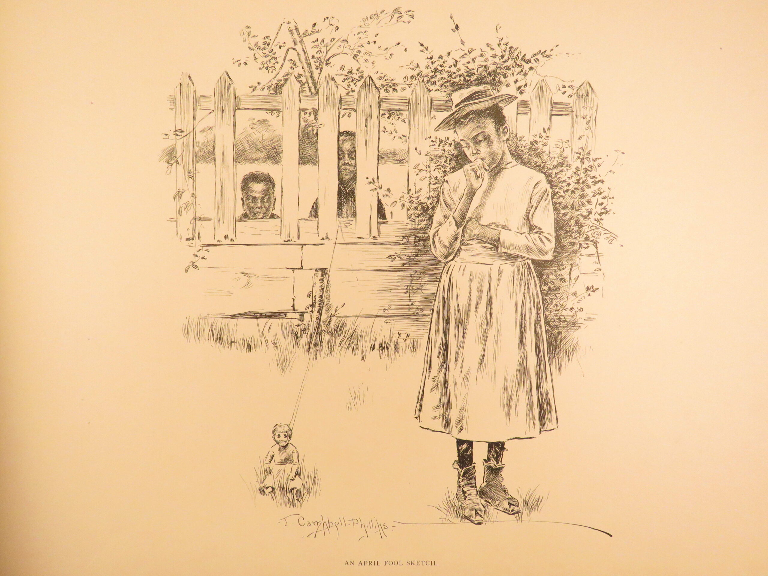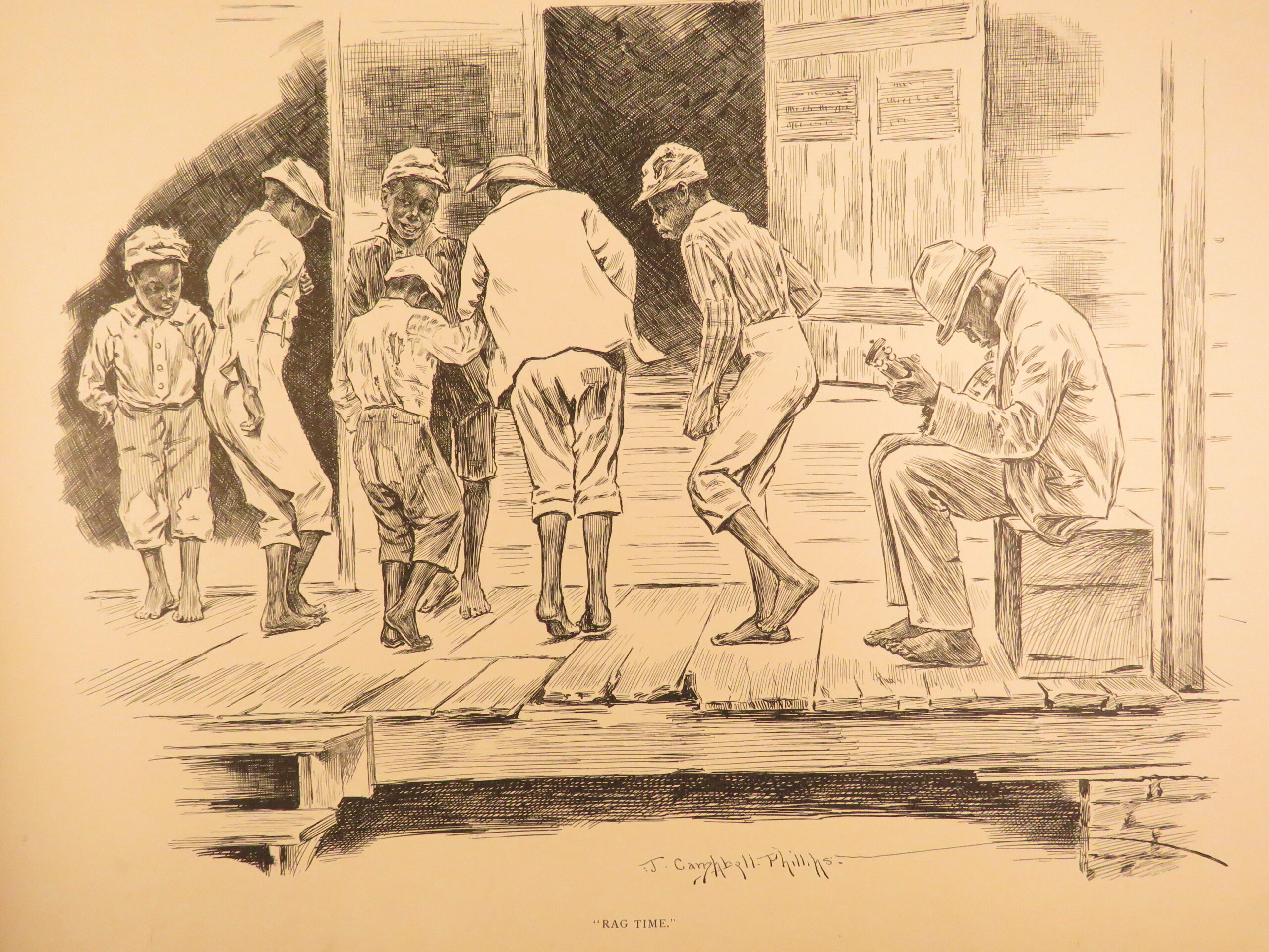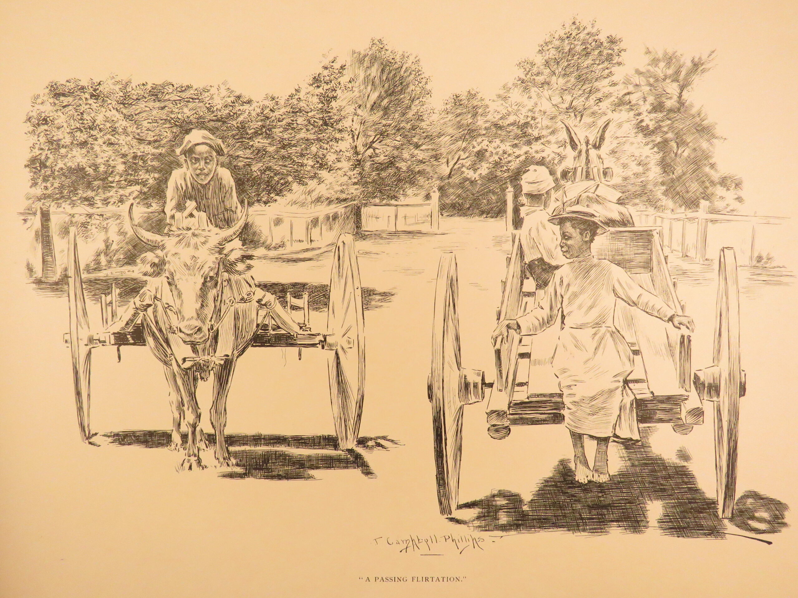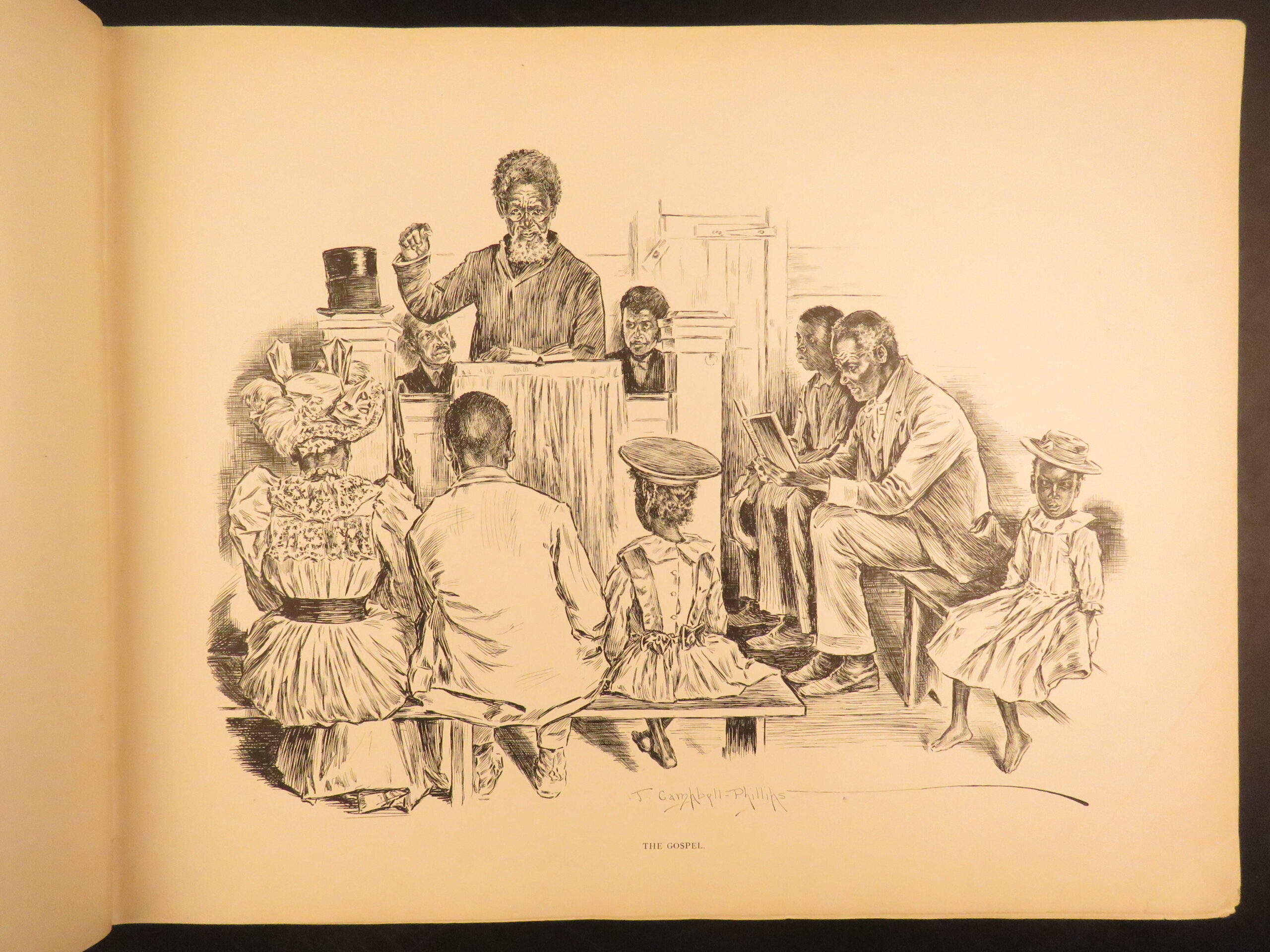 Plantation Sketches by J Campbell Phillips is a rare, 1899 portfolio of artwork depicting scenes associated with plantation and farm life in the American South. Many of the illustrations show slaves and slave children in their day-to-day life in a “comic style” presentation. The is merely a collection of plates rather than written descriptions, nevertheless, this work is a highly desirable and considerably valuable piece of Reconstruction Era art depicting African American and black Americans in the post-war South.