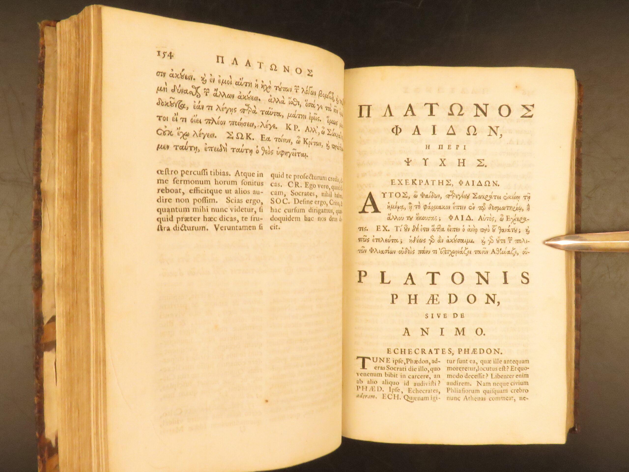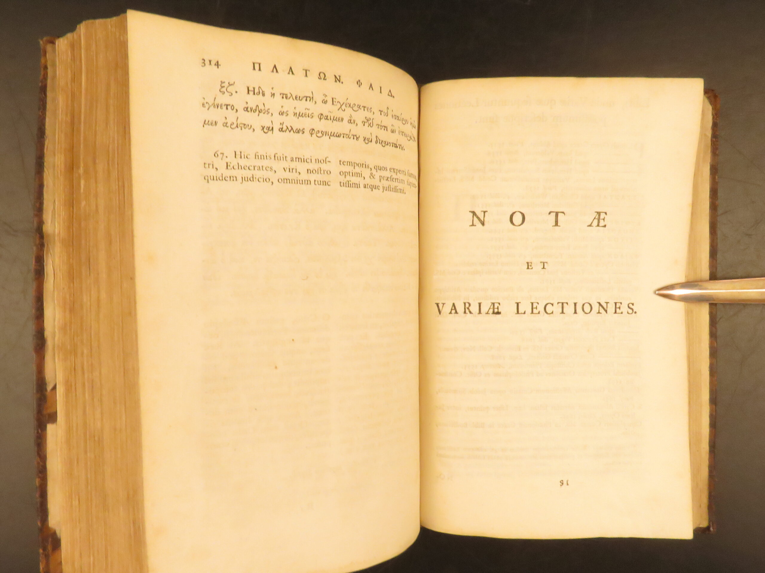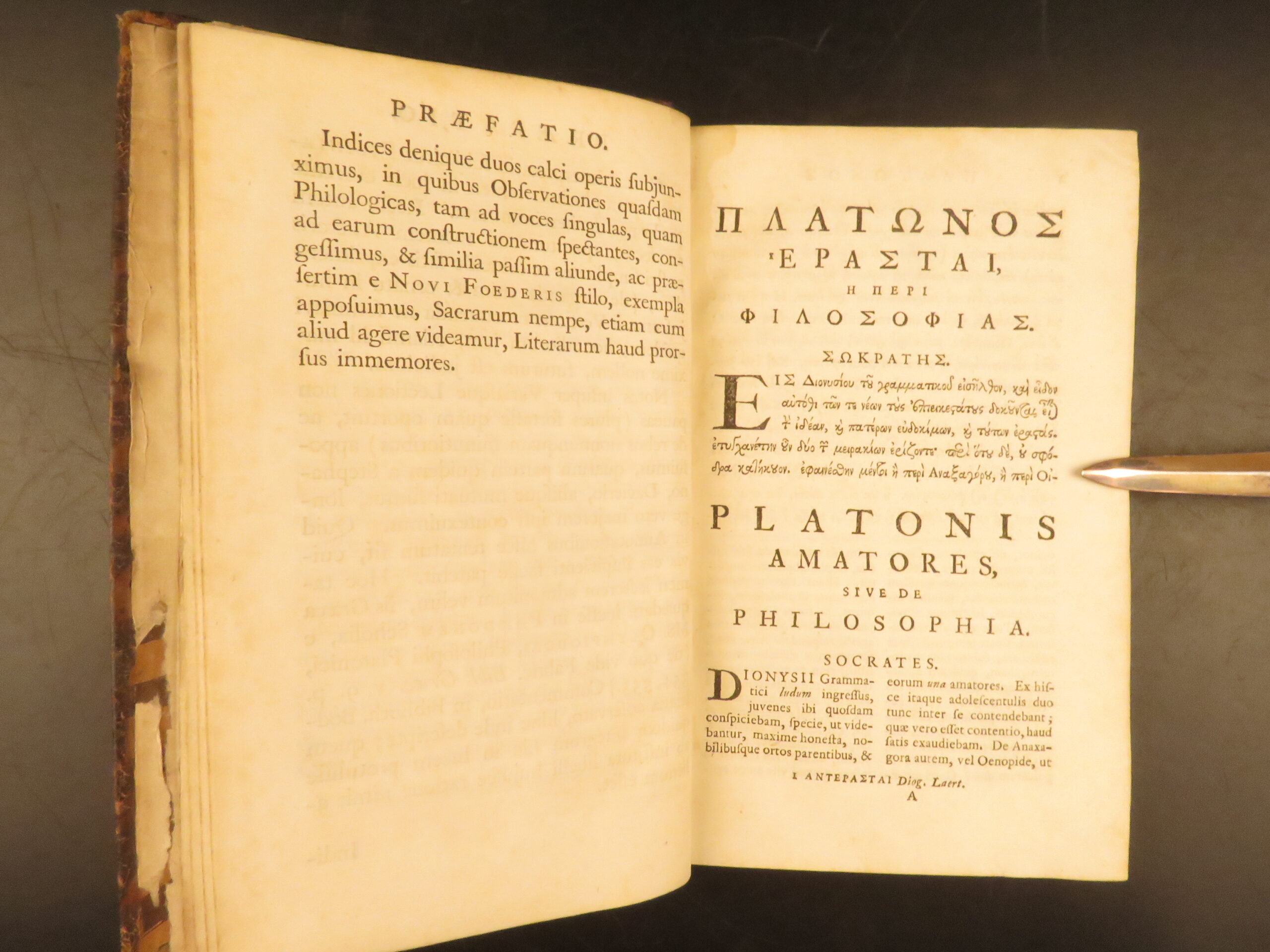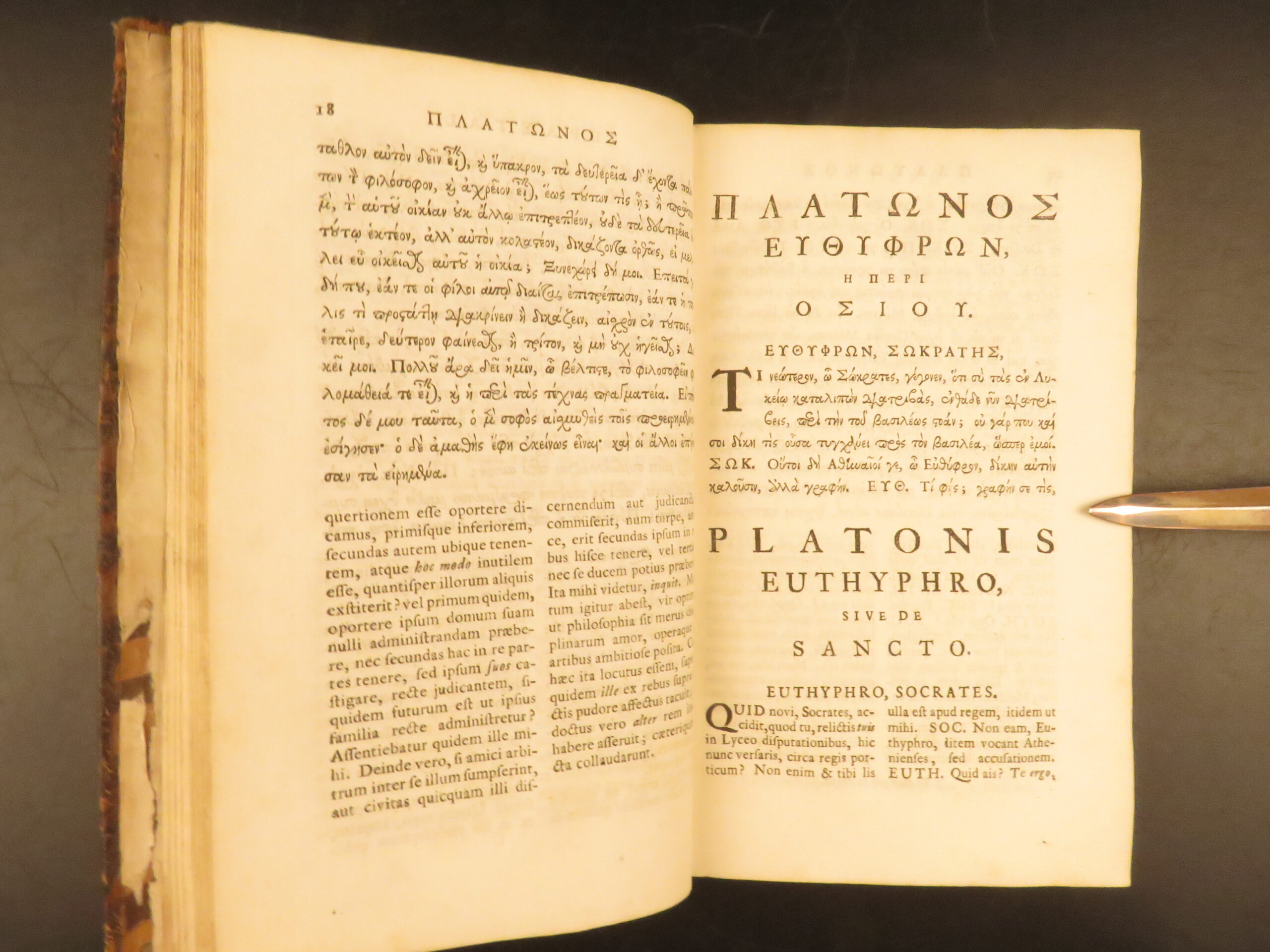 1745 Oxford Clarendon edition of Plato’s Greek Dialogues edited by Nathaniel Forster, containing Apology, Crito, Euthyphro, Phaedrus, and Erastai in full leather binding.