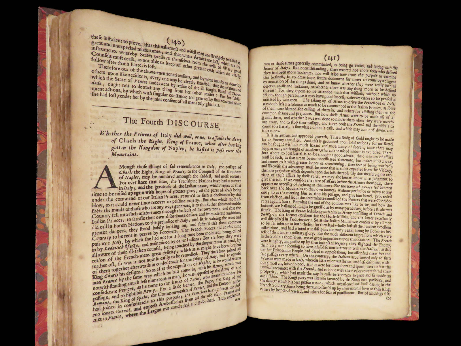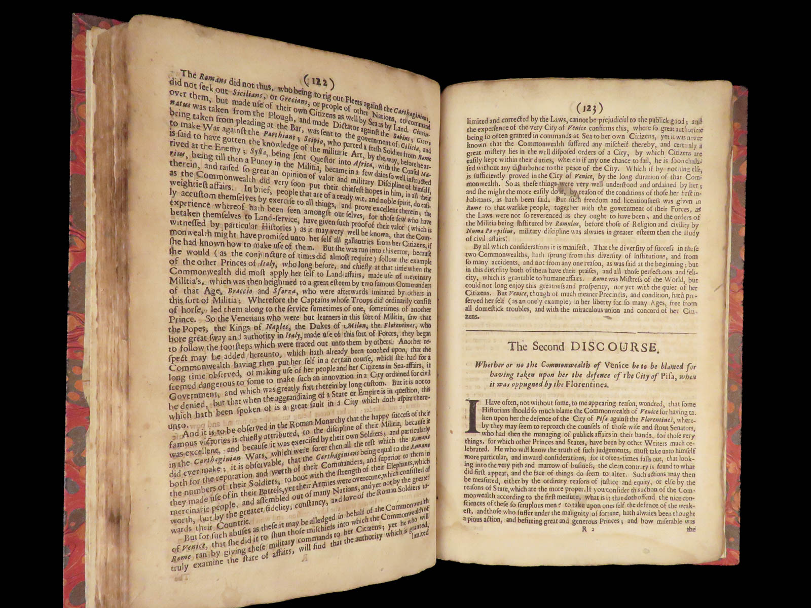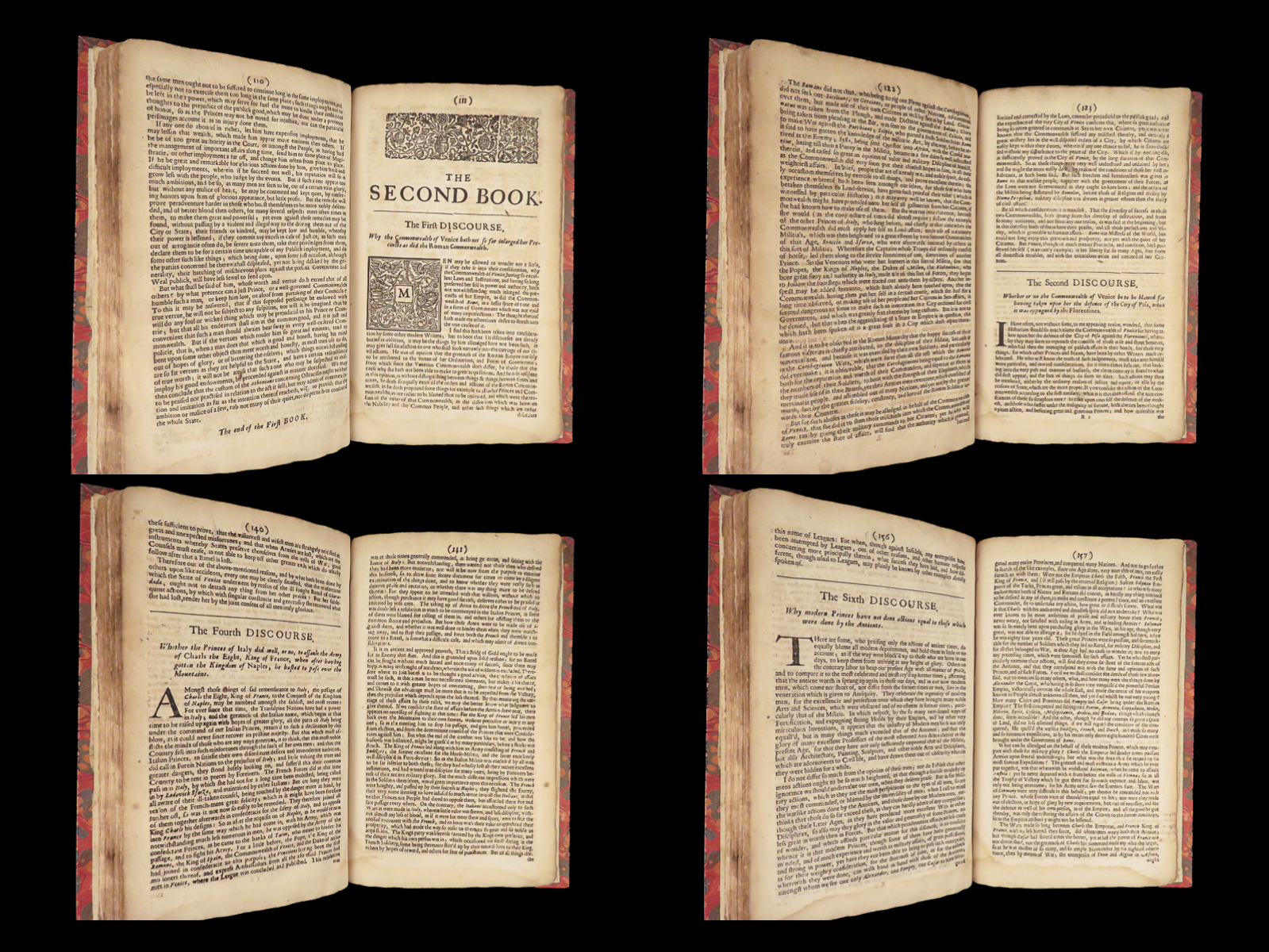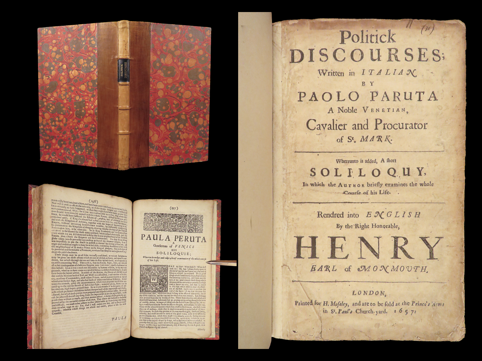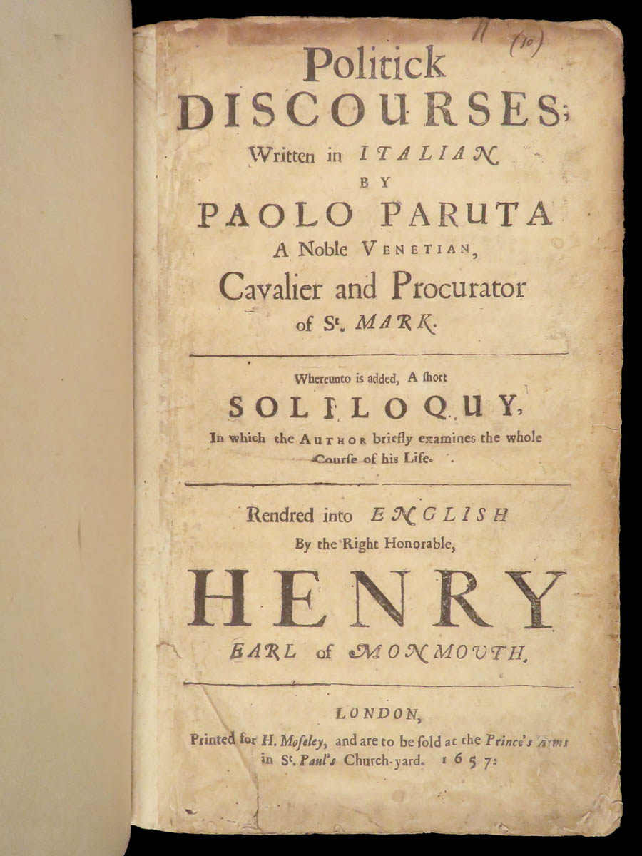 This 1657 printing is the first English edition of Discorsi politici, translated into English by Henry Carey, 2nd Earl of Monmouth.