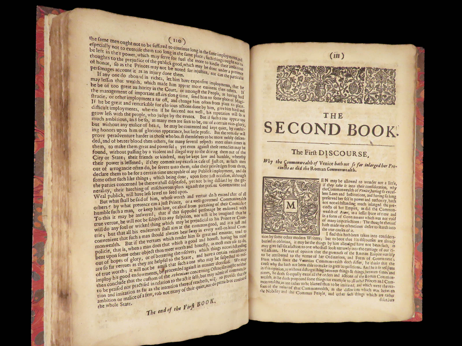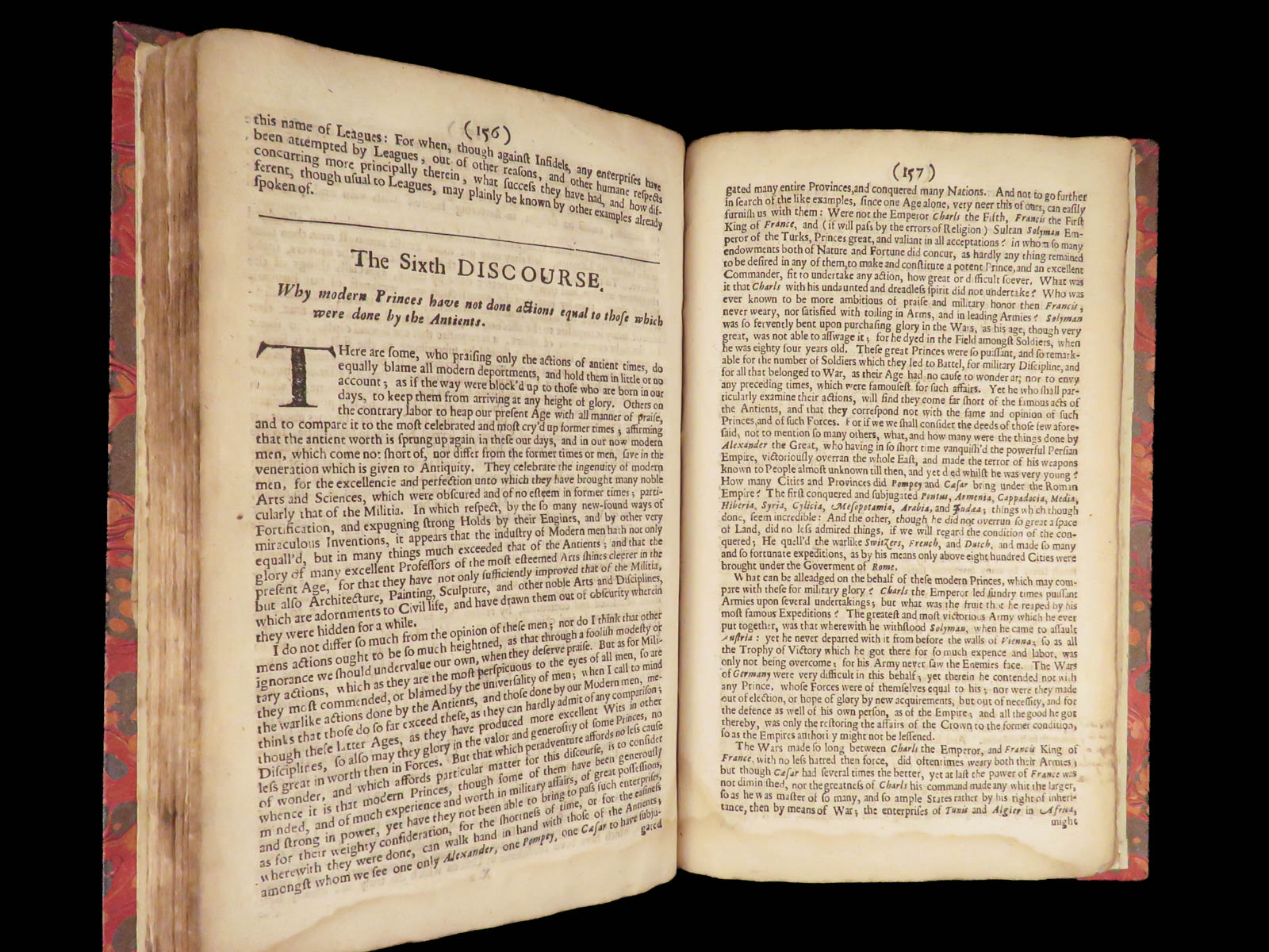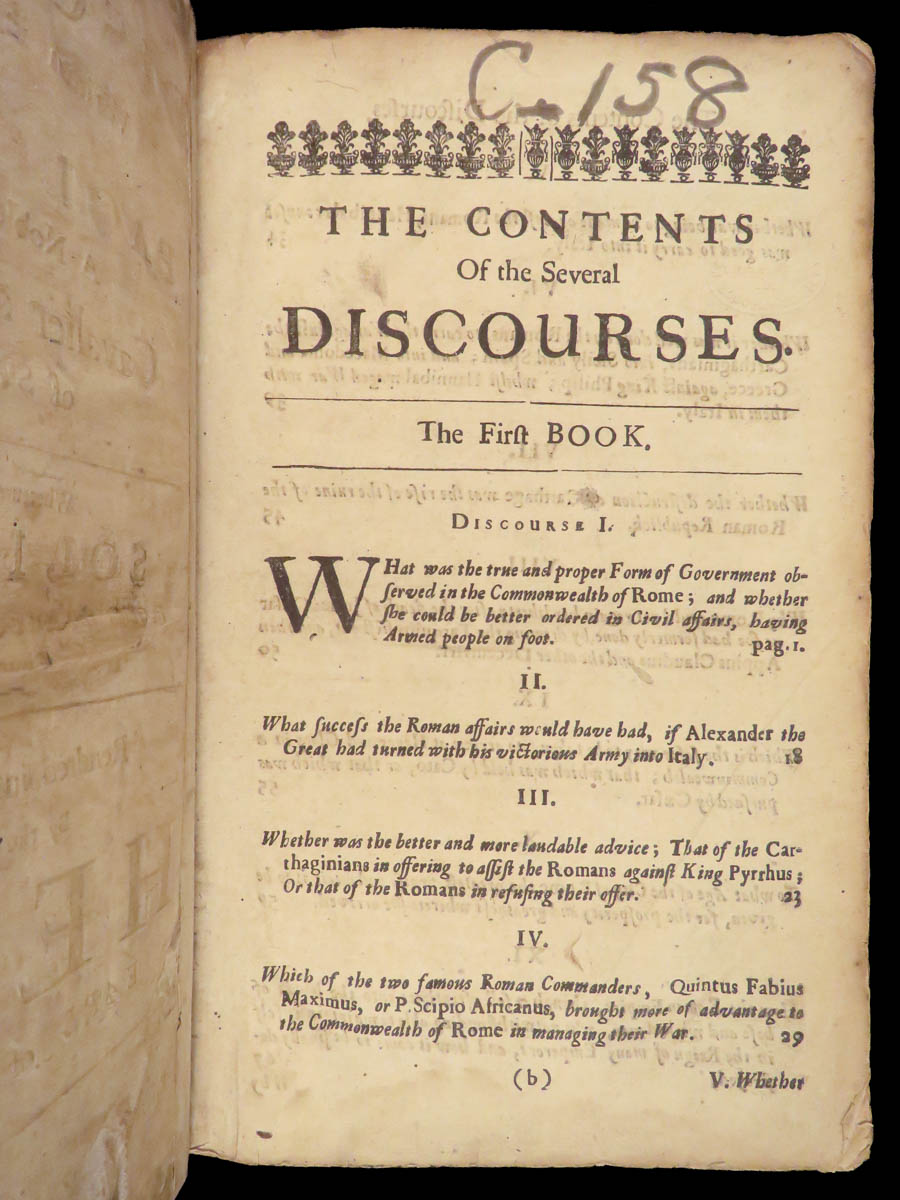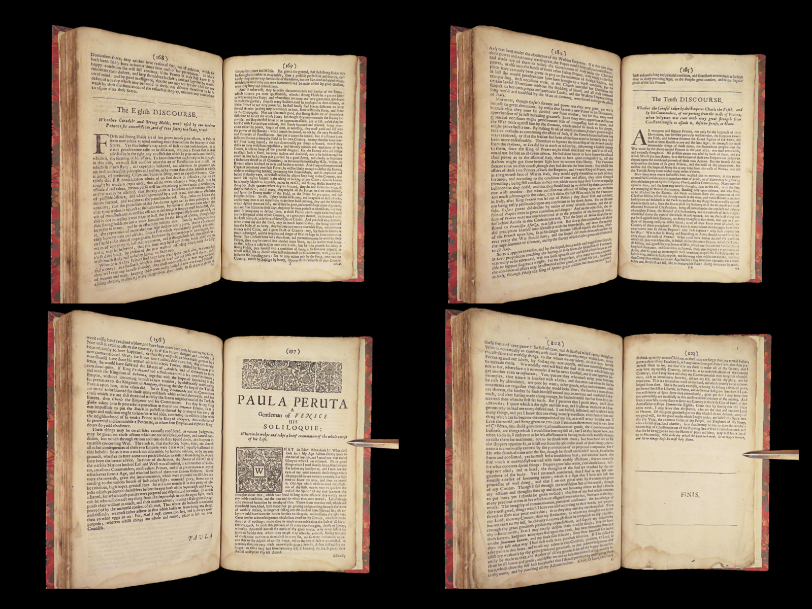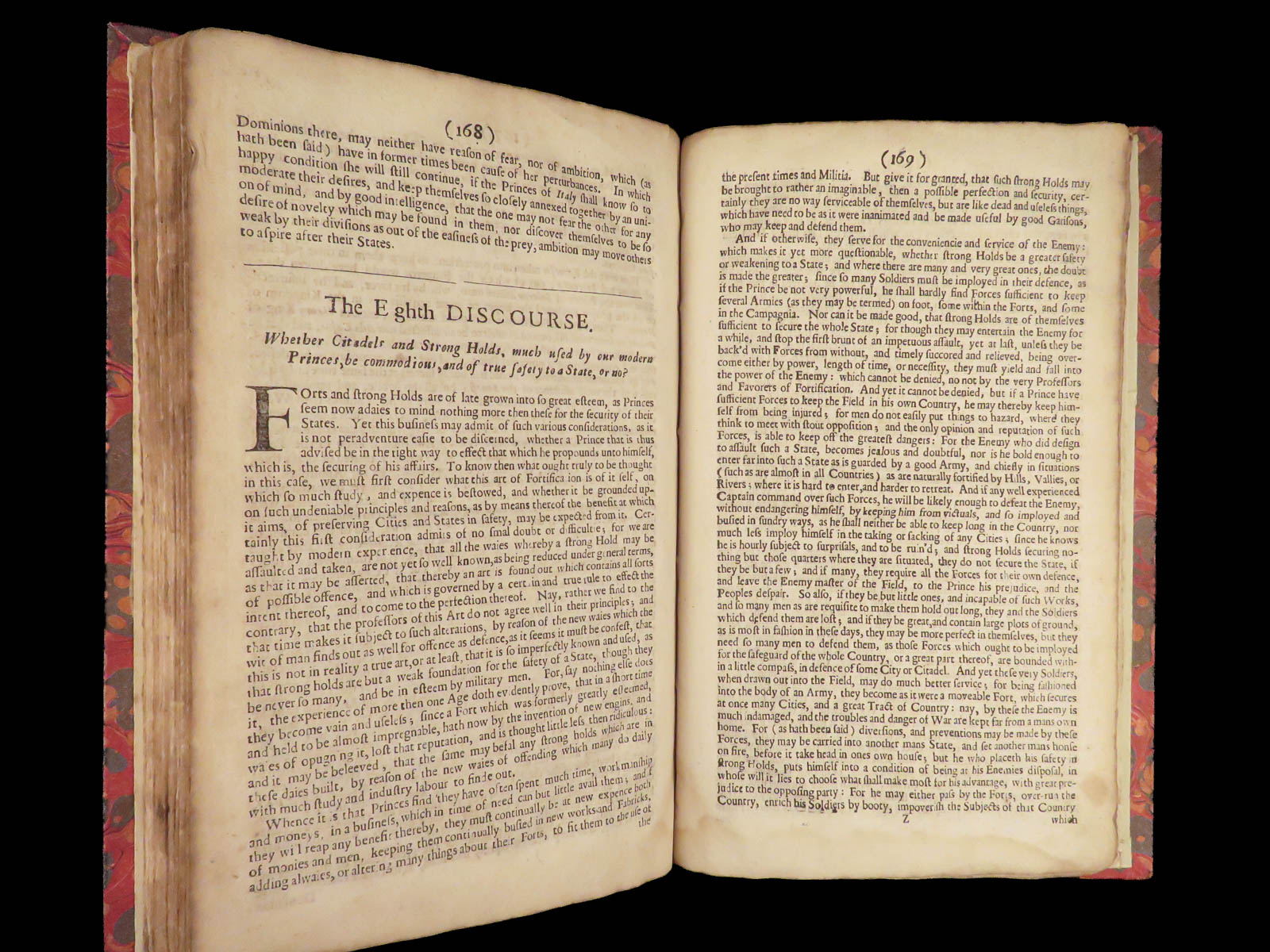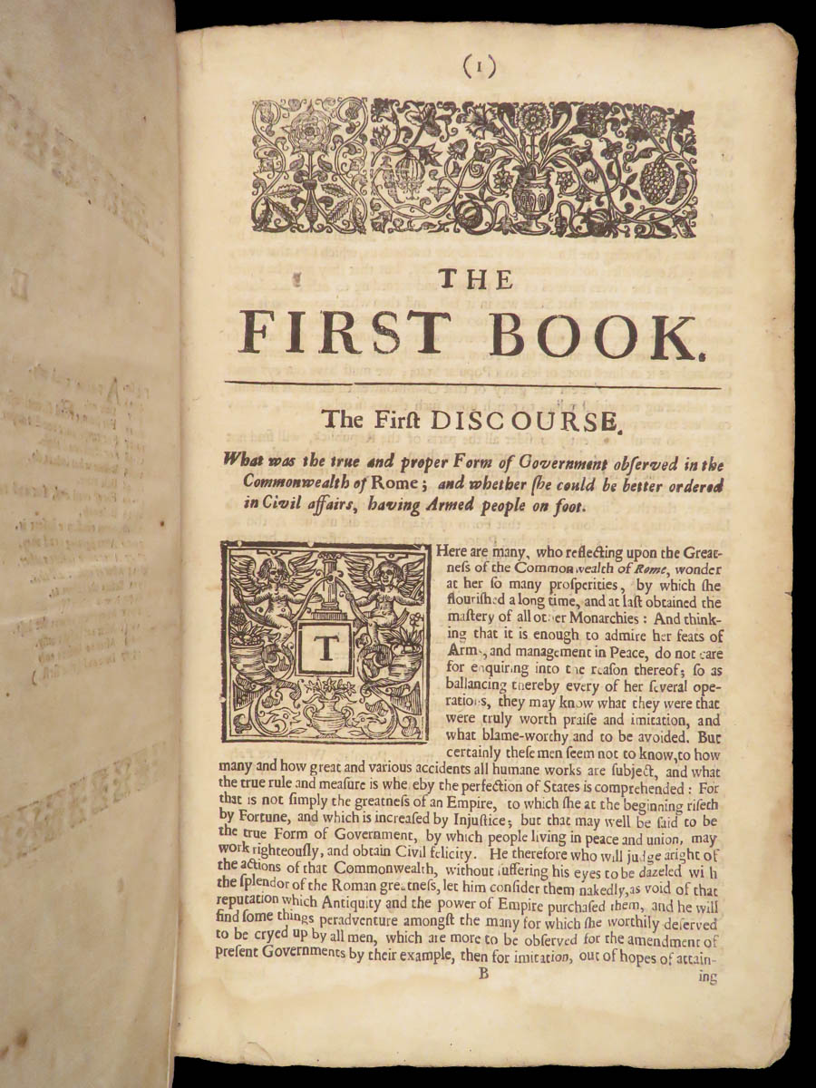 This 1657 printing is the first English edition of Discorsi politici, translated into English by Henry Carey, 2nd Earl of Monmouth.