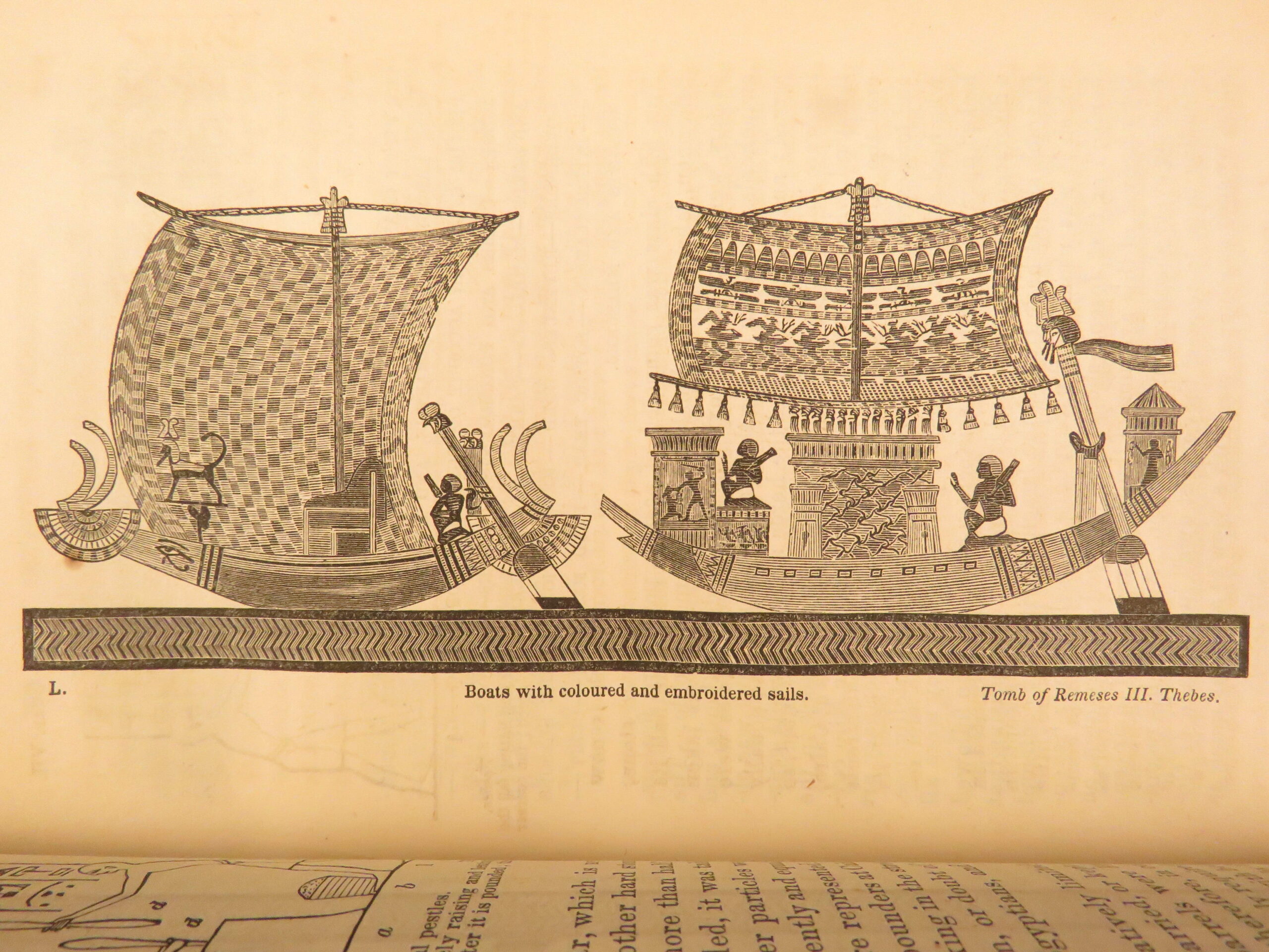 This 1854 Murray edition was published in two volumes, both of which are illustrated throughout with images of gods, warships, art and hieroglyphs, and cultural aspects such as tools and animals.