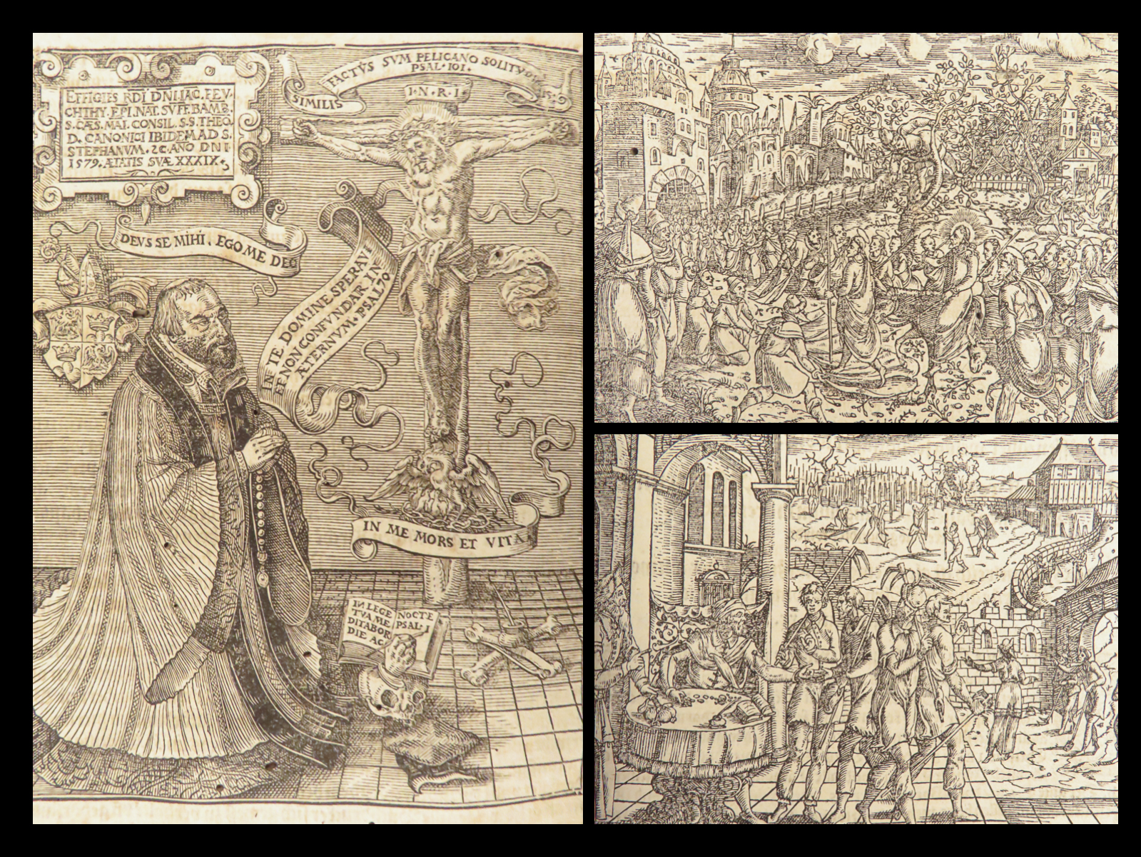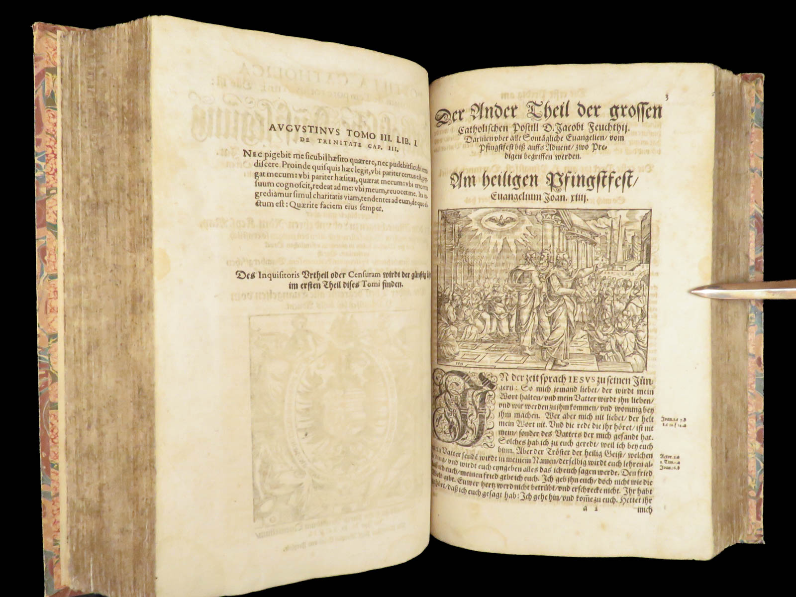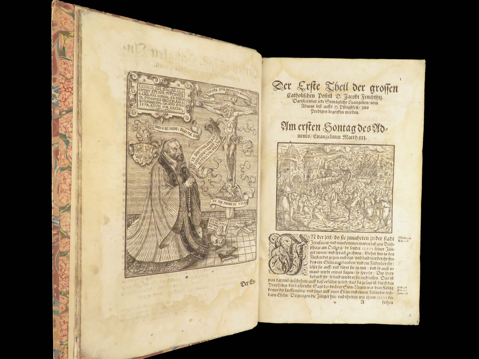 Jakob Feucht’s 1597 Postilla Catholica Evangeliorum, printed in Cologne, contains two full parts of Catholic sermons for the liturgical year, with in-text woodcuts and bound in period vellum over marbled boards.