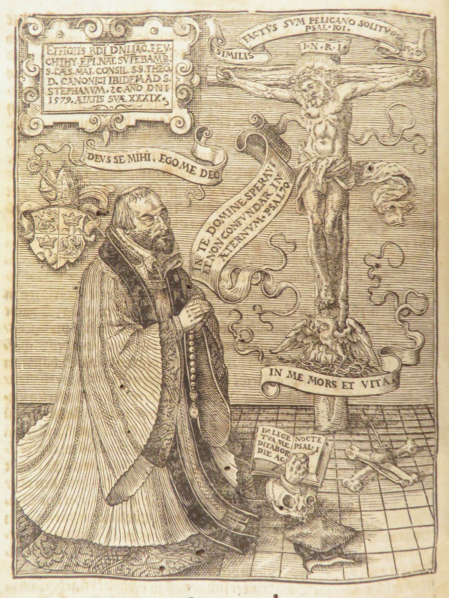 Jakob Feucht was a 16th-century German Catholic bishop who wrote an enormous postil on the festivals and daily prayers of the Catholic liturgical calendar. Postilla Catholica Evangeliorum de Tempore totius Anni, written by Feucht, is an impressive 1597 vellum-bound Catholic postil. This folio contains hundreds of prayers and homilies for each week of the Catholic liturgical calendar aligning with major feast days, Sundays, and holy days. This impressive folio includes numerous in-text woodcut engravings throughout.