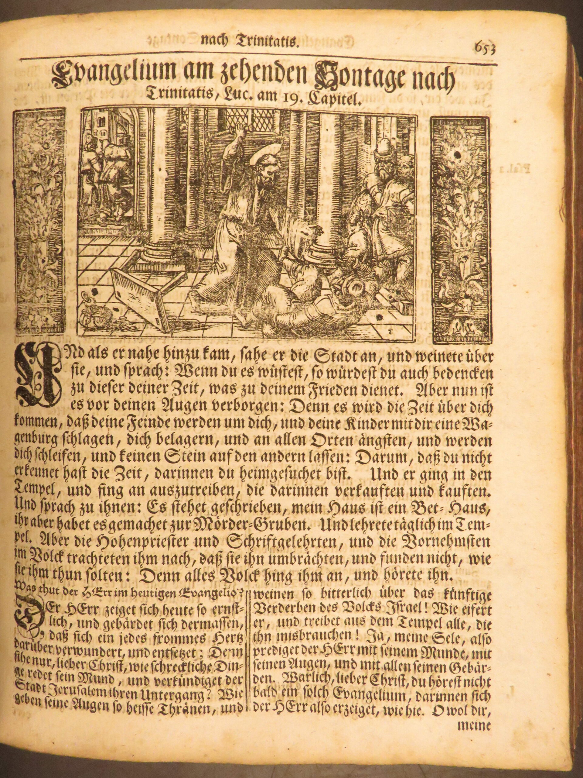 Praxis Evangelicorum by Martin Möller (1787), devotional work featuring Gospel and Epistle commentaries with in-text woodcuts, issued in Lüneburg in tooled leather.