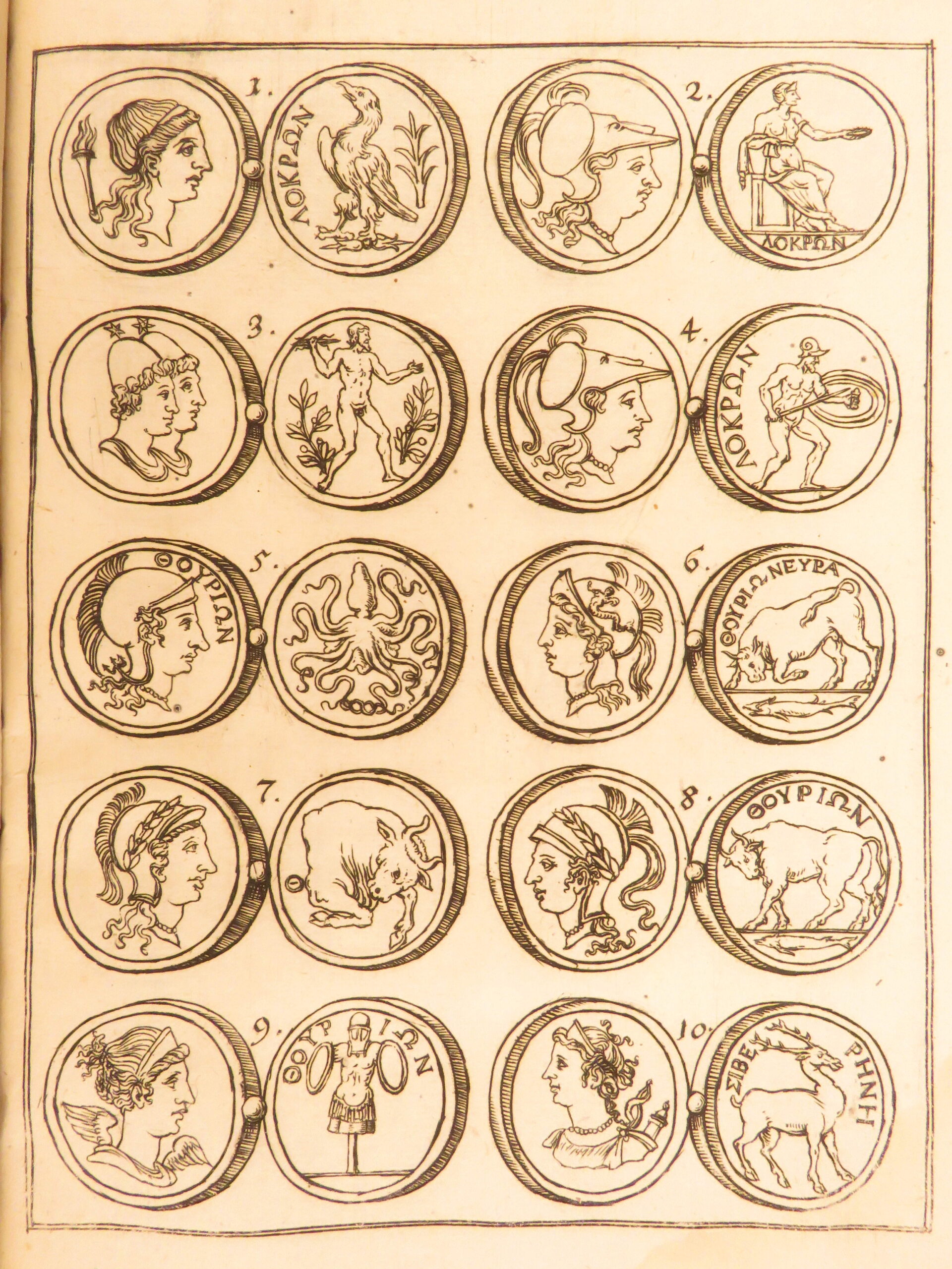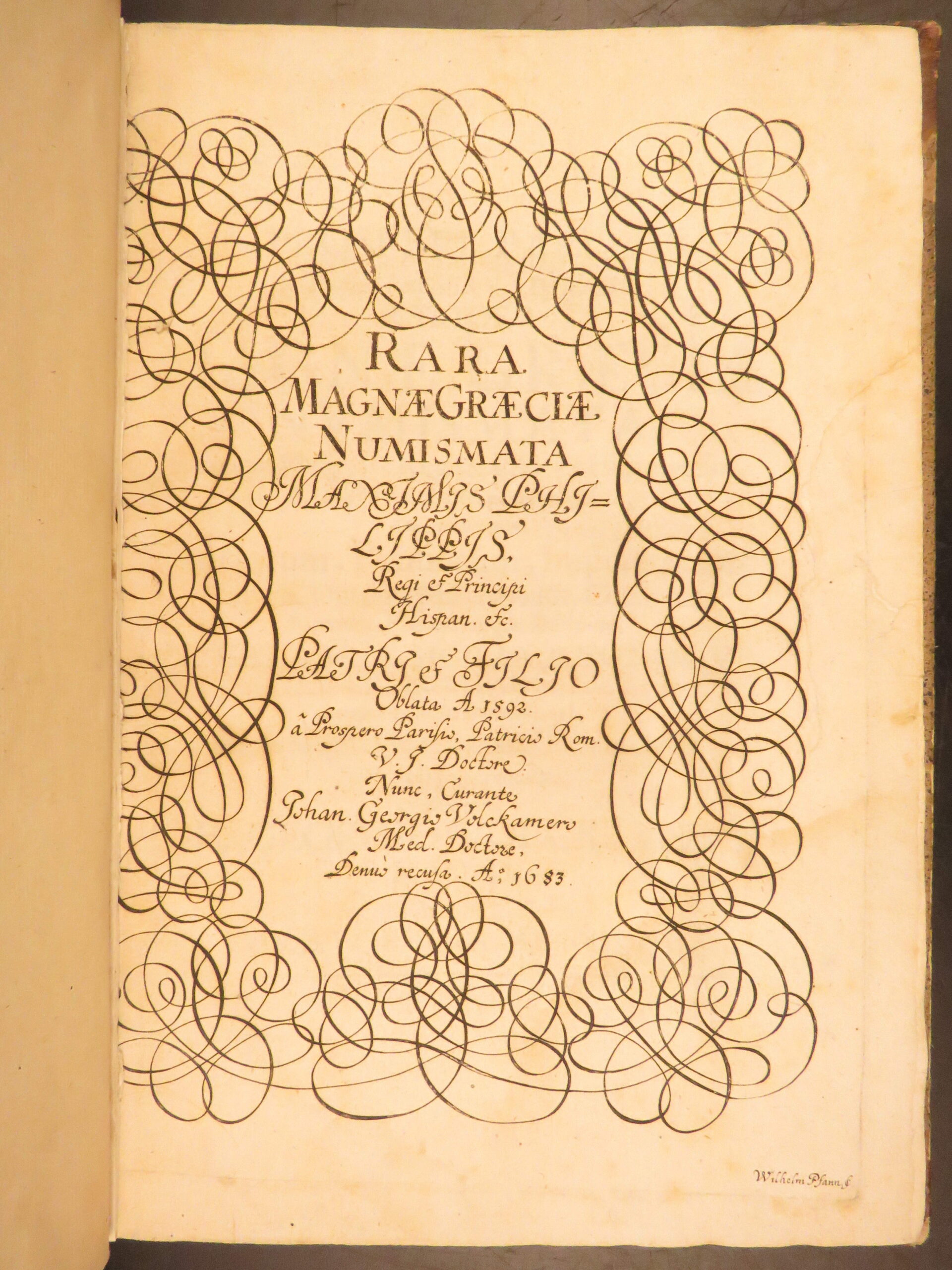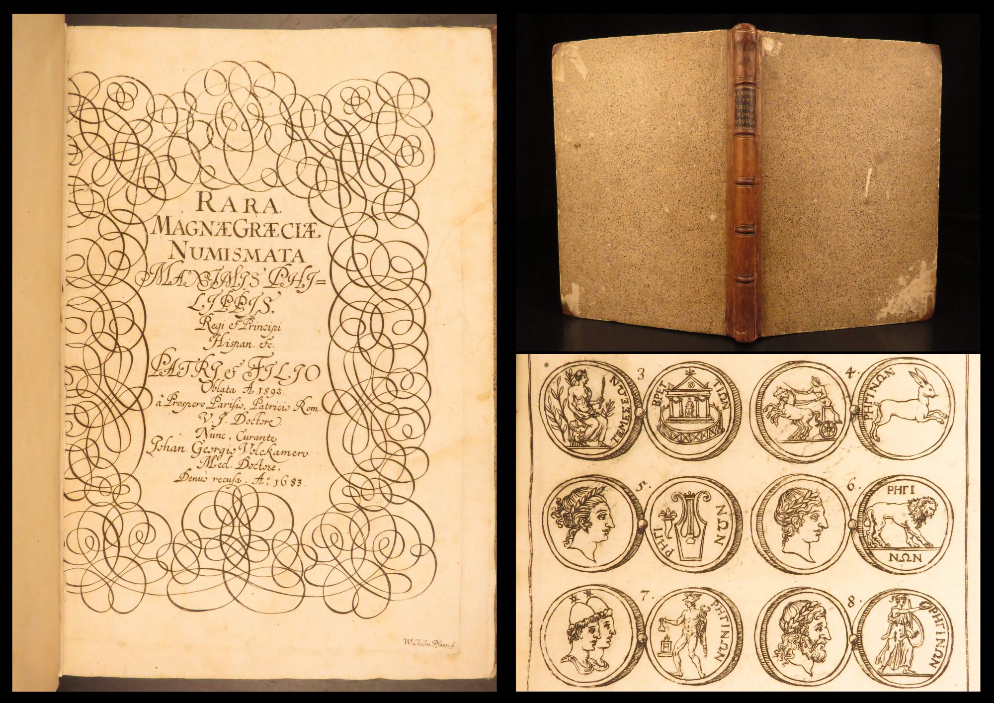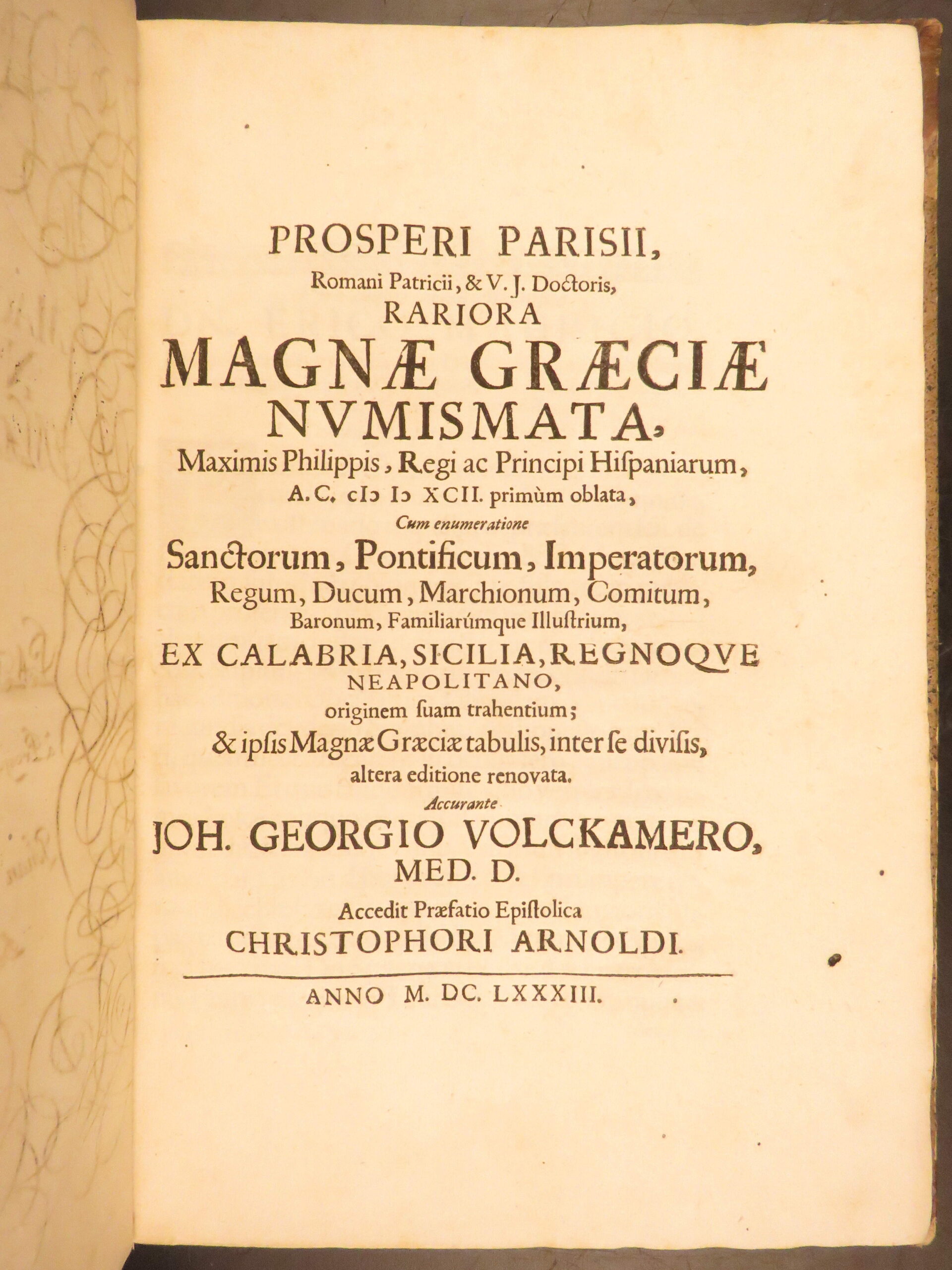 Rariora Magnæ Græciæ Numismata by Prospero Parisio is a 17th-century survey of ancient Greek and Italian coins that examines coins from Calabria, Sicily, and the Kingdom of Naples. This work is a curious fusion of numismatics and church history published at a time when coins were used to establish historical timelines. This 1683 second edition was edited by Johann George Volckamer and is notable for retaining all 13 original full-page engravings each of which as 20 separate coin figures.