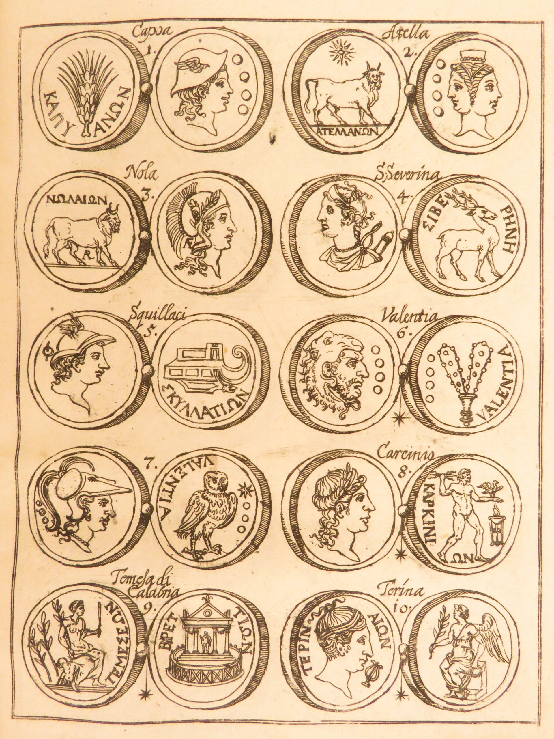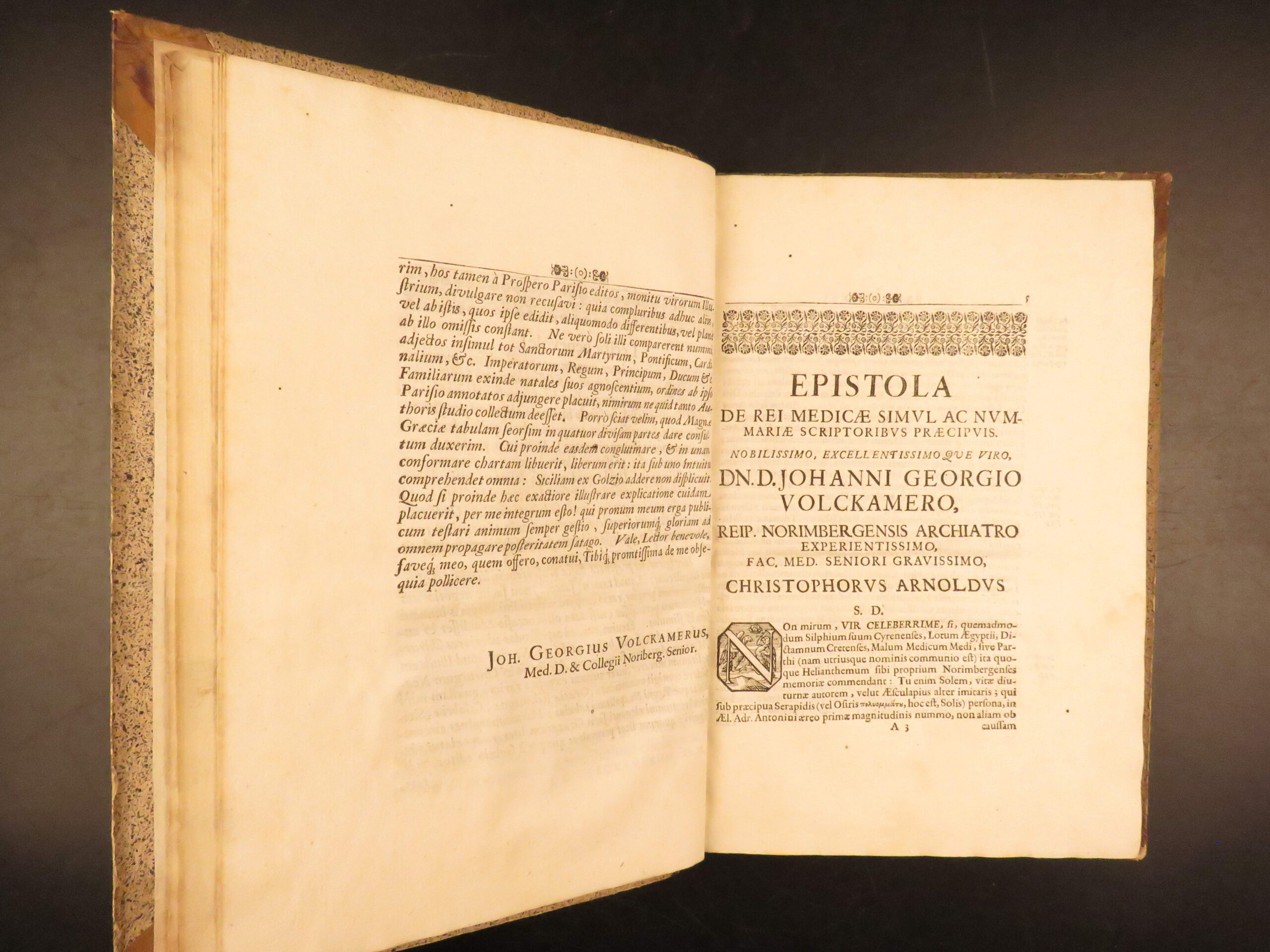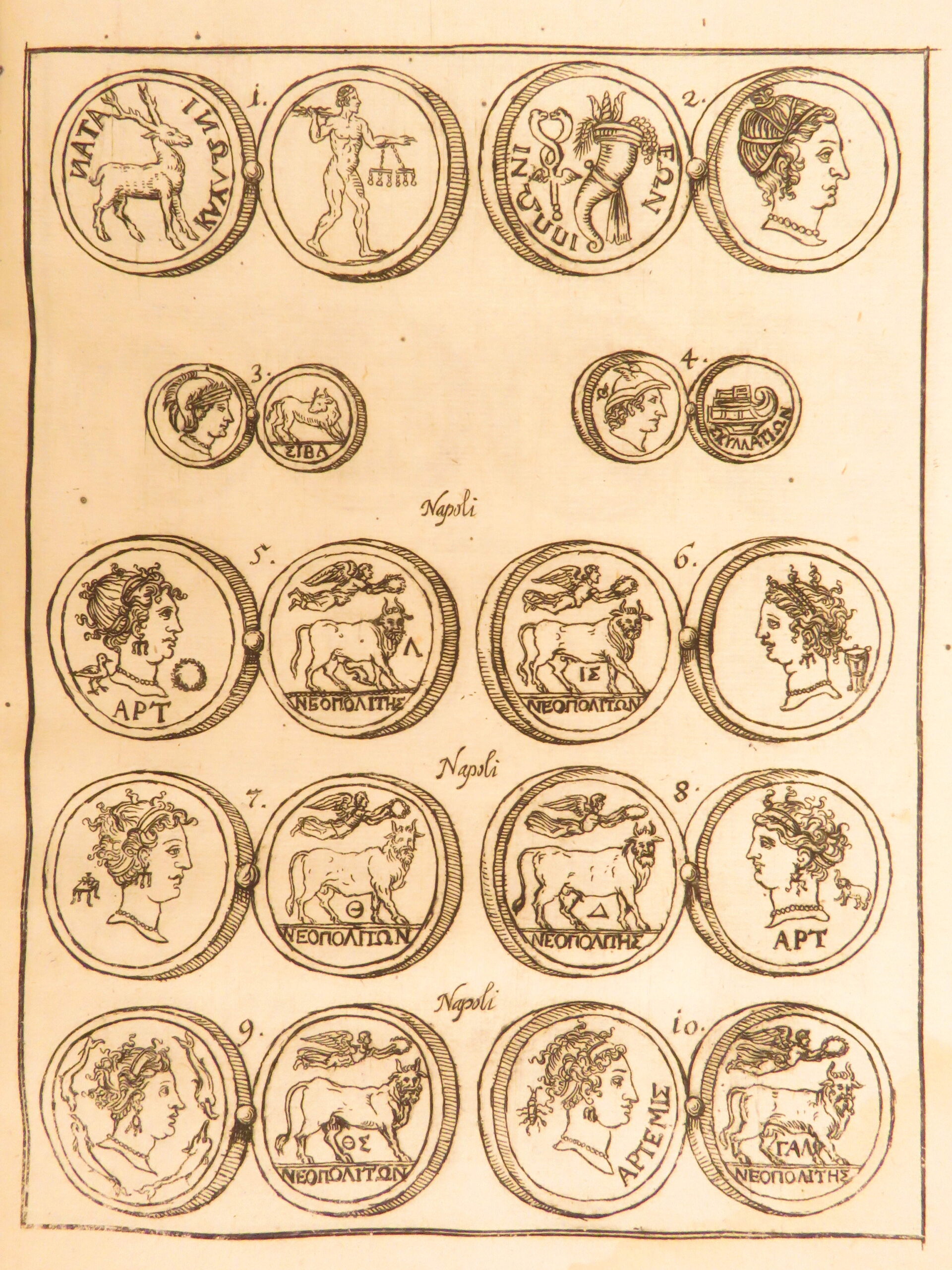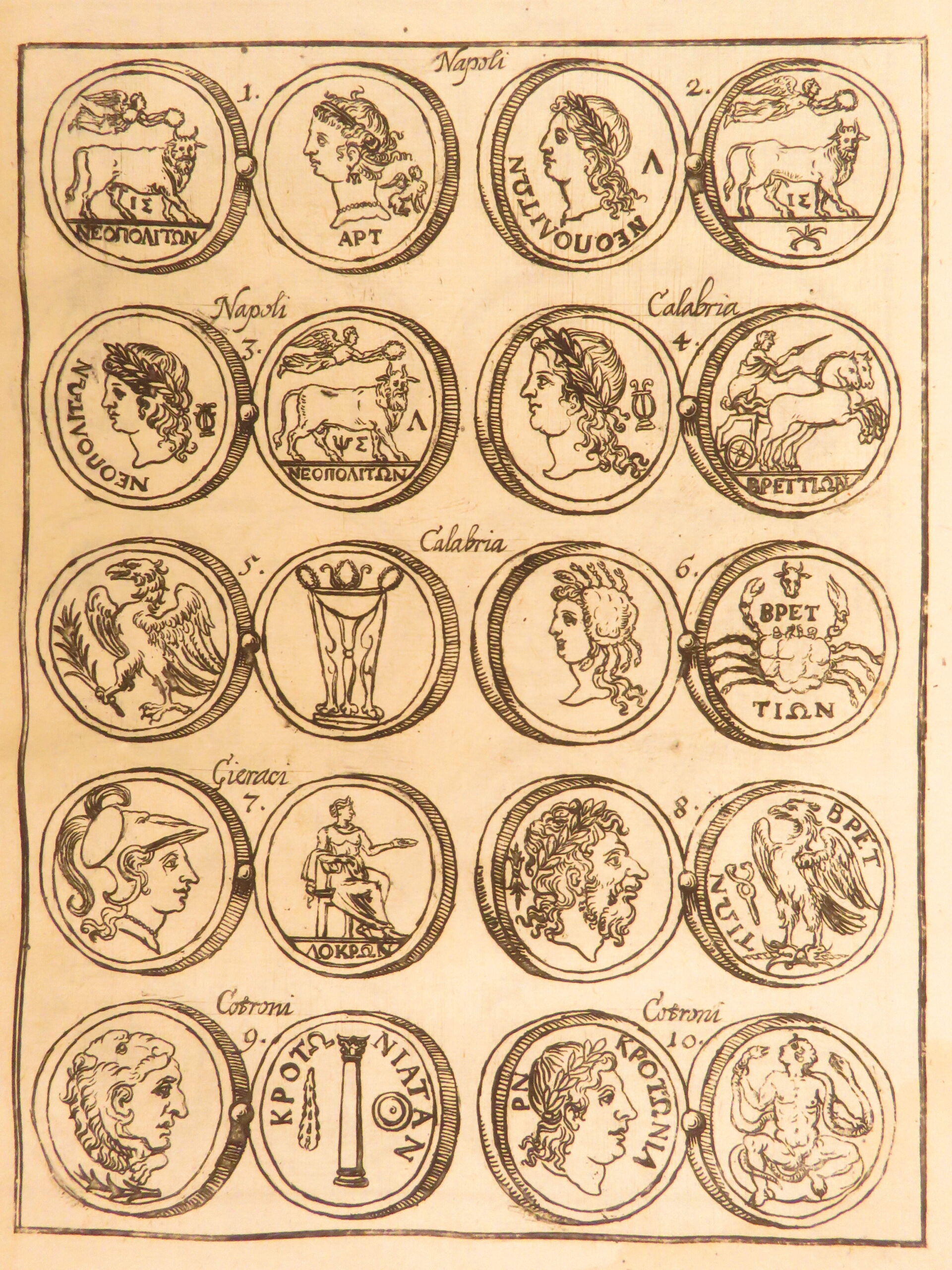Rariora Magnæ Græciæ Numismata by Prospero Parisio is a 17th-century survey of ancient Greek and Italian coins that examines coins from Calabria, Sicily, and the Kingdom of Naples. This work is a curious fusion of numismatics and church history published at a time when coins were used to establish historical timelines. This 1683 second edition was edited by Johann George Volckamer and is notable for retaining all 13 original full-page engravings each of which as 20 separate coin figures.