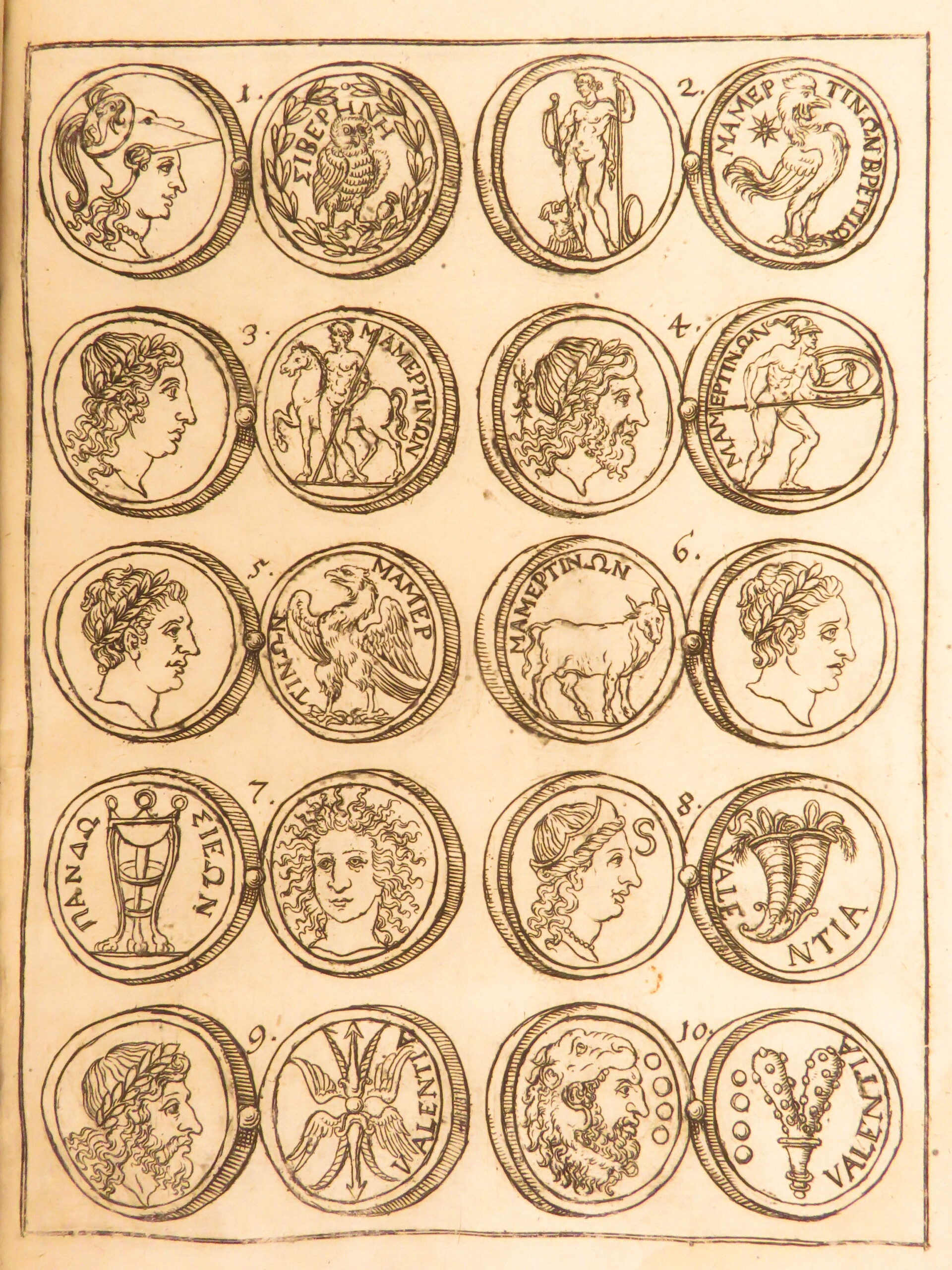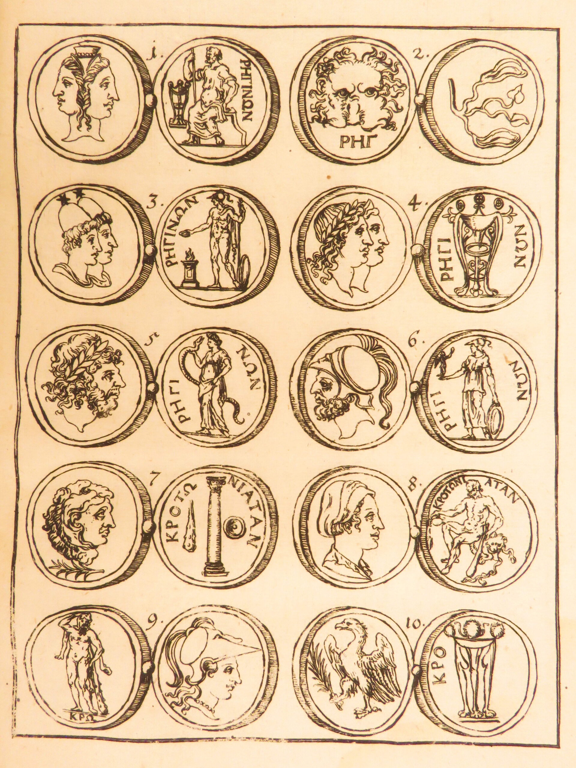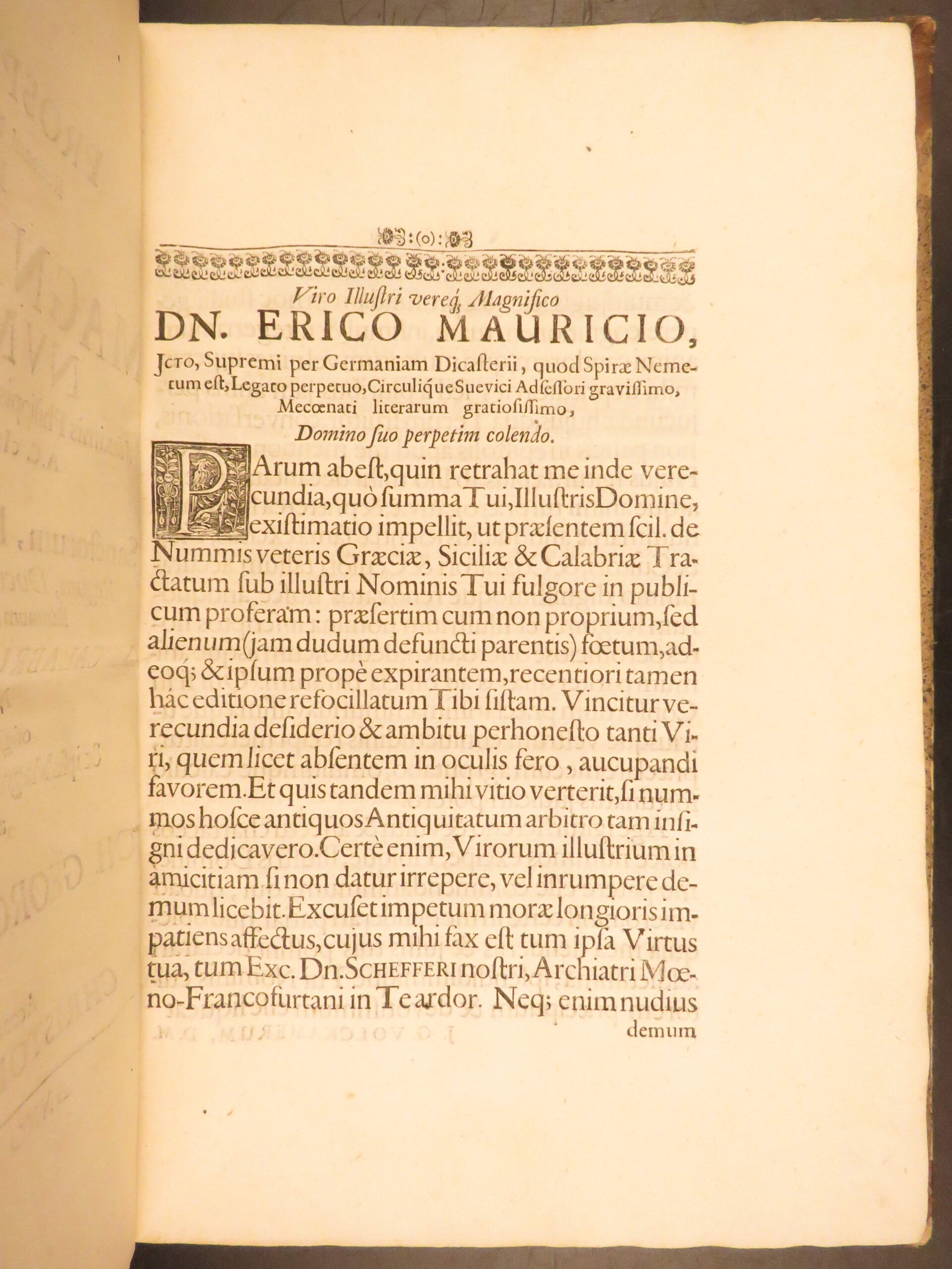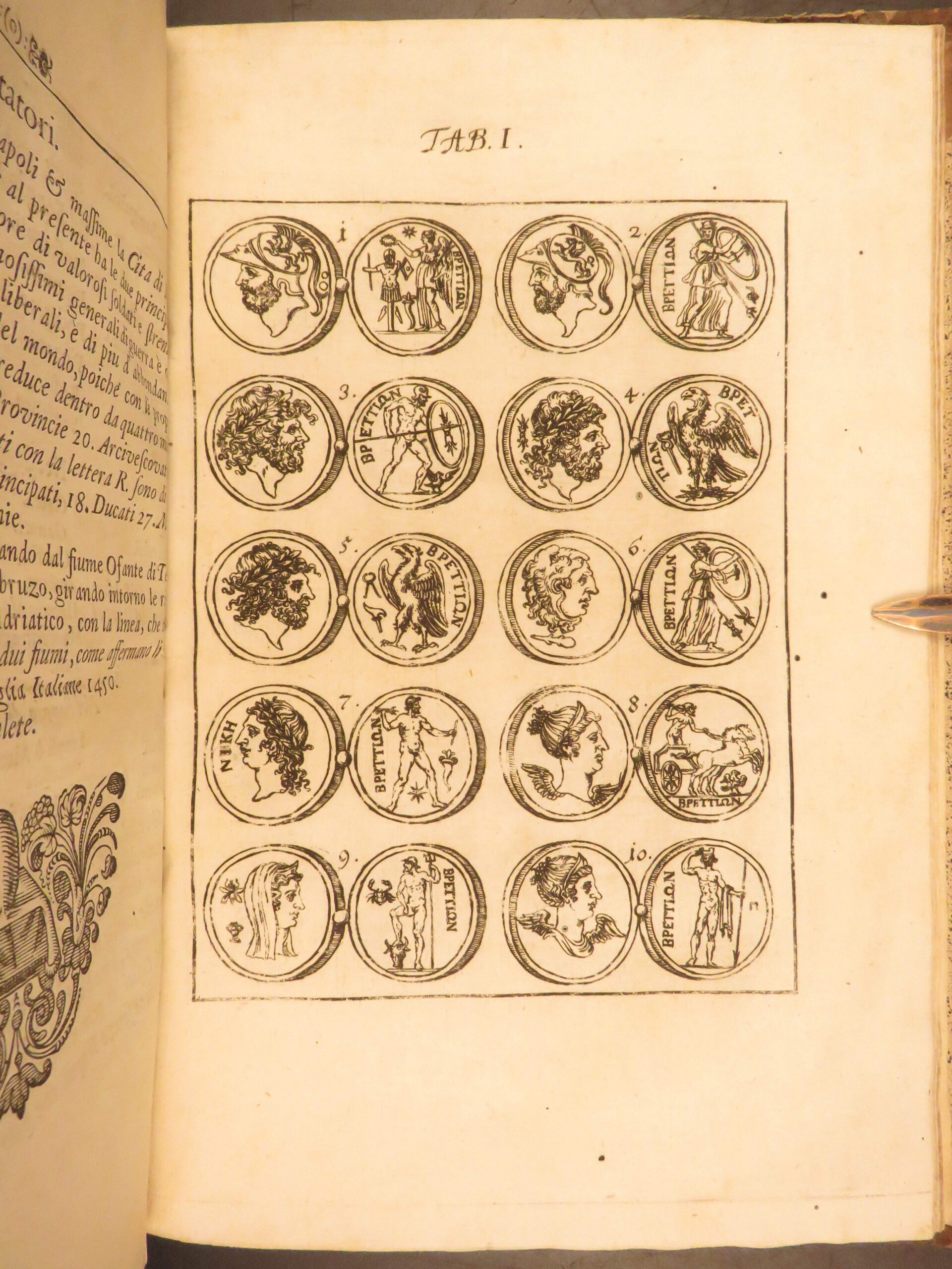 Rariora Magnæ Græciæ Numismata by Prospero Parisio is a 17th-century survey of ancient Greek and Italian coins that examines coins from Calabria, Sicily, and the Kingdom of Naples. This work is a curious fusion of numismatics and church history published at a time when coins were used to establish historical timelines. This 1683 second edition was edited by Johann George Volckamer and is notable for retaining all 13 original full-page engravings each of which as 20 separate coin figures.