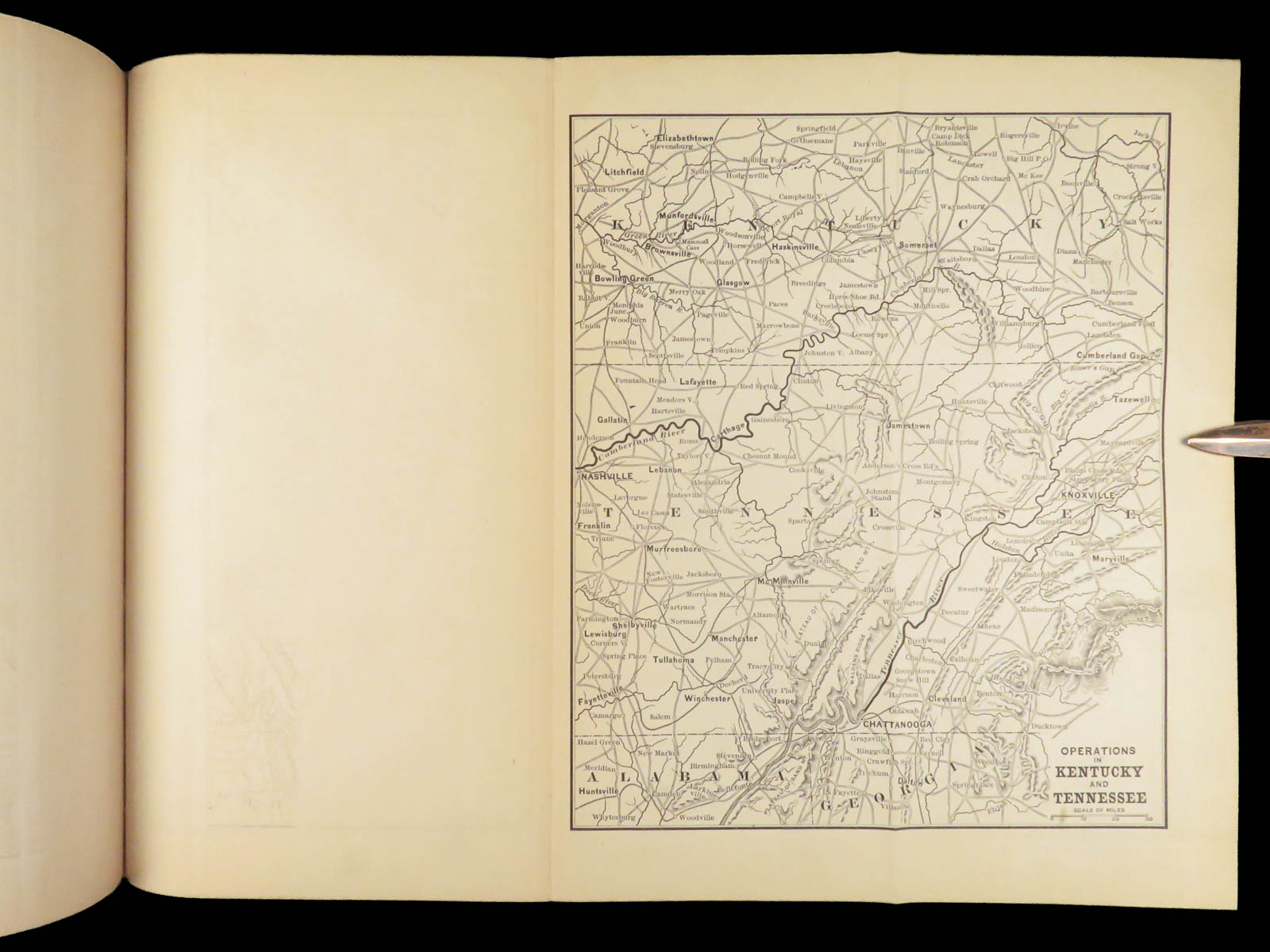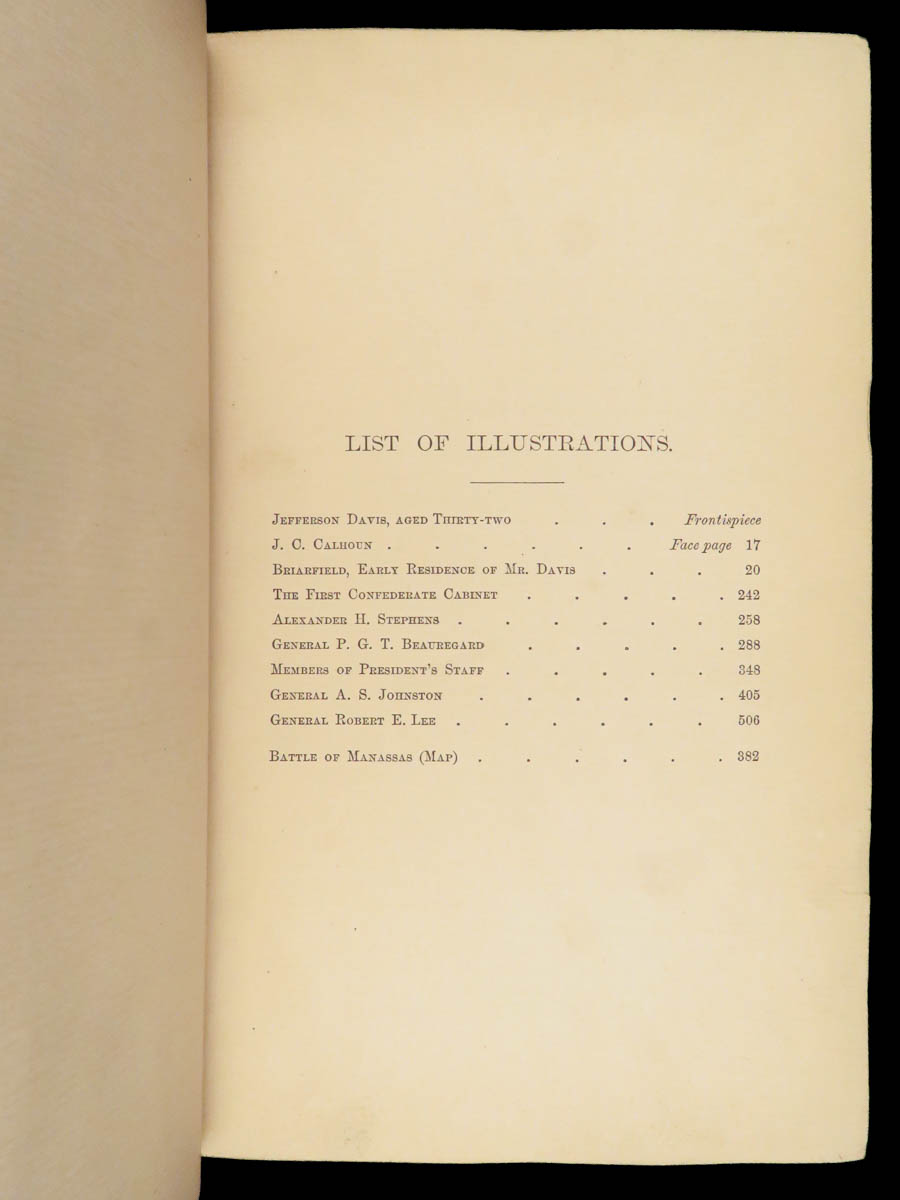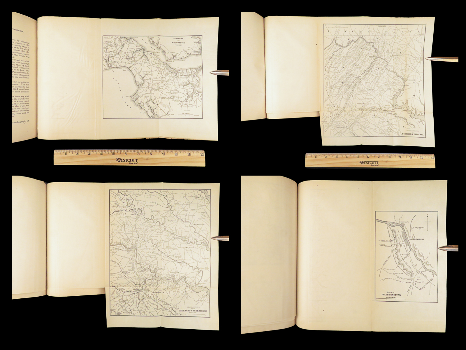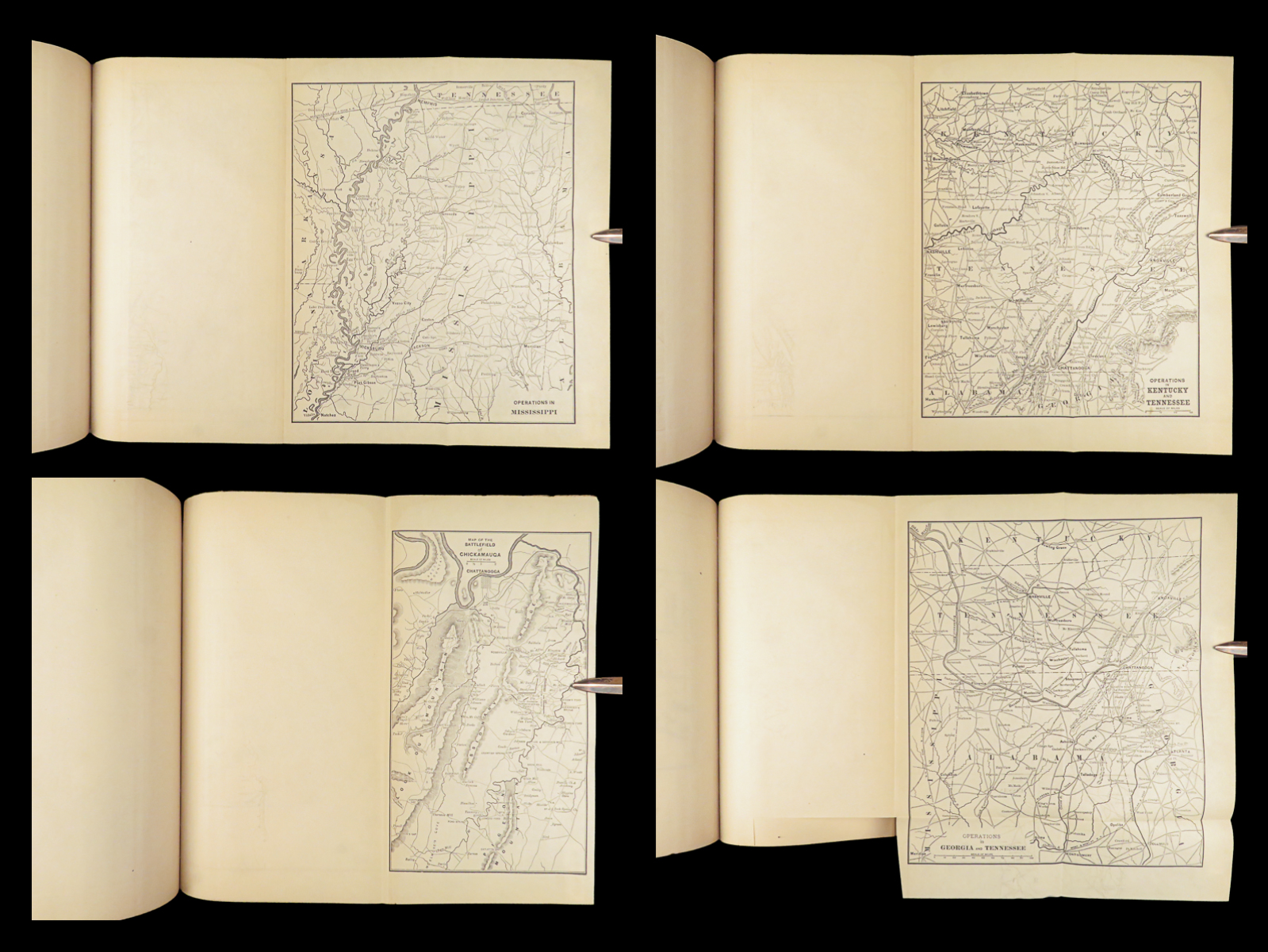 First published in 1881, The Rise and Fall of the Confederate Government by Jefferson Davis appears here as a complete two-volume first edition set in original cloth bindings, with all issued illustrations and thirteen large, folding battle maps intact. Davis presents a combined personal narrative and political justification related to secession, Confederate leadership, military campaigns, and Southern politics. Prominent figures discussed include Lee, Jackson, and Calhoun, alongside detailed engraved maps covering major military operations in Virginia, Georgia, Tennessee, and the Carolinas. All components and pagination align precisely with established references, confirming the set as the correct first issue.