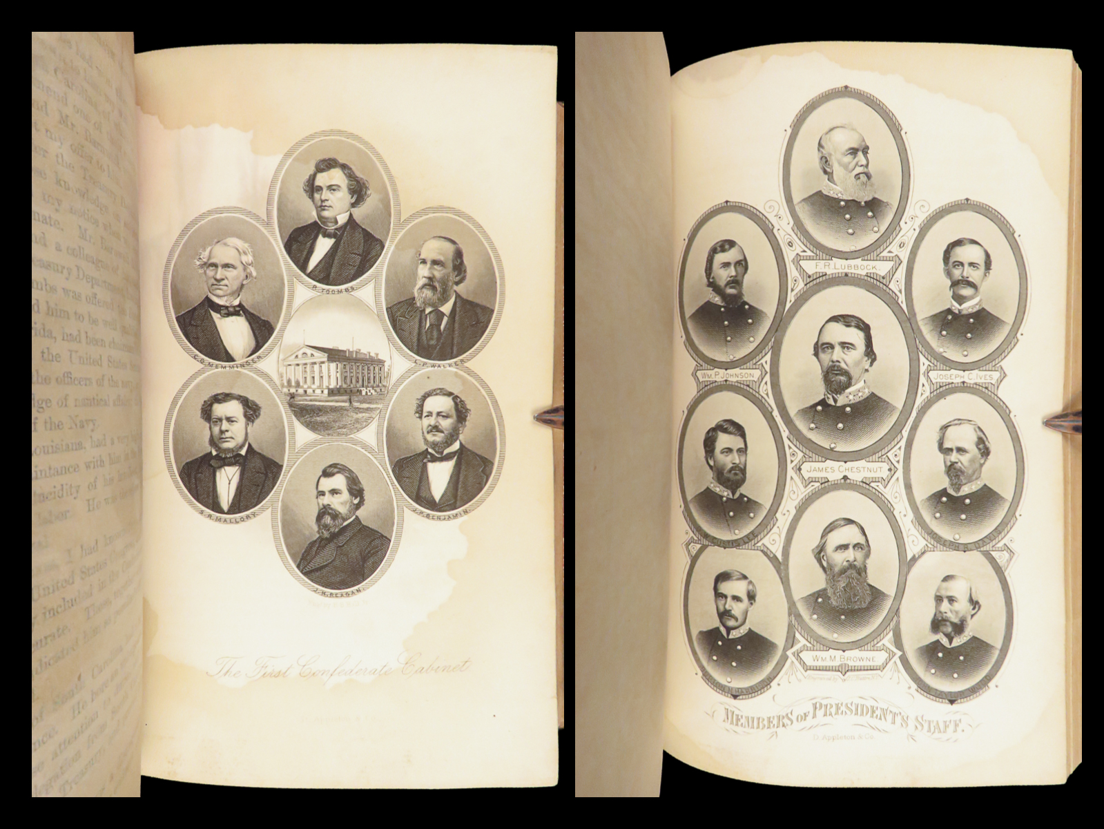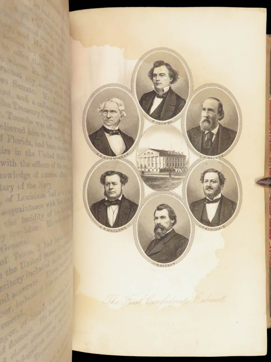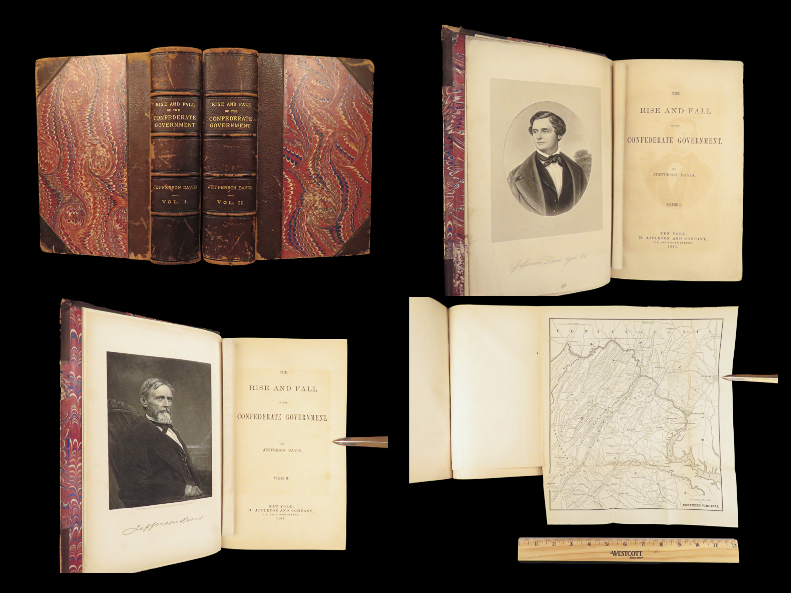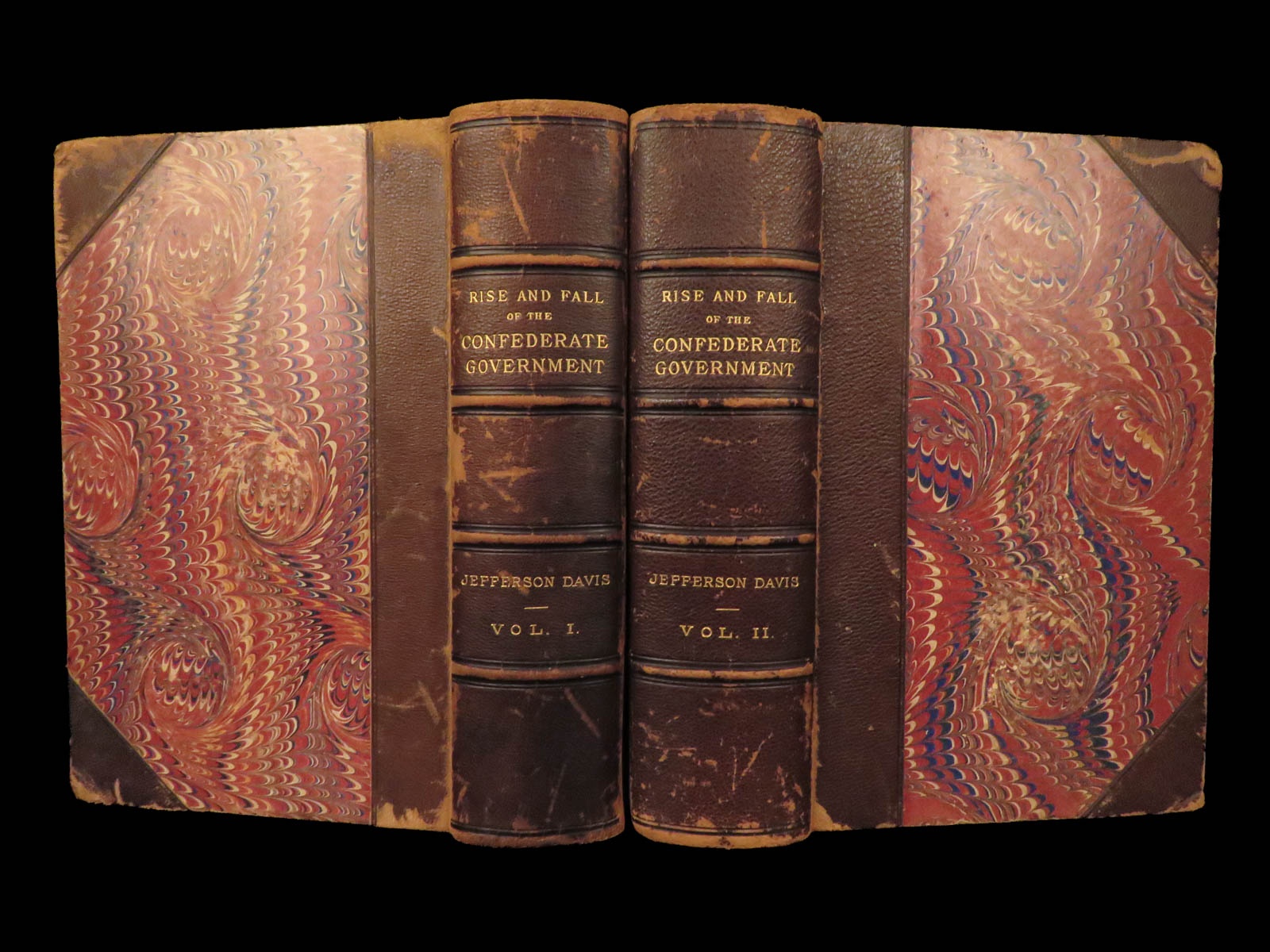 First edition of The Rise and Fall of the Confederate Government (1881) by Jefferson Davis. Complete two-volume set in original cloth with all maps and engravings.