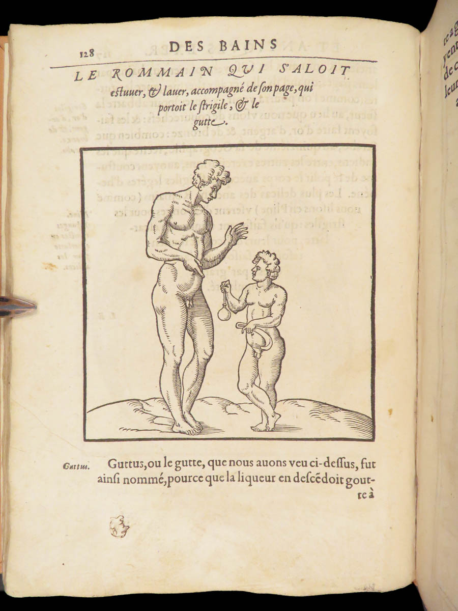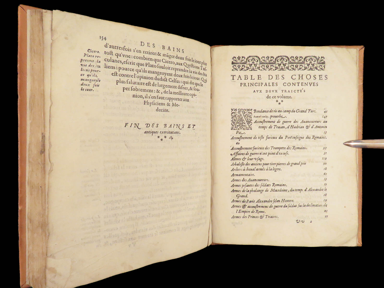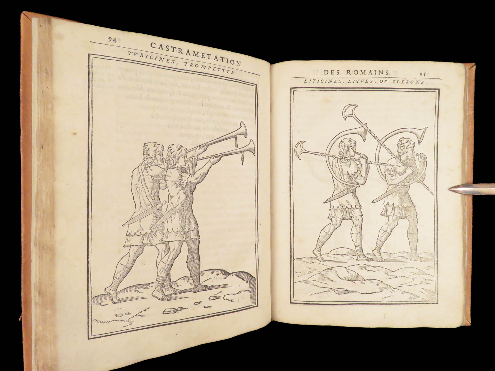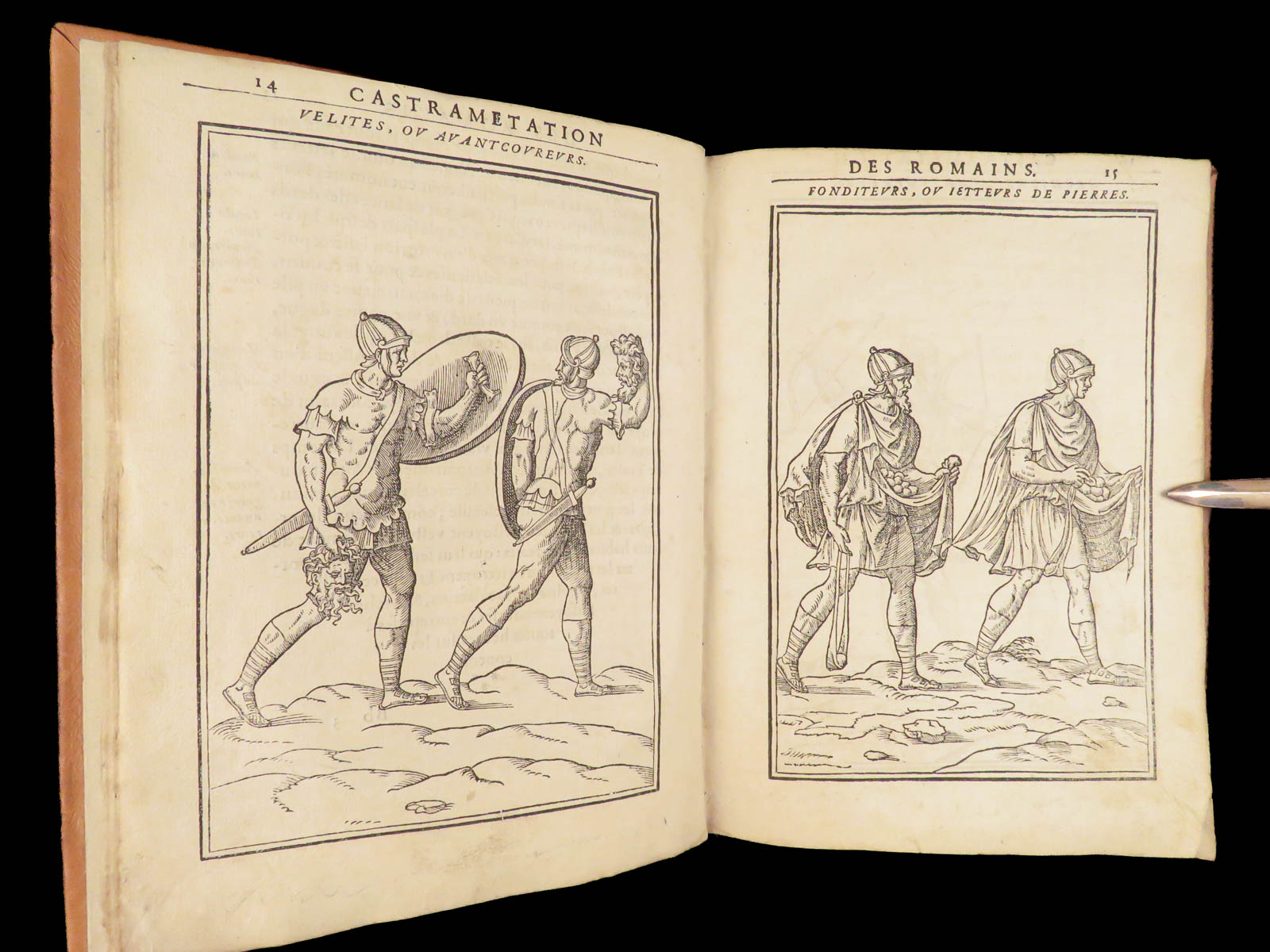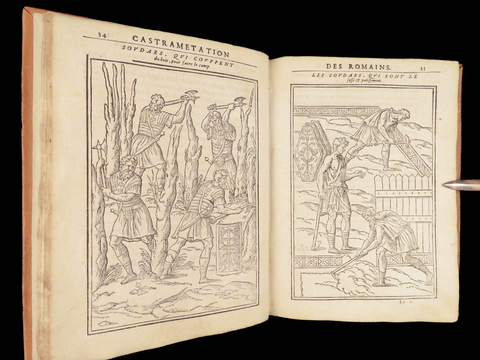 Discours de la religion des anciens Romains, de la castrametation & discipline militaire d’iceux by Guillaume Du Choul is a 16th-century survey of ancient Roman military camps and Greco-Roman baths. This book became one of the most valuable references to understanding classical antiquity. This 1581 edition of Discipline is notable for including 42 full-page engravings depicting military scenes, soldiers and cavalry, Turkish bards and sultans, and a large folding chart.