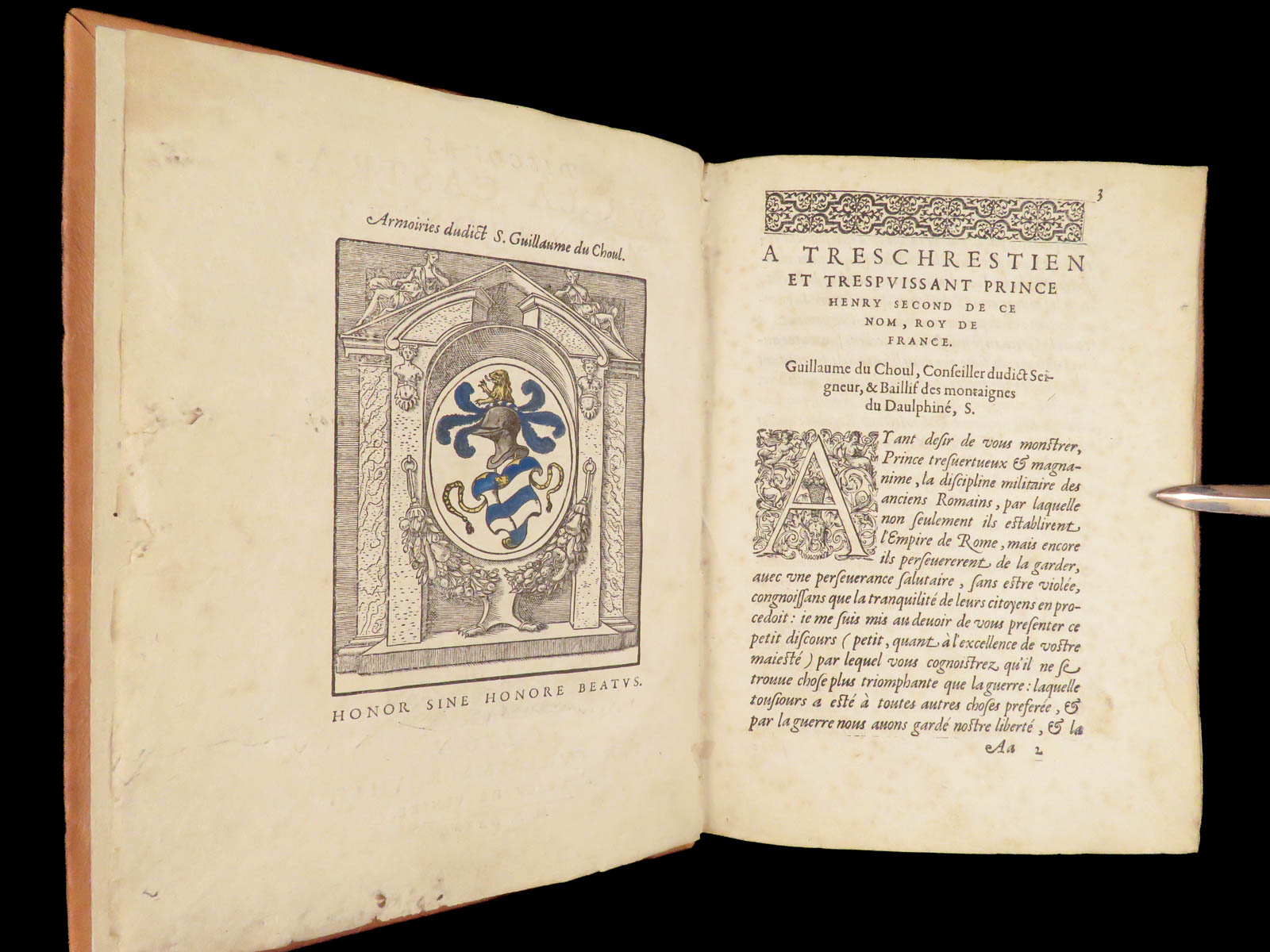 Guillaume Du Choul’s 1581 Venetian edition studies Roman military camp design and Greco-Roman baths, illustrated with 42 engravings and a folding map, plus Sansovino’s Turkish supplement.