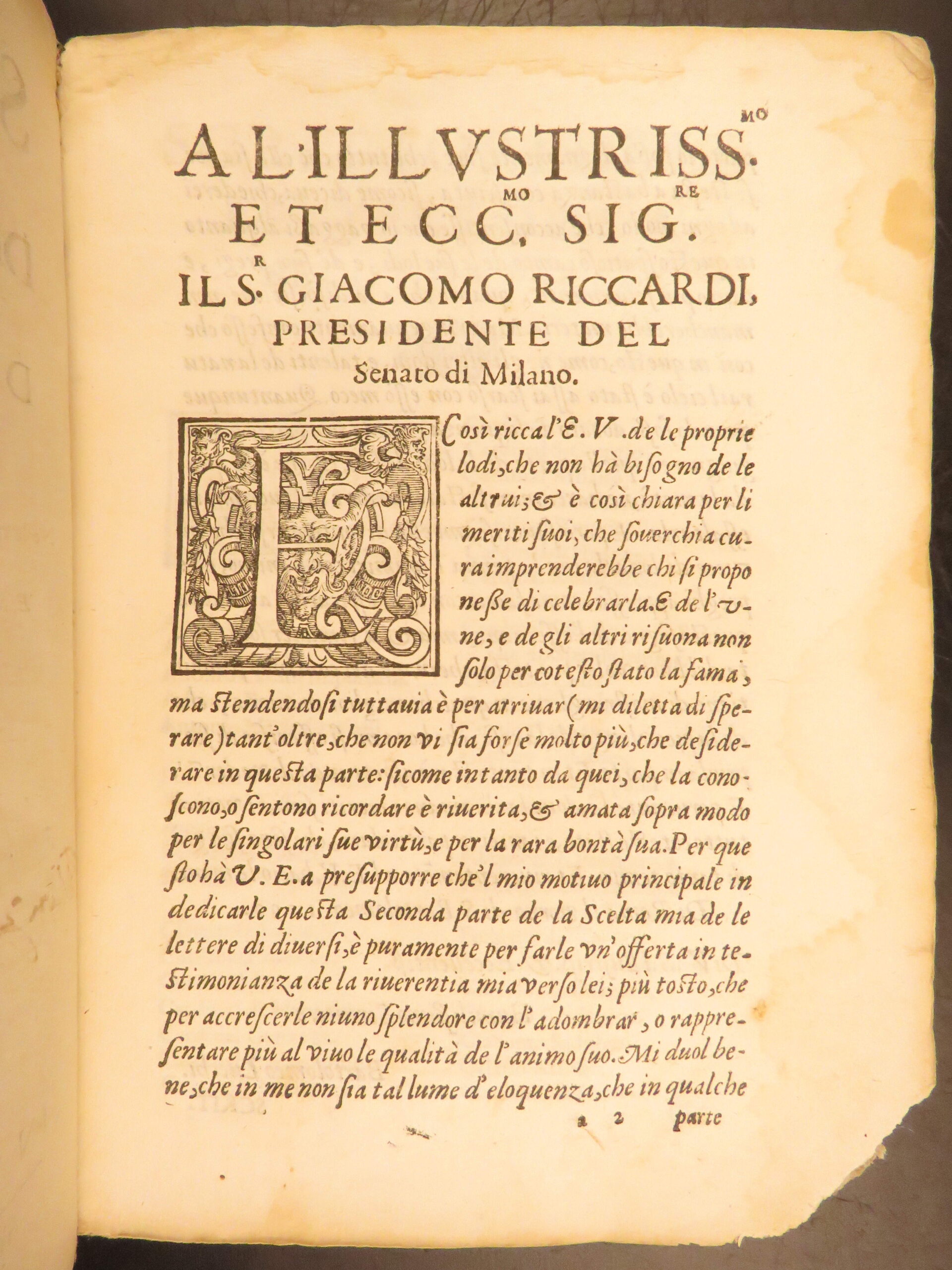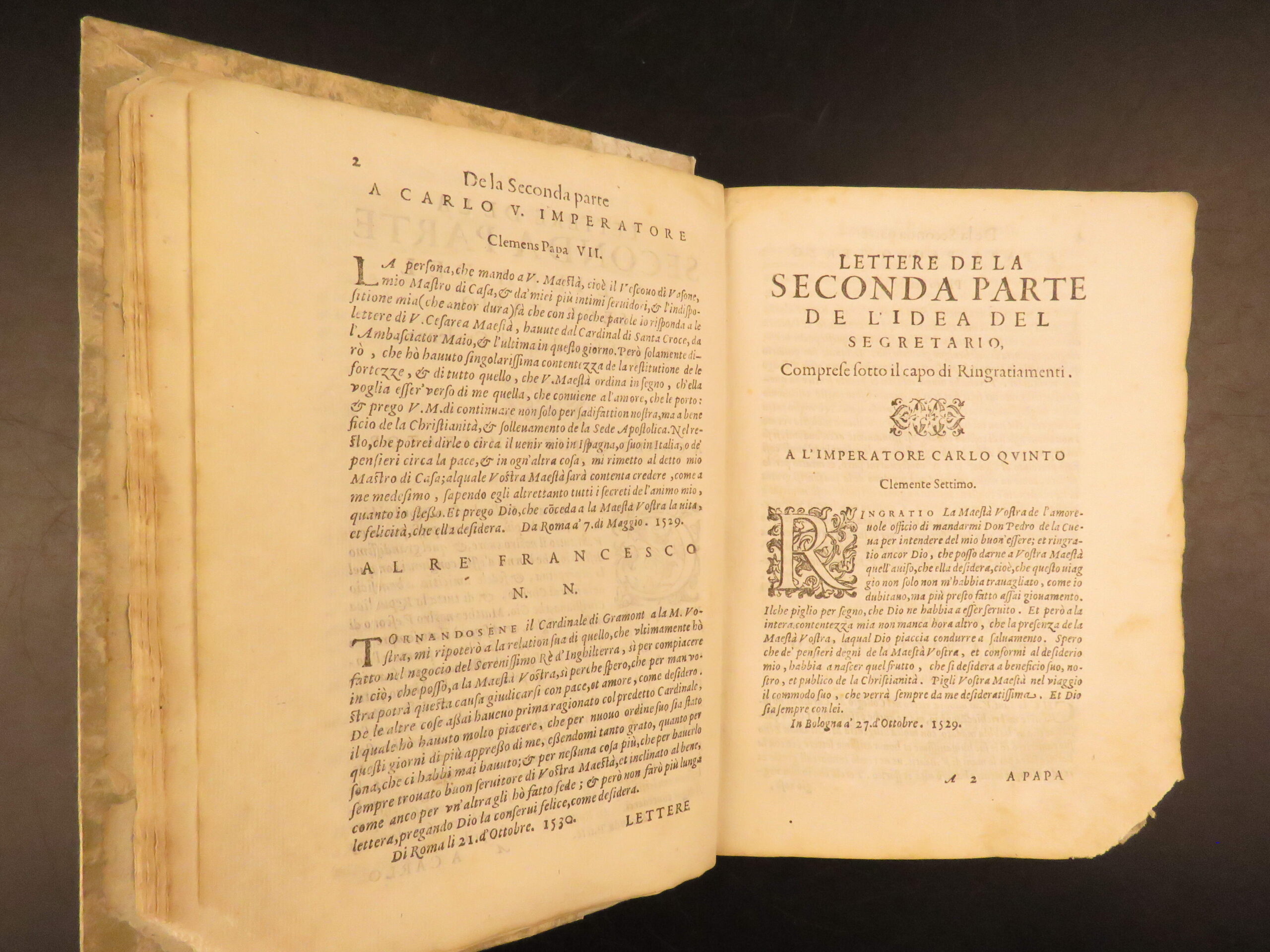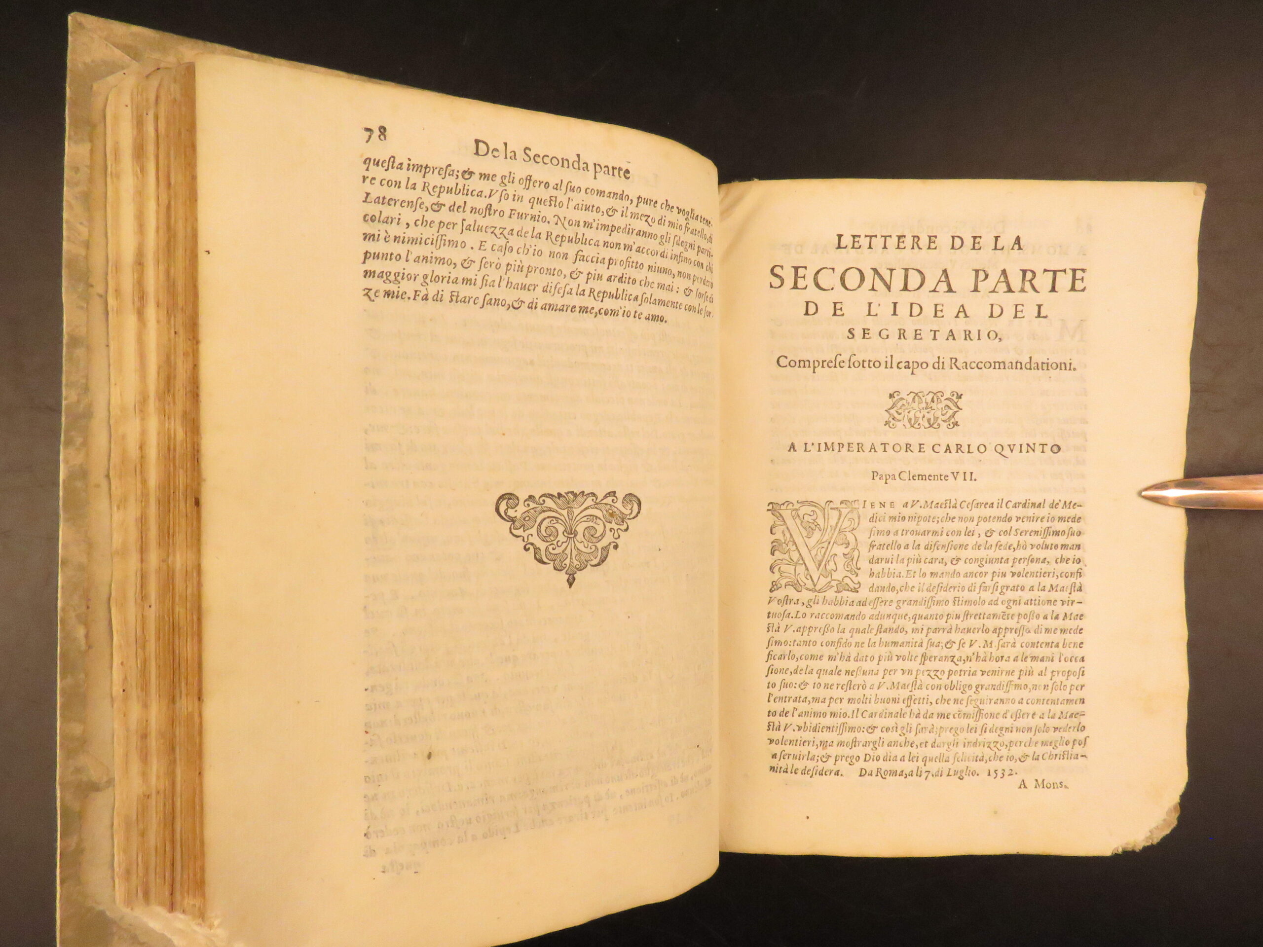 Scelta di lettere di diuersi eccellentiss is a fascinating 1595 collection of Italian letters by some of the most imminent and famous Italian Renaissance figures. This second part of a larger work includes letters from notable names such as Annibal Caro, Aldo Manuzio, Paolo Manuzio, Baldassarre Castiglione, and Pietro Bembo, as well as writings from authors Giovanni Boccaccio (Decameron) and Torquato Tasso (Jerusalem Delivered).