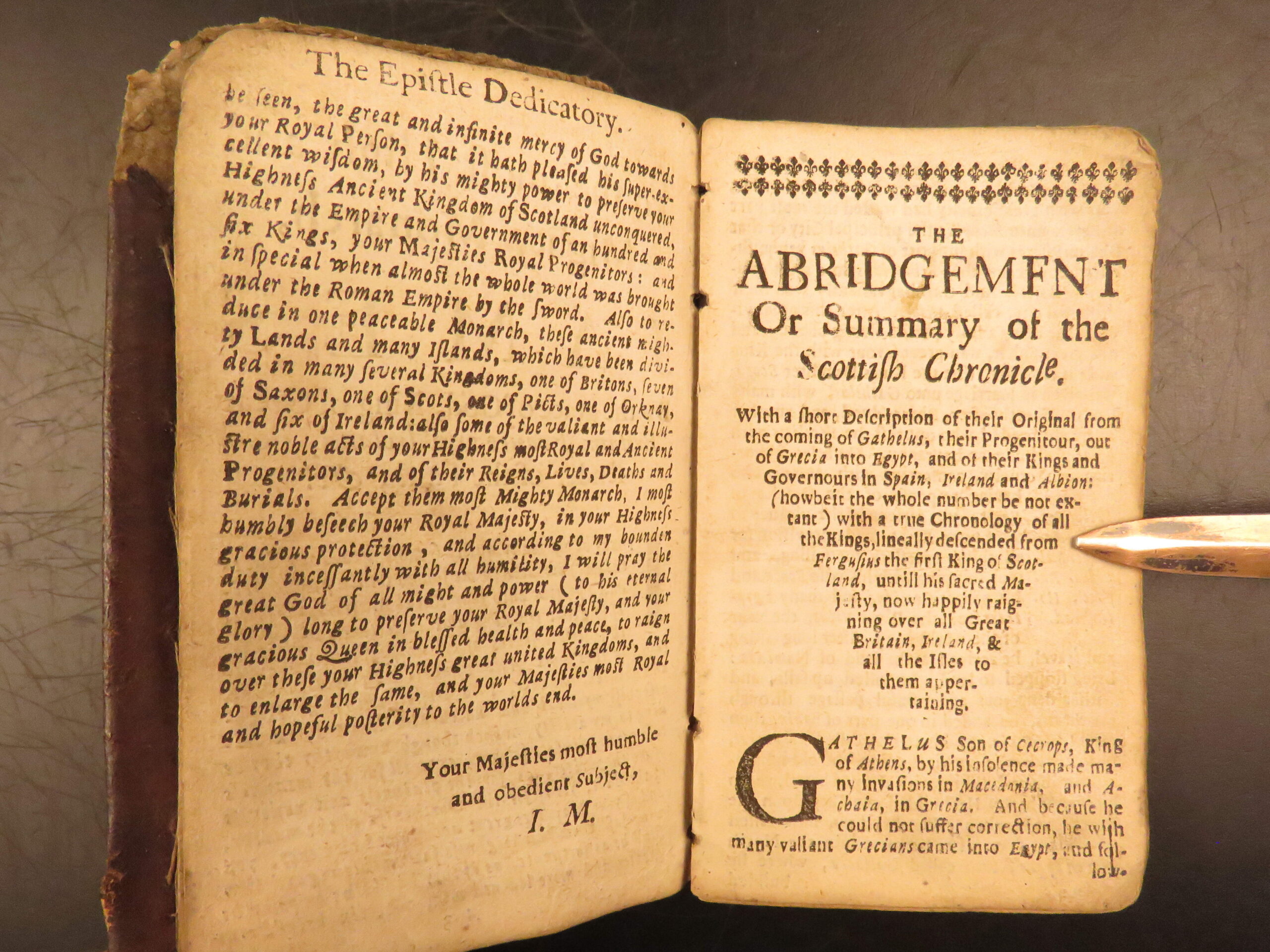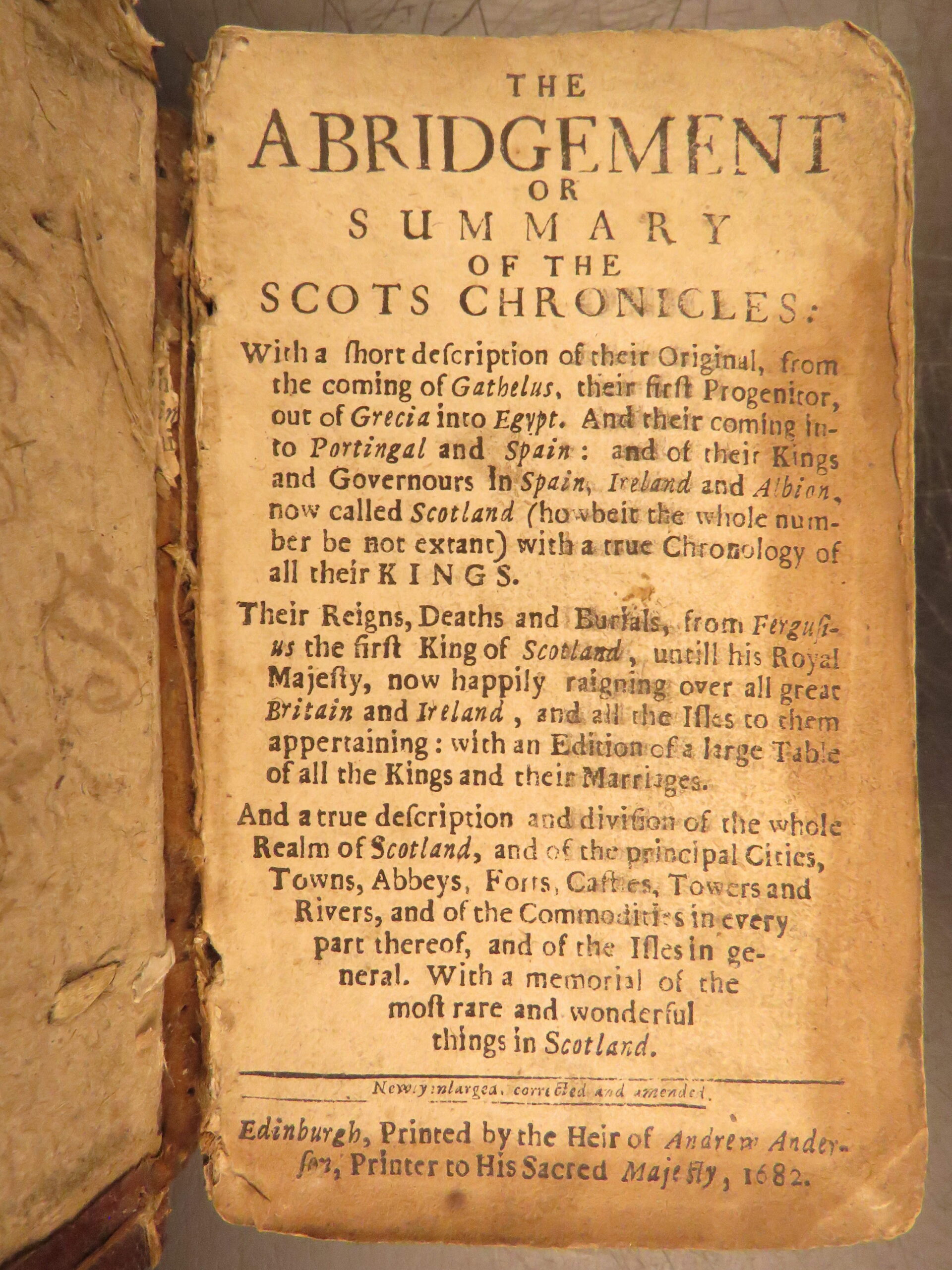 John Monipennie’s The Abridgement or Summary of the Scots Chronicles (1682) is a condensed history of Scotland, printed in Edinburgh. This volume traces the lineage of Scottish rulers from early legendary figures through medieval monarchs, blending historical narrative with traditional accounts linked to classical antiquity.