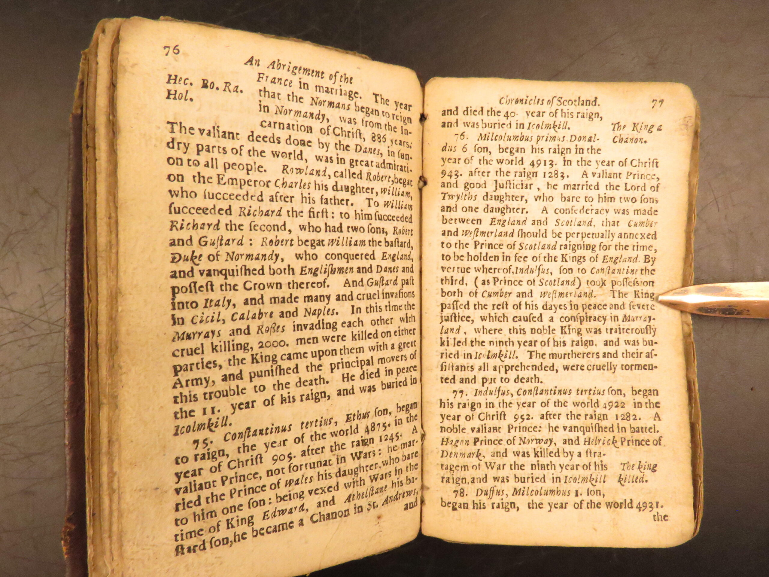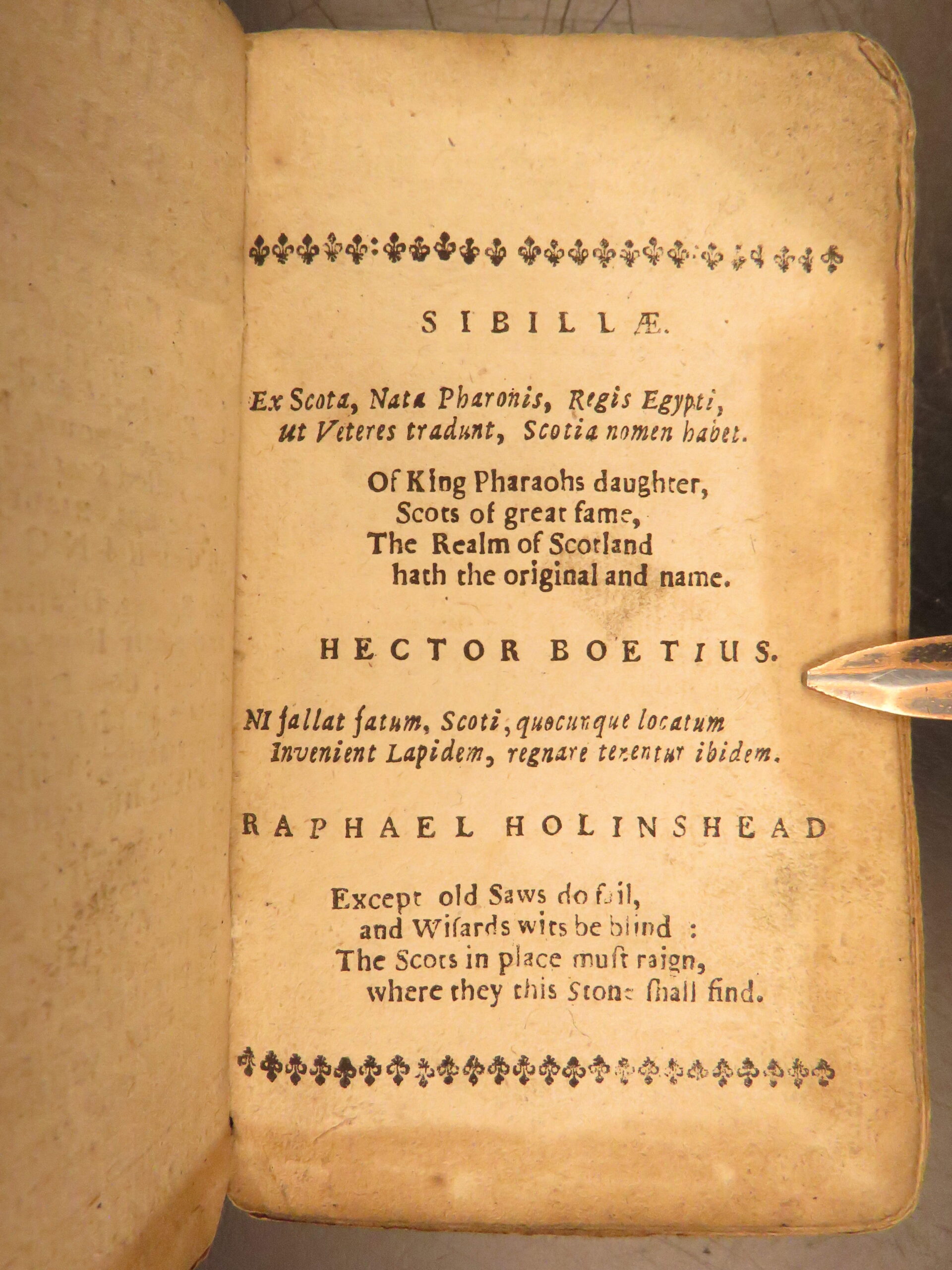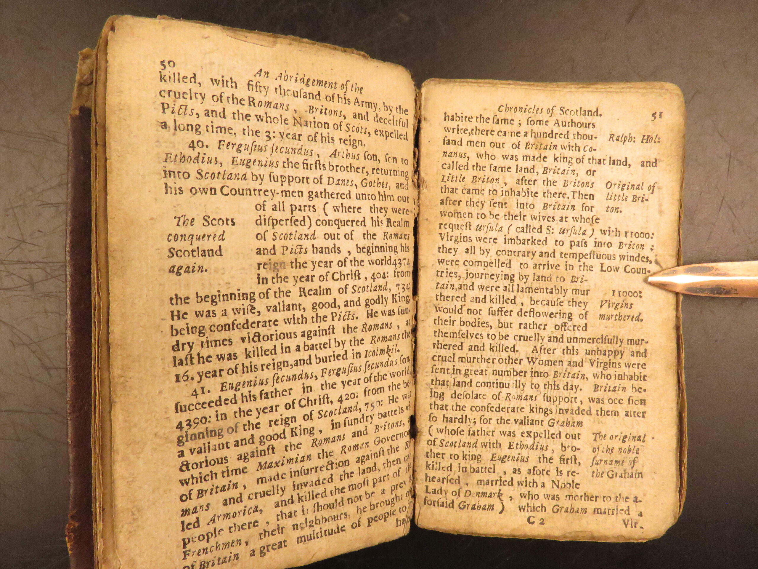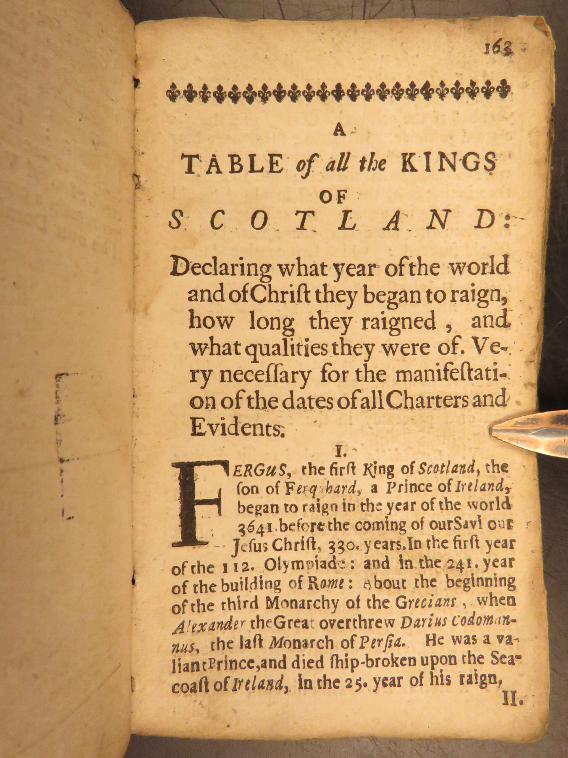 The text includes references to figures such as Fergus, Kenneth MacAlpin, Malcolm III, and James I, alongside accounts of William Wallace and Robert the Bruce during periods of conflict with England. Additional references connect Scotland’s past to broader historical traditions involving Rome and Greece, with mentions of Alexander the Great and Darius III. A chronological table of Scottish kings is included, offering a structured overview of succession. Works of this type circulated widely in the seventeenth century, reflecting continued interest in national identity and royal lineage.