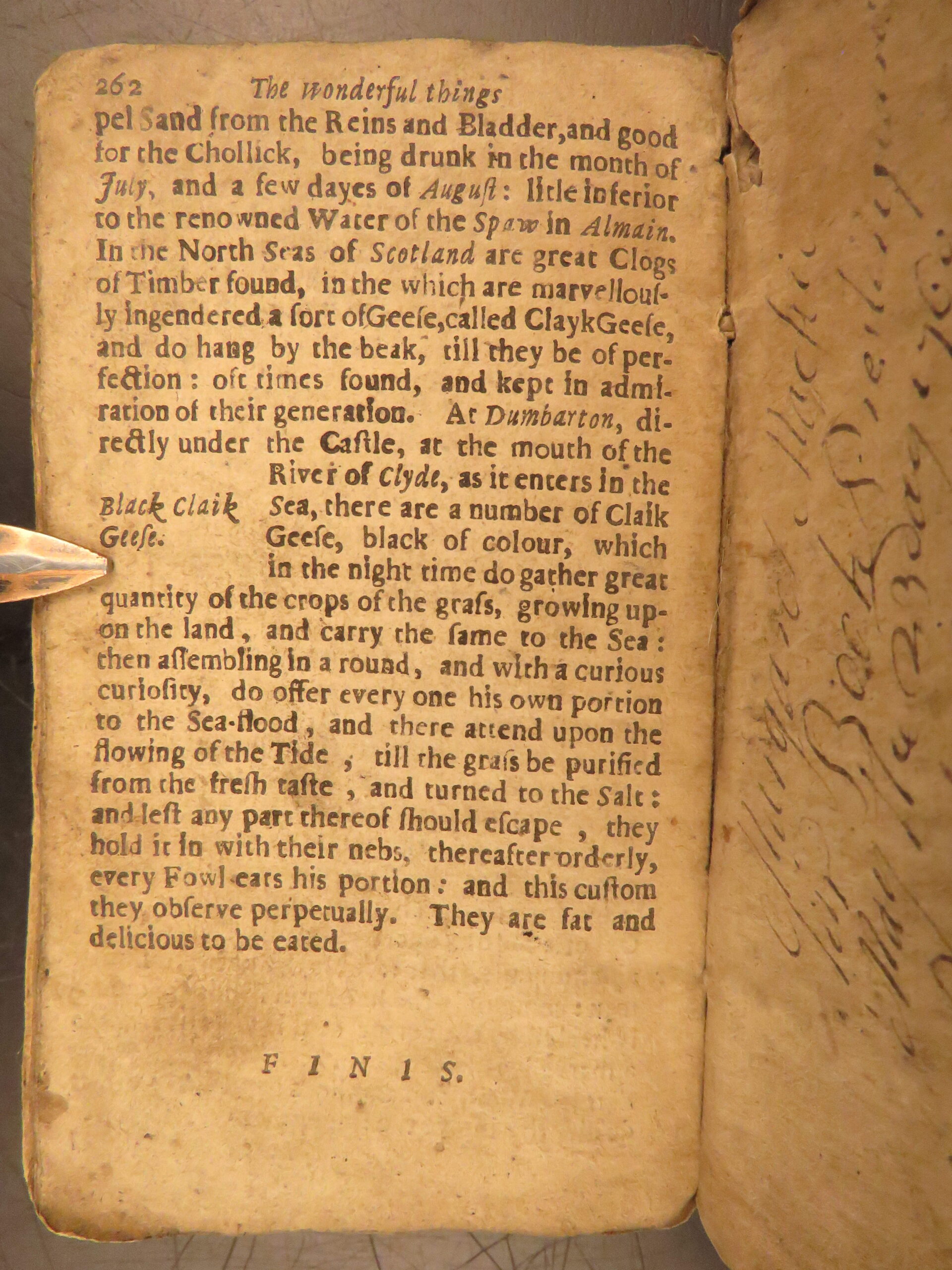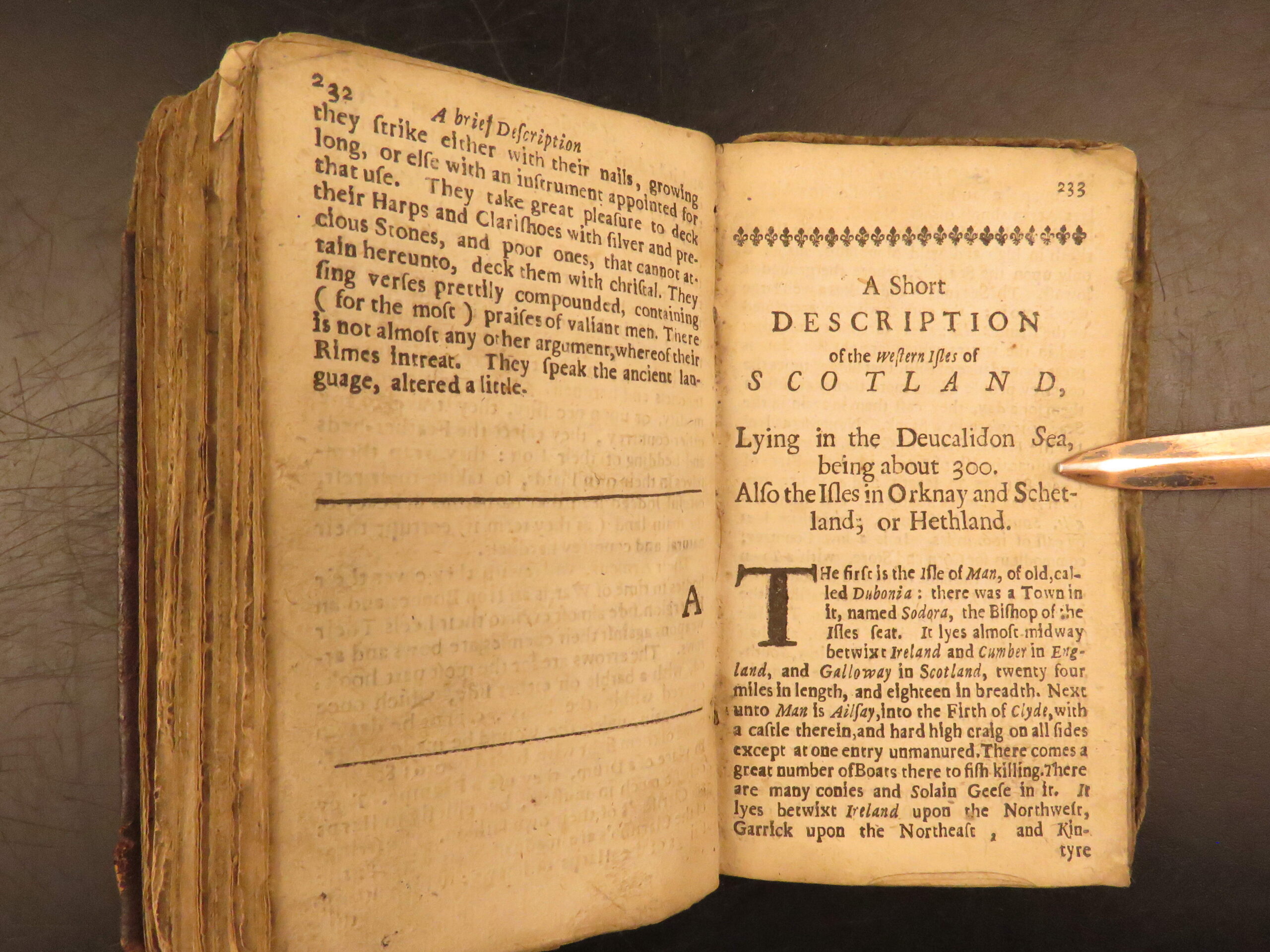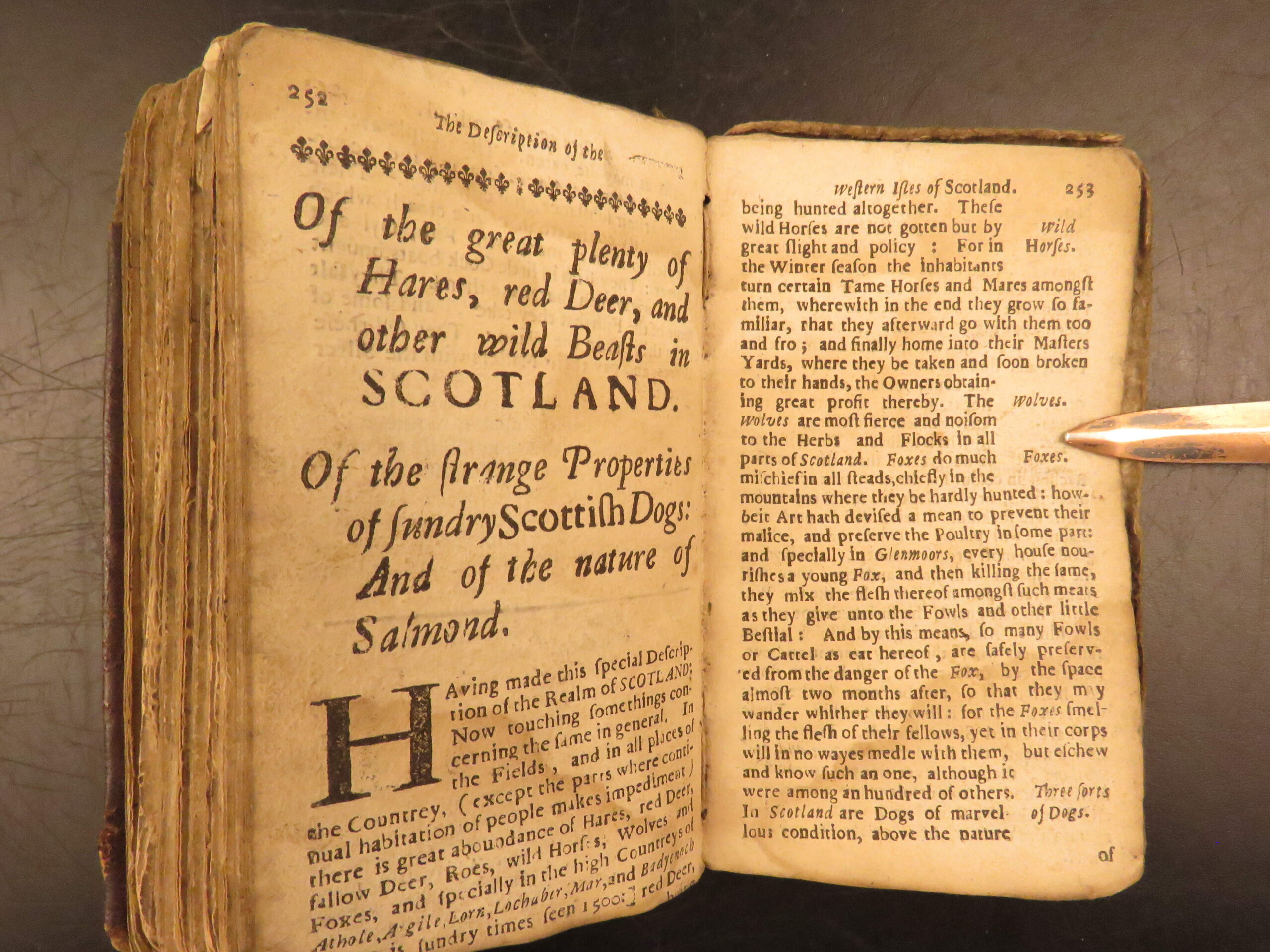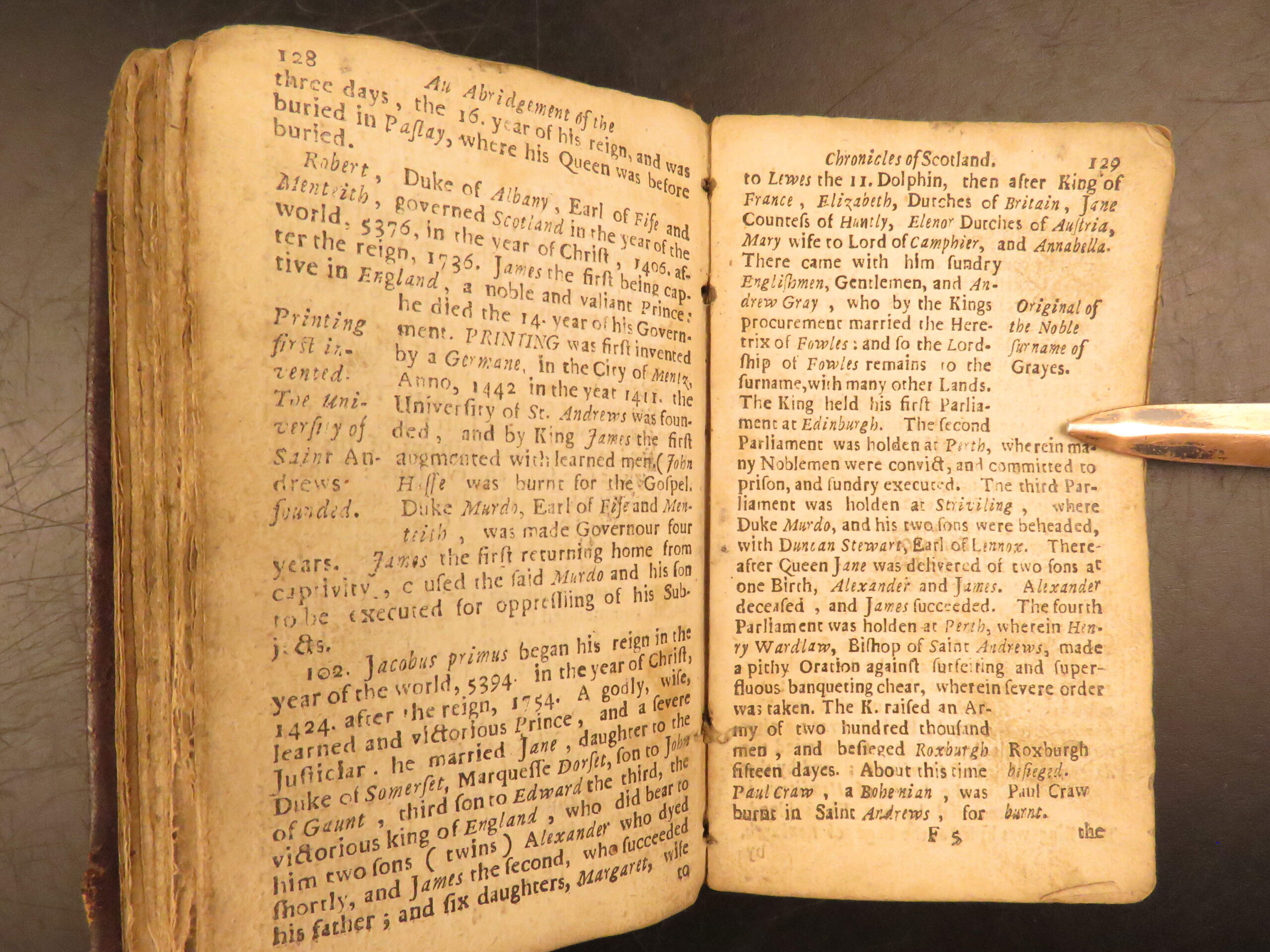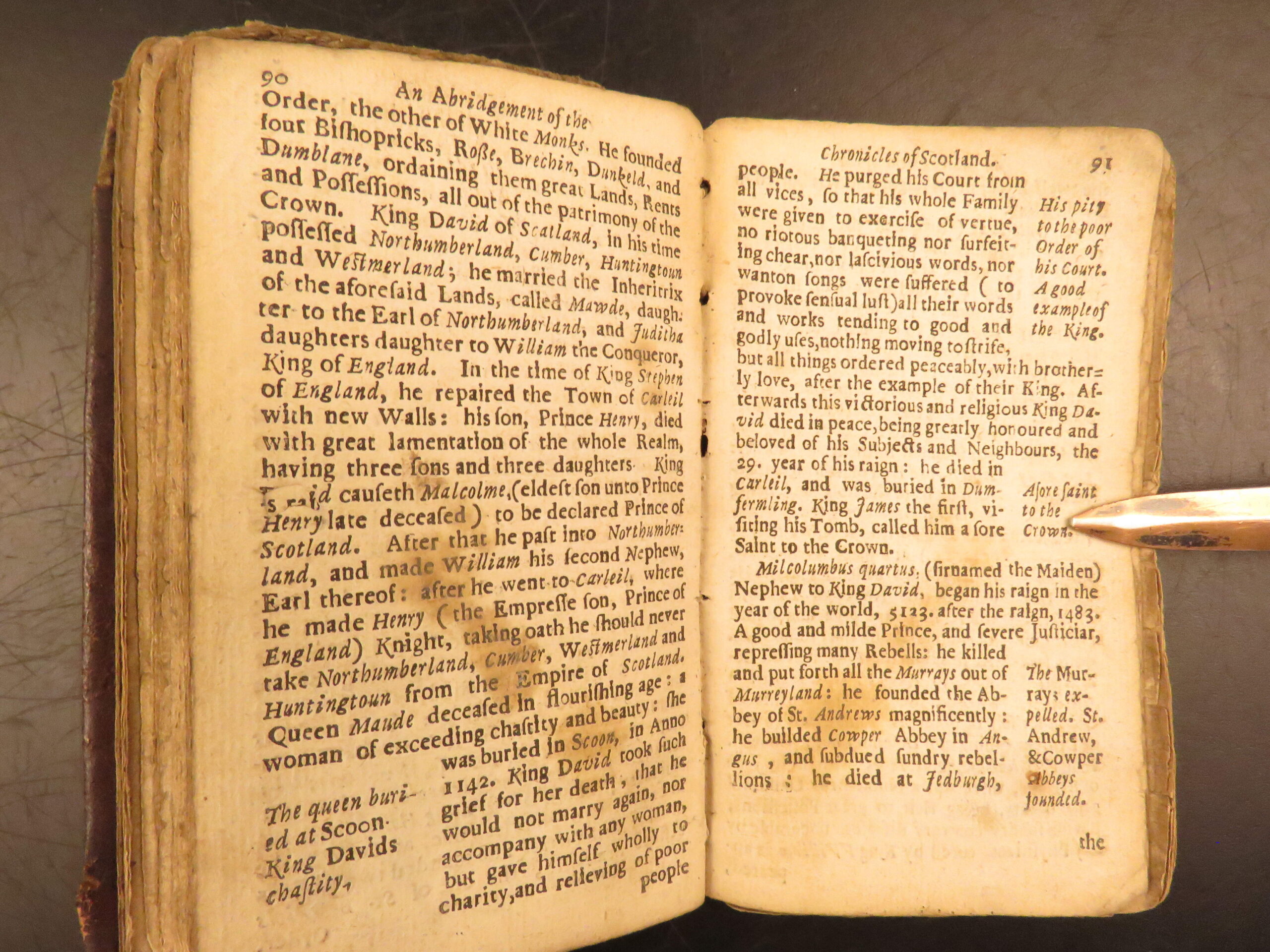 The text includes references to figures such as Fergus, Kenneth MacAlpin, Malcolm III, and James I, alongside accounts of William Wallace and Robert the Bruce during periods of conflict with England. Additional references connect Scotland’s past to broader historical traditions involving Rome and Greece, with mentions of Alexander the Great and Darius III. A chronological table of Scottish kings is included, offering a structured overview of succession. Works of this type circulated widely in the seventeenth century, reflecting continued interest in national identity and royal lineage.